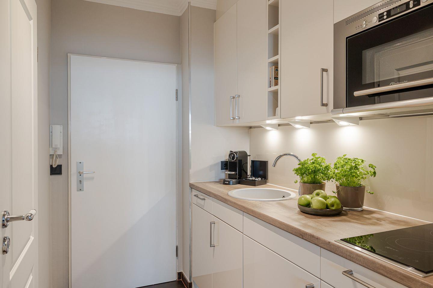 Die moderne Küchenzeile ist mit allem ausgestattet, was Sie für eine gelungene Selbstverpflegung benötigen: 2-Platten-Herd, Mikrowelle, Geschirrspüler, Filter- und Nespresso-Kaffeemaschine.