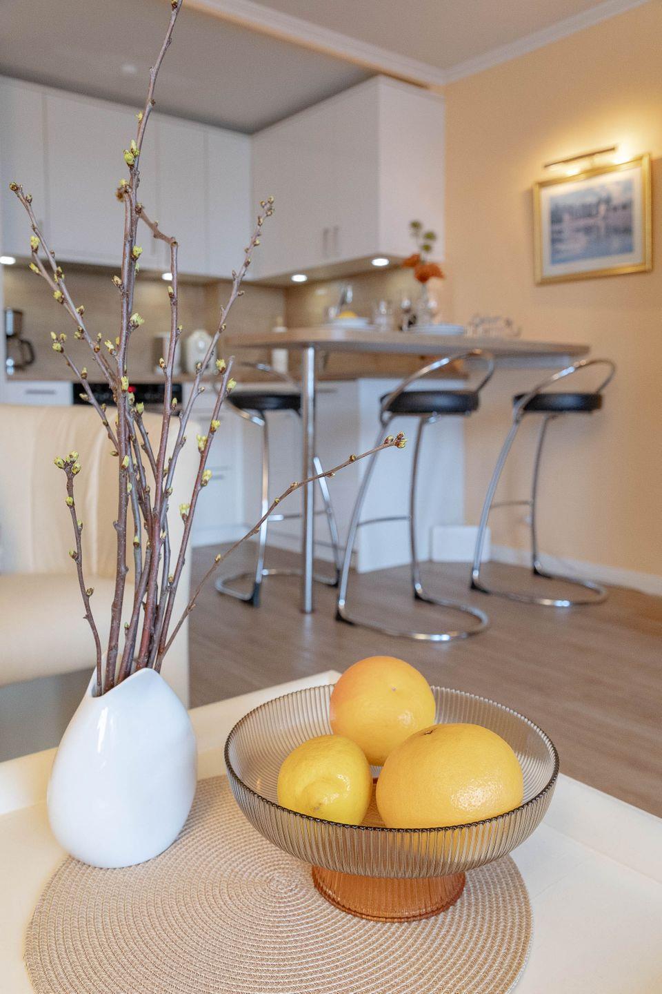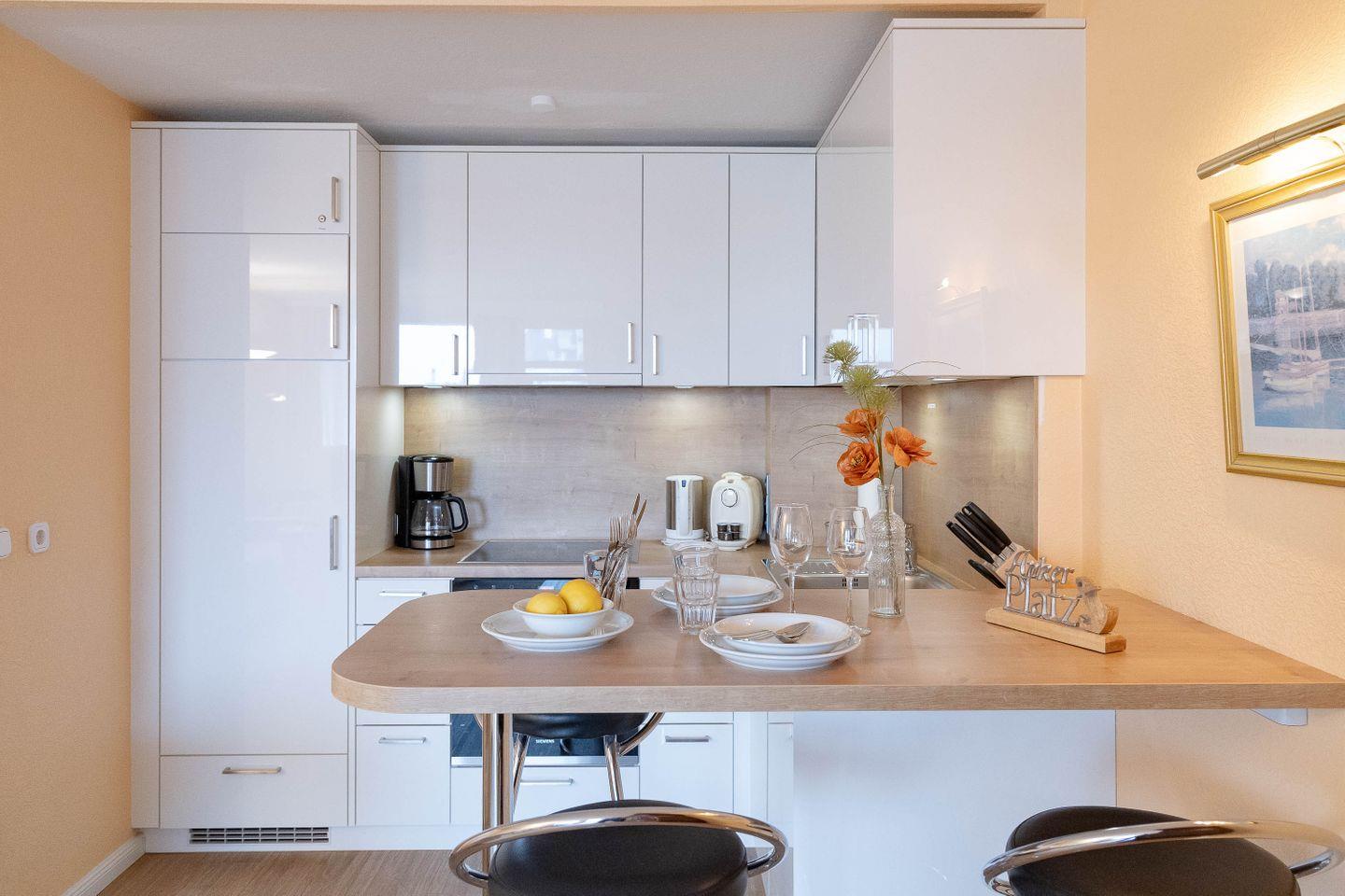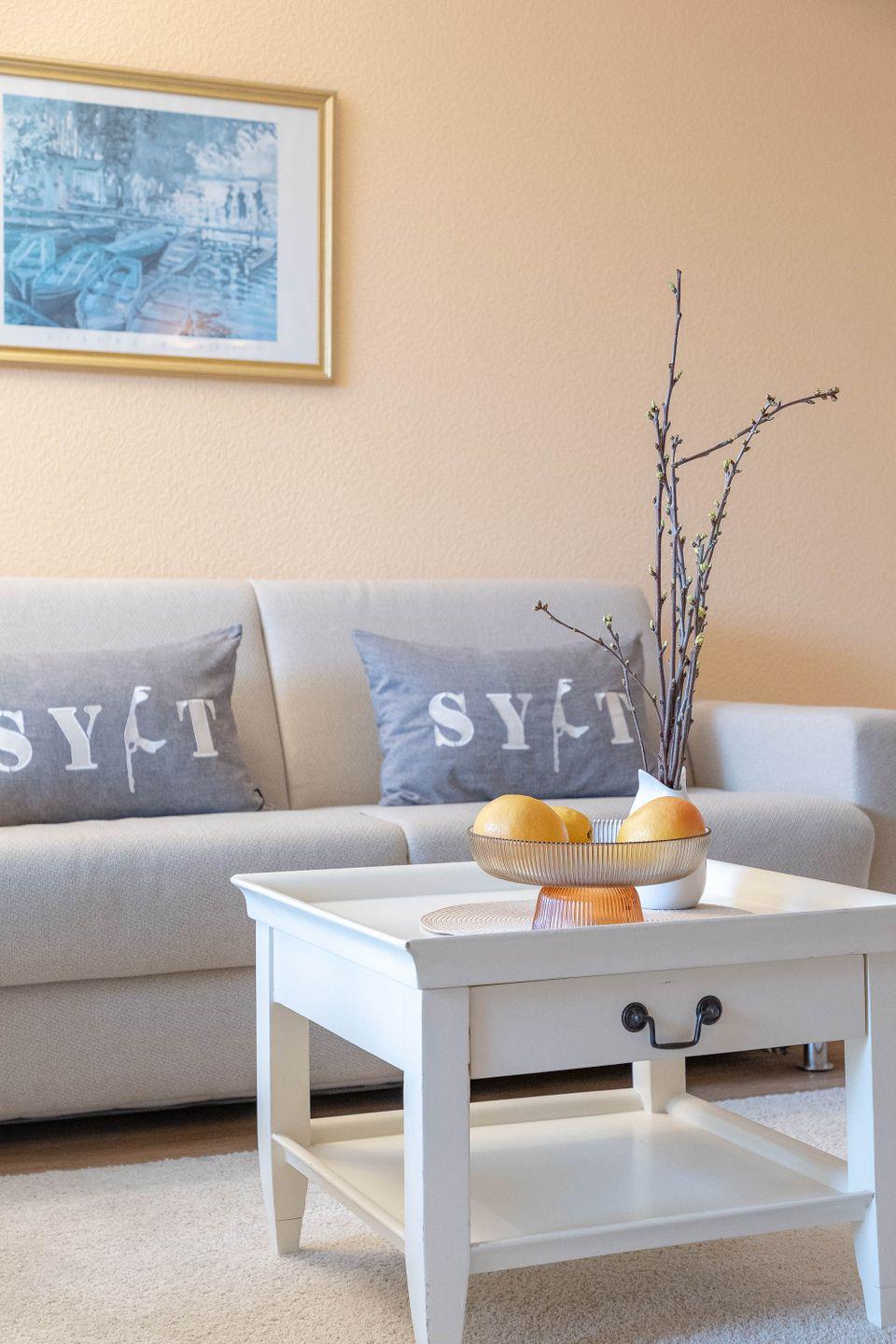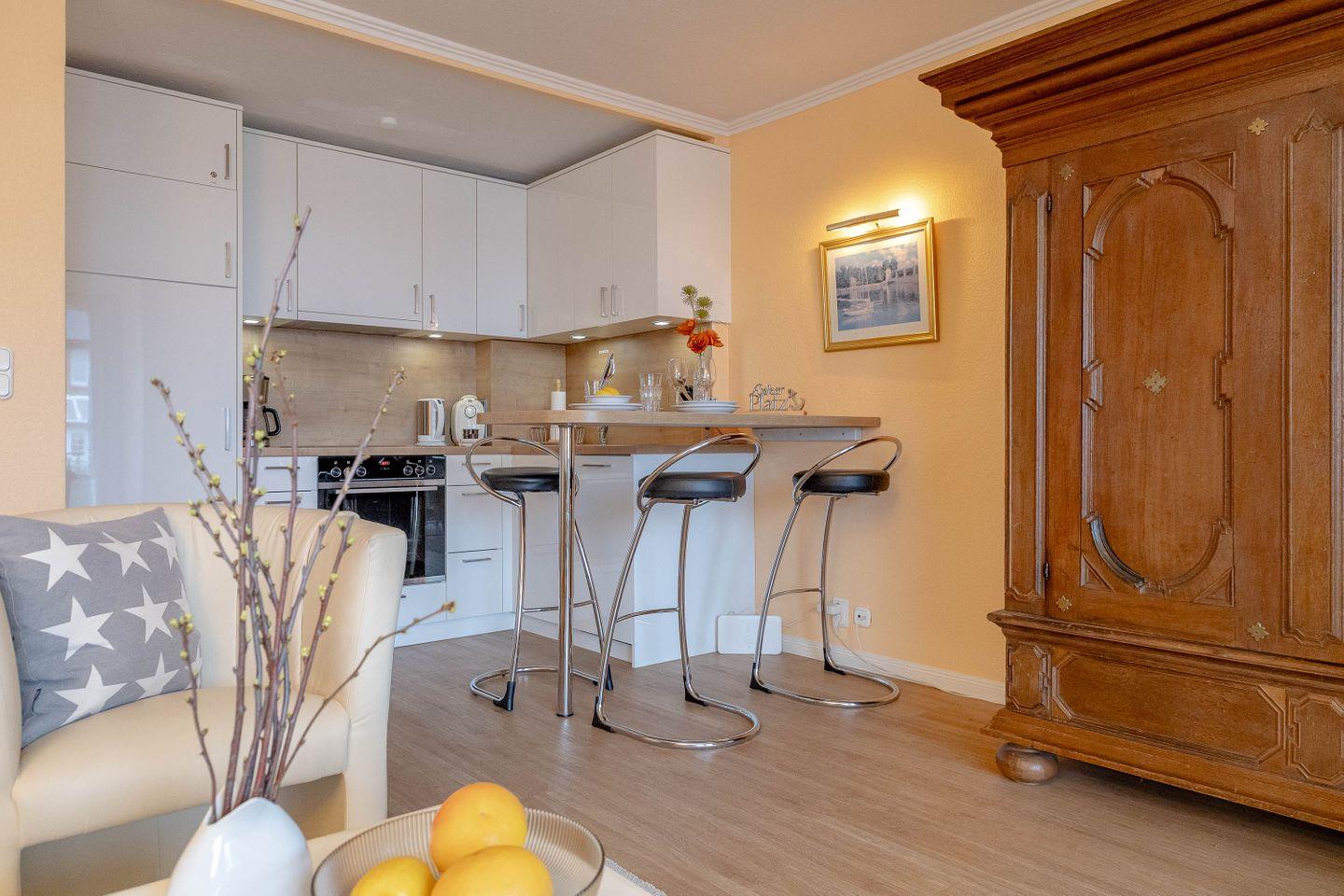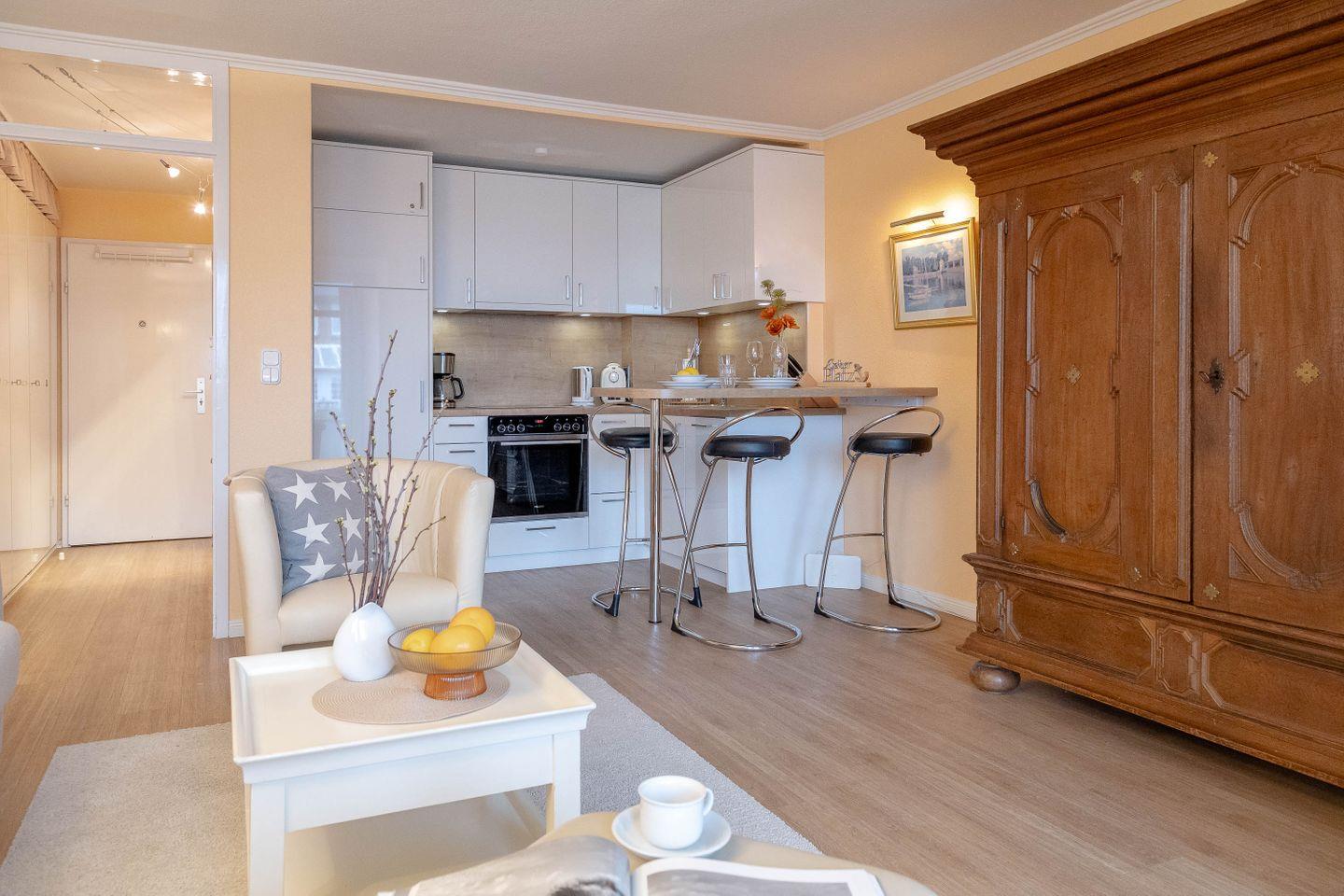 Dieses helle und stimmige 2-Zimmer-Apartment (EG, stufenloser Zugang, ca. 43 m²) im Haus Käpt`n-Christiansen 30 bietet Ihnen ausreichend Platz und Komfort. Die helle, freundliche Wohnung verfügt über ein großzügiges Wohnzimmer, ausgestattet mit einer gemütlichen Sitzgarnitur mit angrenzendem Essbereich und einer gut ausgestatteten Einbauküche (Mikrowelle, Kaffeemaschine, Wasserkocher, sowie ein Toaster). Die Wohnung hat ein großes Duschbad und ein separates Schlafzimmer mit einem 1,40 x 2,00 Meter Doppelbett. Eine dritte Schlafgelegenheit bietet das große, neue, hochwertige und einfach herzurichtende Schlafsofa im Wohnbereich (für 3. Person 10 € Zuschlag pro Tag). Alt und neu sind hier geschmackvoll miteinander kombiniert: Während im antiken Schrank der große Flat-TV mit Netflix-Funktion und die Gartenpolster sowie das Bettzeug für die dritte Person untergebracht sind, ist der Fußboden komplett mit Designboden ausgelegt. WLAN-Anschluss und Radio bieten weitere Möglichkeiten in die Medienwelt.