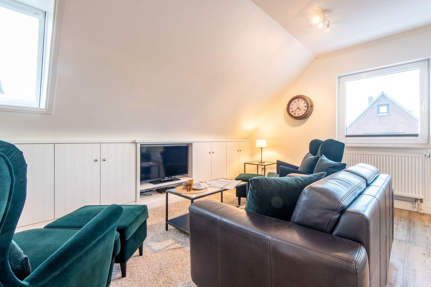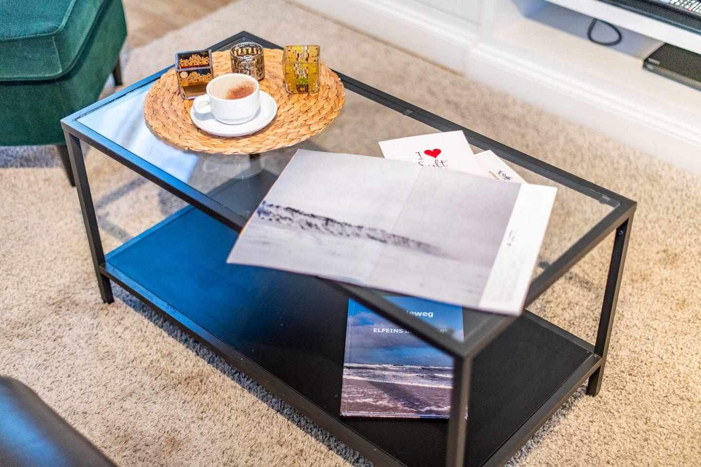Der großzügige Wohnbereich ist mit einem modernen Sofa und einem TV ausgestattet, ideal für gemütliche Abende nach einem Tag am Strand. Der angrenzende Essbereich bietet ausreichend Platz für zwei Personen. Ein besonderes Highlight der Wohnung ist die sonnige Terrasse mit einem Strandkorb, auf der Sie die frische Nordseeluft genießen können.