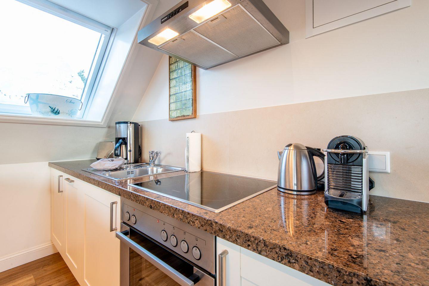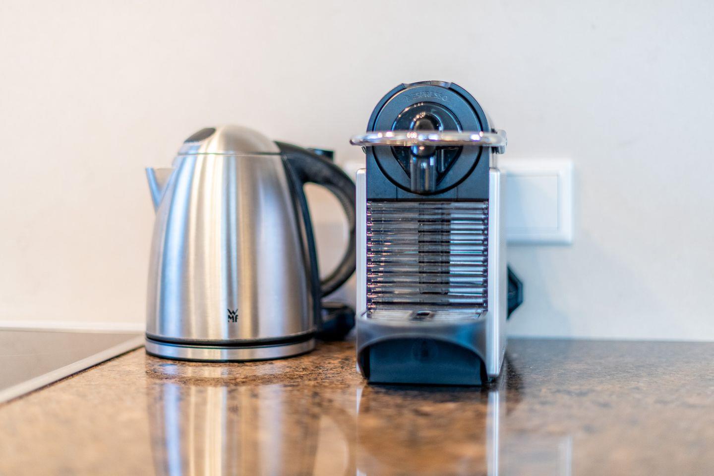 Die offene Einbauküche ist mit modernen Geräten ausgestattet, darunter ein Geschirrspüler, eine Mikrowelle und eine Nespresso-Maschine. Hier finden Sie alles, was Sie für die Zubereitung Ihrer Lieblingsgerichte benötigen.