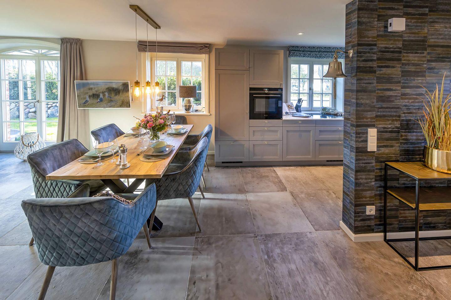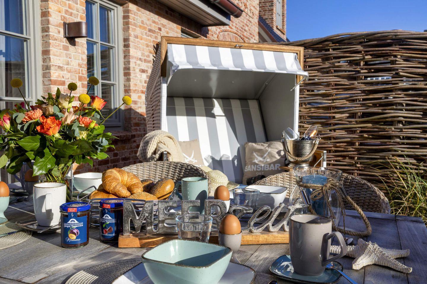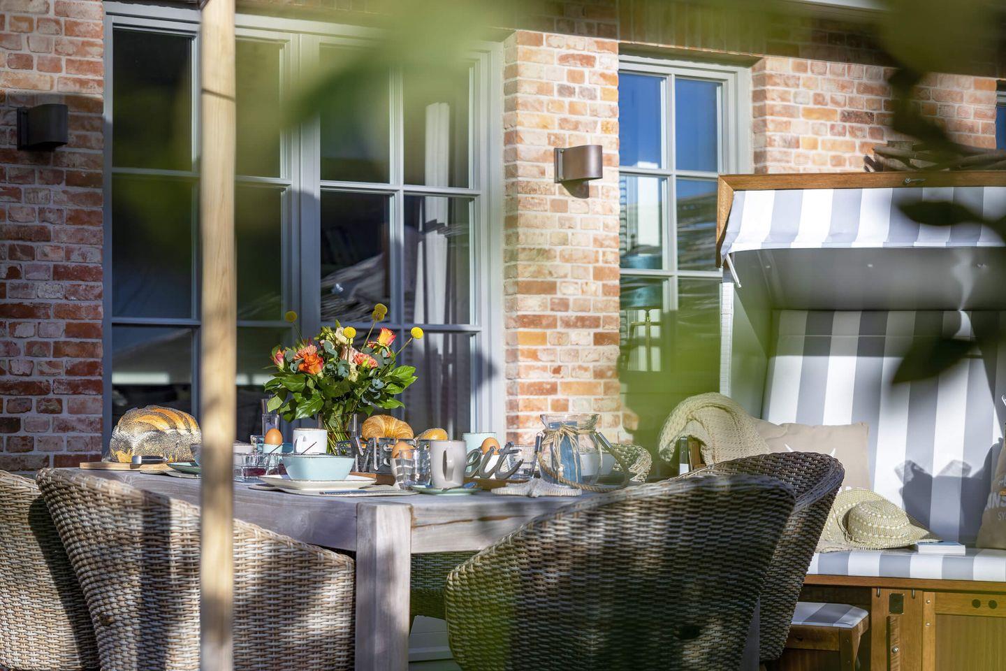 Schmuckes Mauerwerk aus Antik-Klinker, edle Holzböden und Schreinereinbauten, Ausstattung und Interieur auf höchstem Niveau. Drinnen wie draußen ist dieses Hausteil in Westerland eine Hommage an individuelles Handwerk, guten Geschmack und Lebensart und Details wie die Fass-Sauna im Garten machen das Ferienglück perfekt.