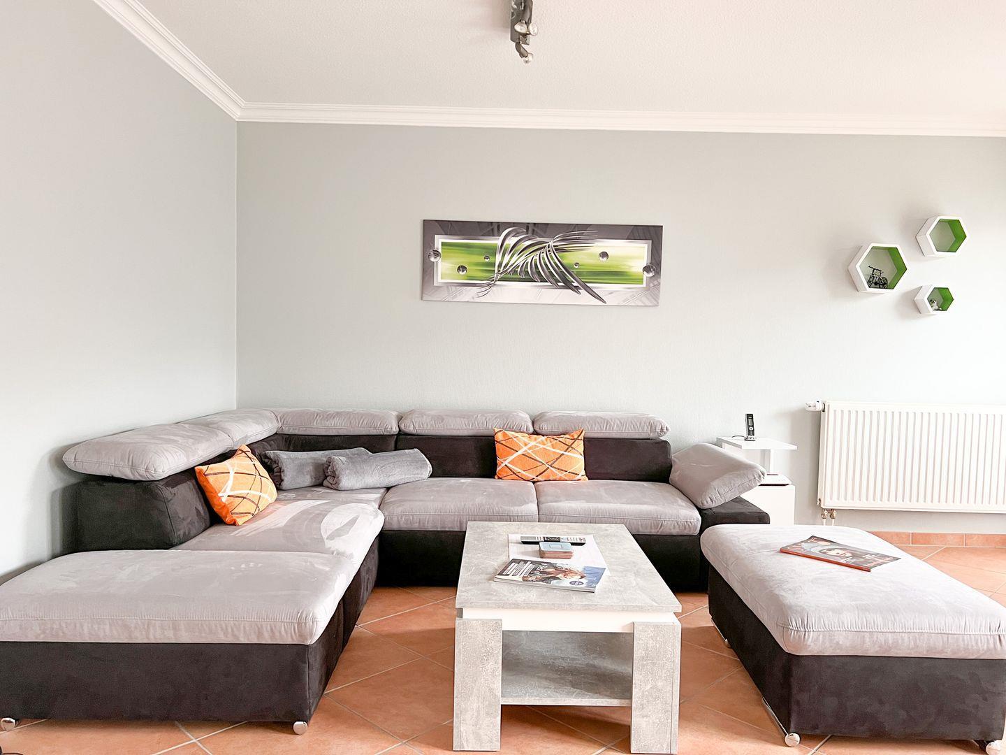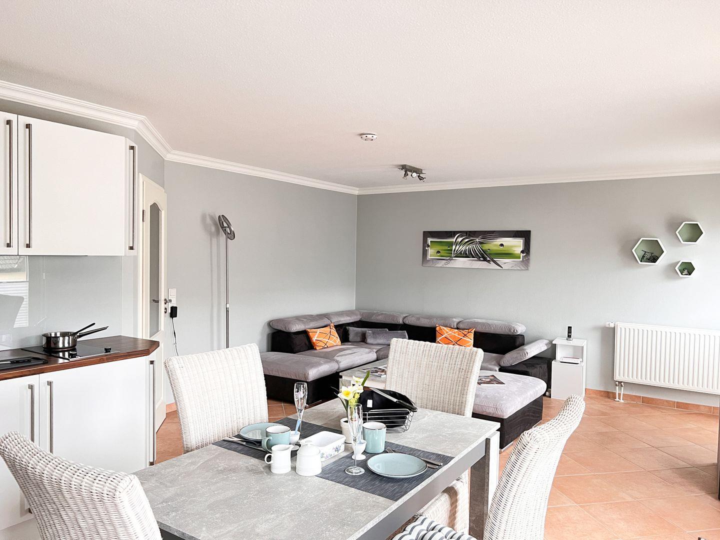 Beim Betreten der Wohnung empfängt Sie ein freundlicher und einladender Eingangsbereich, der in das helle Wohnzimmer mit Sofaecke führt, wo Sie entspannte Stunden verbringen können. Für Ihre Unterhaltung stehen Ihnen zwei moderne Fernseher zur Verfügung. Die offene Küche ist vollständig ausgestattet mit einem 2-Platten-Herd, Kühlschrank, Geschirrspüler, Kaffeemaschine, Toaster und Wasserkocher. Hier können Sie sich kulinarische Köstlichkeiten zubereiten und am Esstisch gemeinsam genießen.