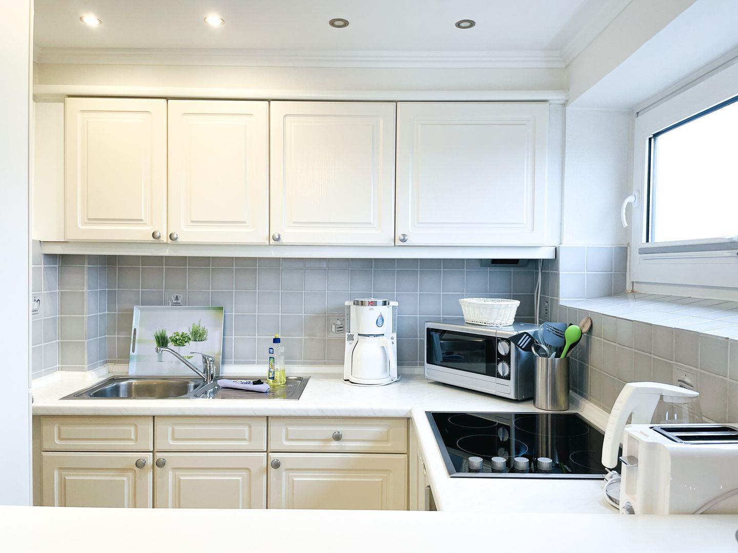 Die Ausstattung der Sylter Residenz lässt keine Wünsche offen. In der vollausgestatteten Küche finden Sie alles, was Sie für Ihre Selbstversorgung benötigen: Kühlschrank, Herd mit Ceranfeld, Geschirrspüler, Mikrowelle, Toaster, Kaffee- und Wasserkocher sowie zahlreiche Küchenutensilien. Der Esstisch lädt zu geselligen Mahlzeiten ein, während das moderne Wohn- und Schlafbereich mit einem bequemen Sofa und einem TV-Gerät ausgestattet ist, damit Sie sich nach einem aufregenden Tag entspannen können.