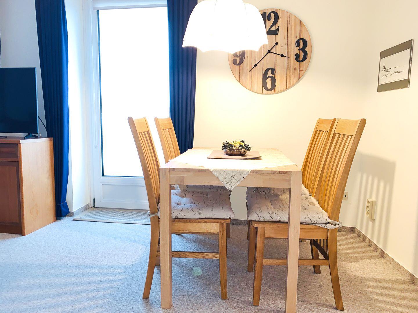 Couchgarnitur, einem Essplatz für 4 Personen sowie einem aufklappbaren