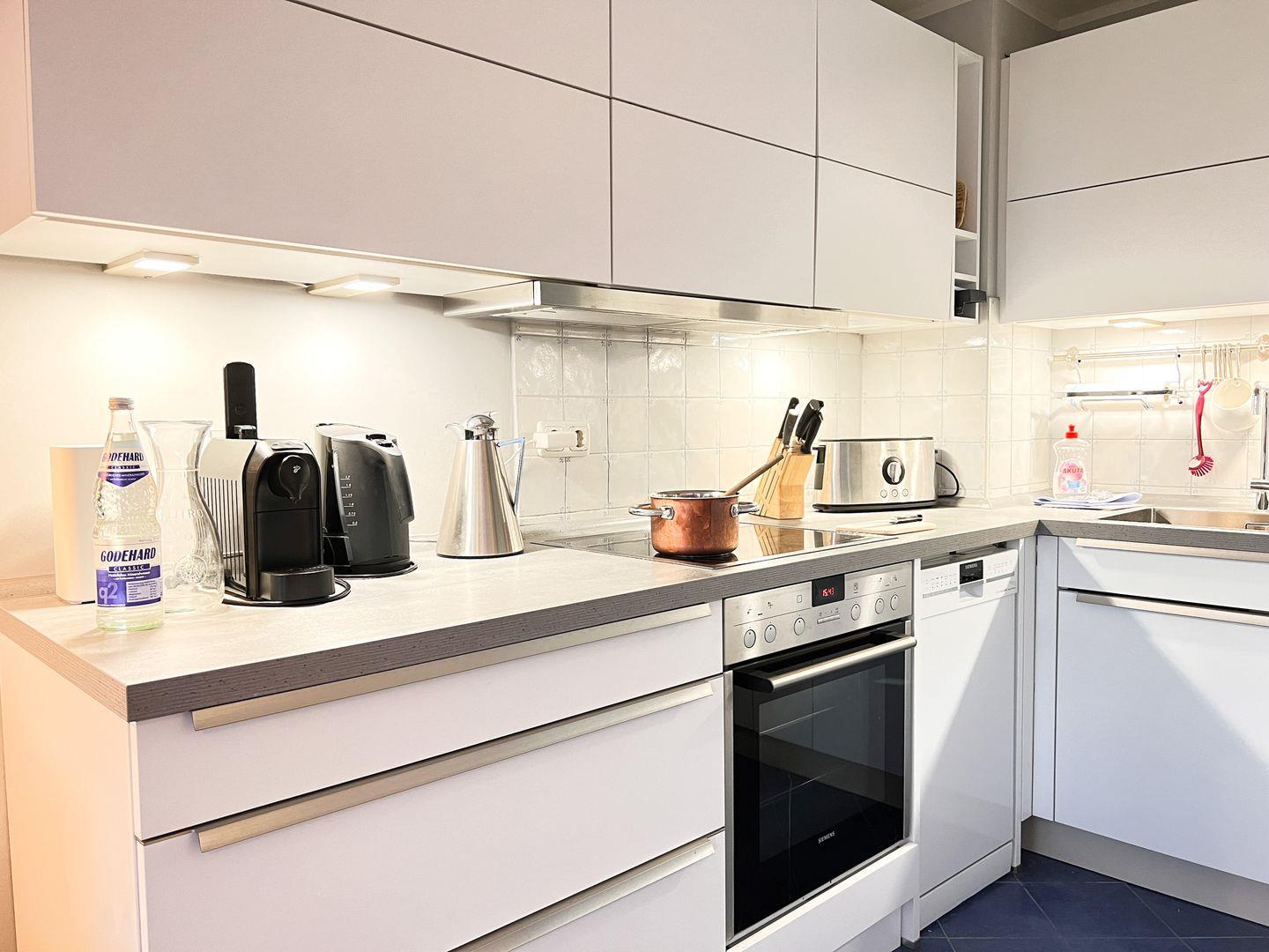 Offene Küche mit Cerankochfeld, Backofen, Geschirrspüler und einer Tchibo Cafissimo Kapselmaschine.