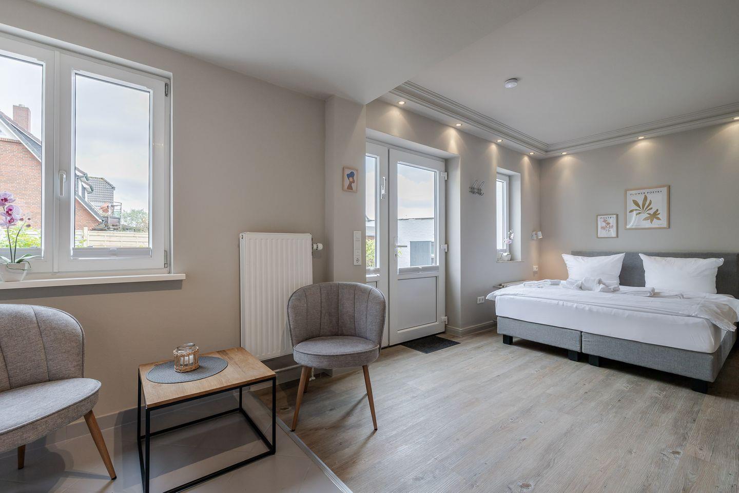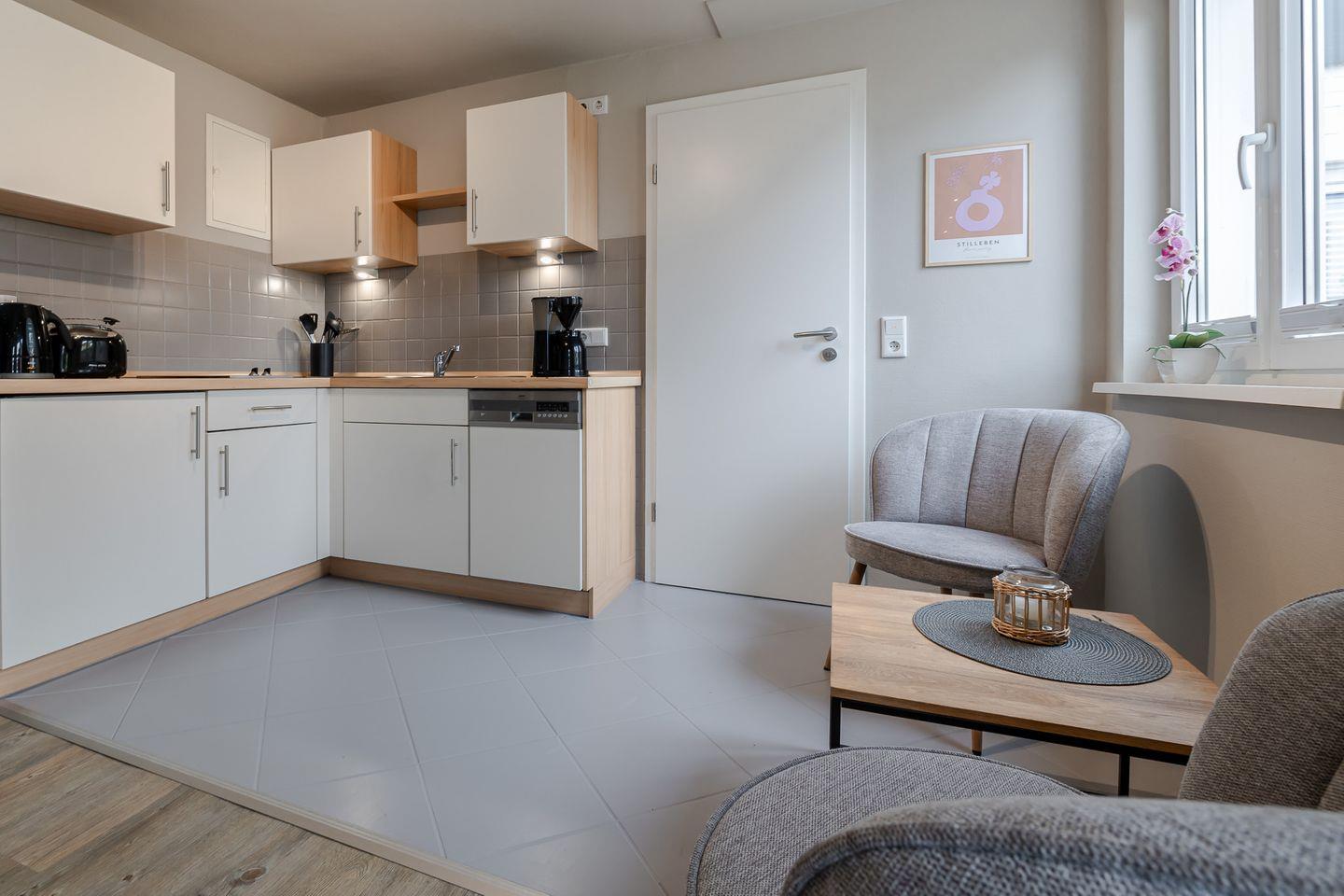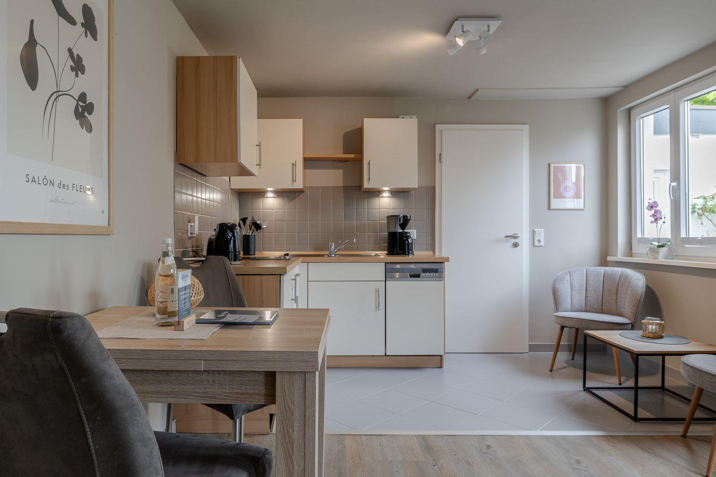 Hier findet wohnen, kochen und schlafen in einem Raum statt und das funktioniert dank der gelungenen Raumaufteilung ziemlich gut. Dafür sorgen eine gut ausgestattete Küchenzeile, ein kleiner Esstisch sowie ein bequemes Boxspringbett (1,60m Breite). Angrenzend befindet sich das helle Duschbad mit Fenster. Besonders schön: Die kleine Gartenterrasse!