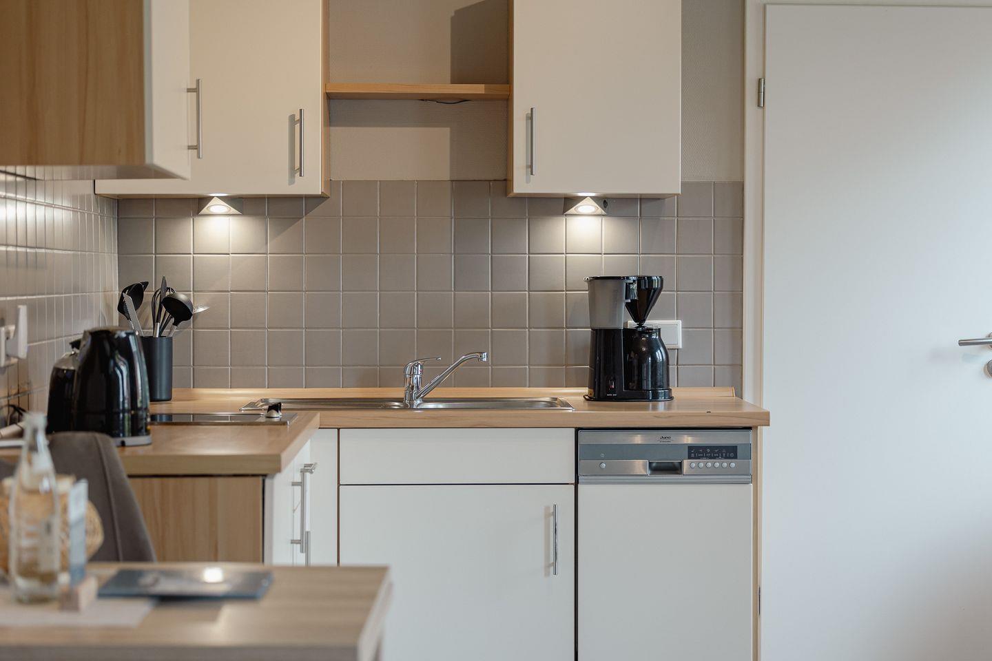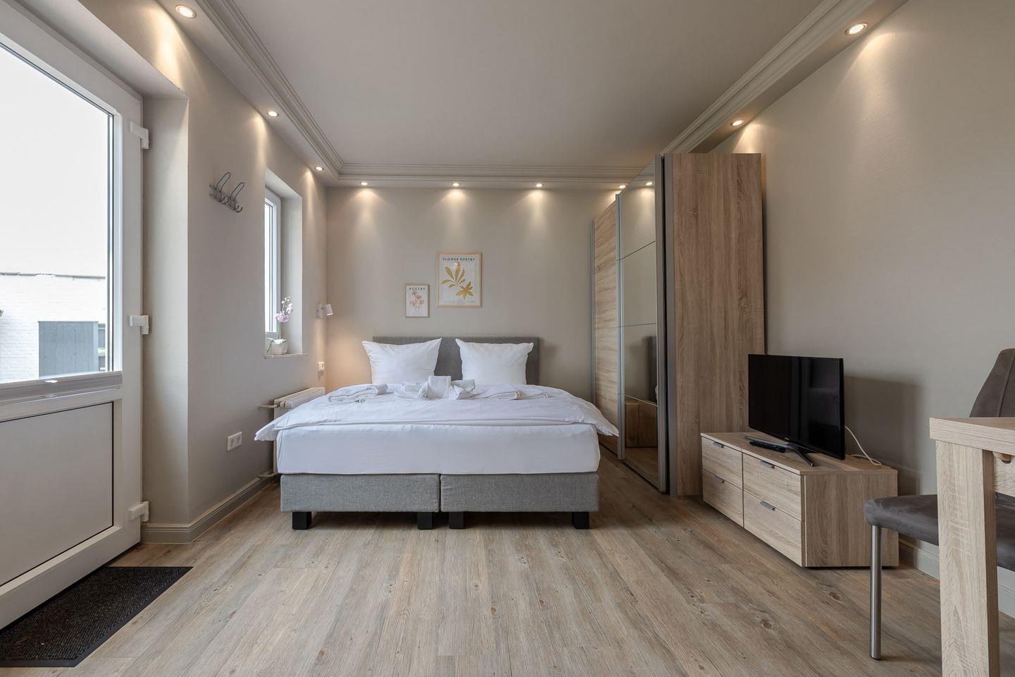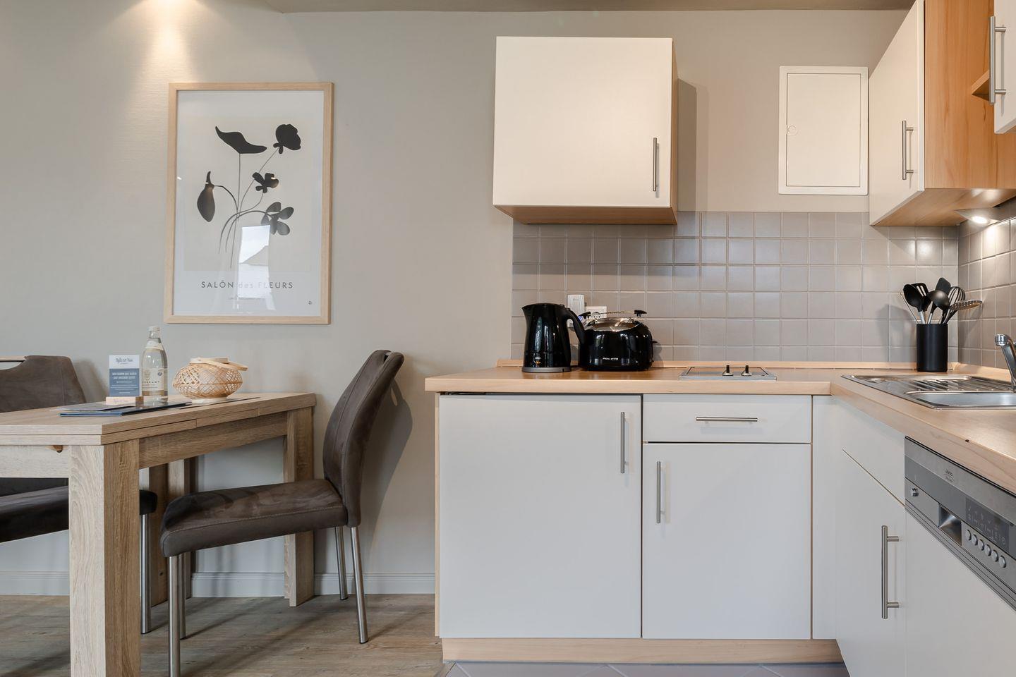 Hier findet wohnen, kochen und schlafen in einem Raum statt und das funktioniert dank der gelungenen Raumaufteilung ziemlich gut. Dafür sorgen eine gut ausgestattete Küchenzeile, ein kleiner Esstisch sowie ein bequemes Boxspringbett (1,60m Breite). Angrenzend befindet sich das helle Duschbad mit Fenster. Besonders schön: Die kleine Gartenterrasse!