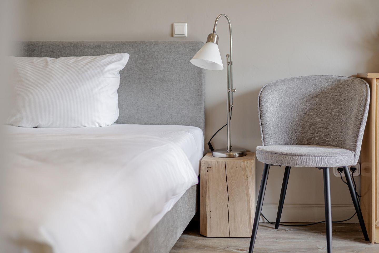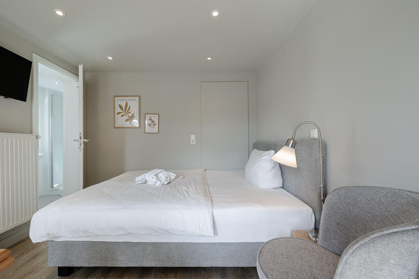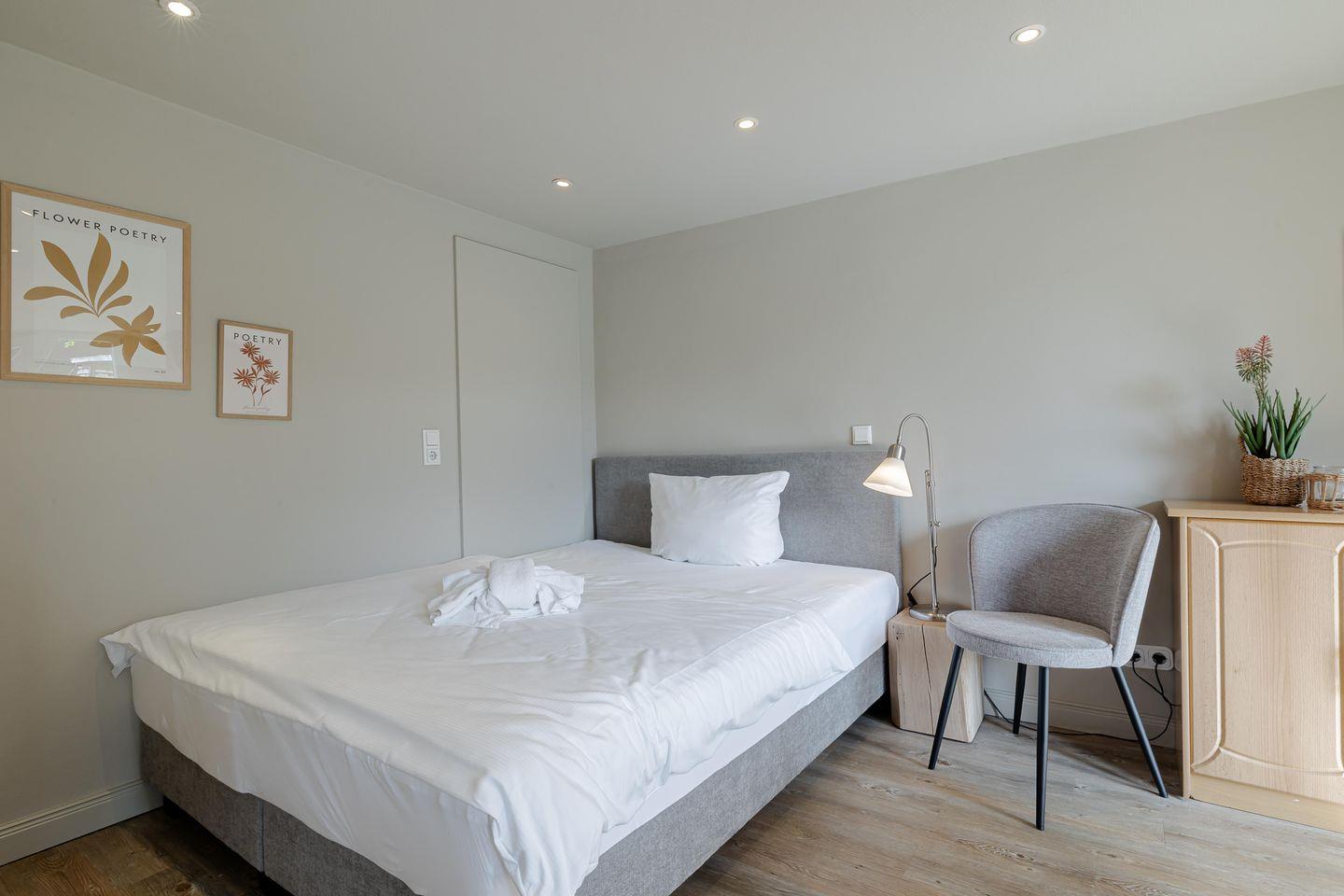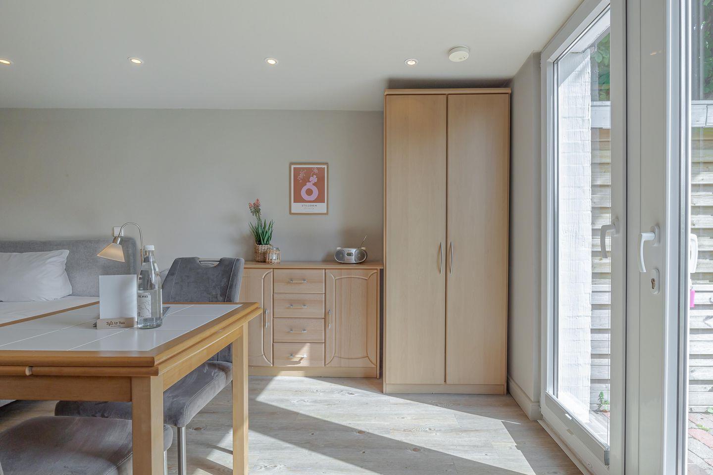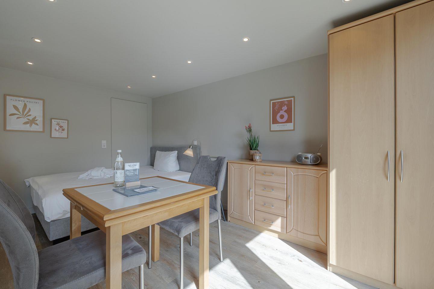 Hier findet wohnen, kochen und schlafen in einem Raum statt und das funktioniert dank der guten Raumaufteilung ziemlich gut. Dafür sorgen eine gut ausgestattete Küchenzeile, ein kleiner Esstisch sowie ein bequemes Boxspringbett. Angrenzend befindet sich das helle Duschbad. Besonders schön: Die kleine Gartenterrasse!