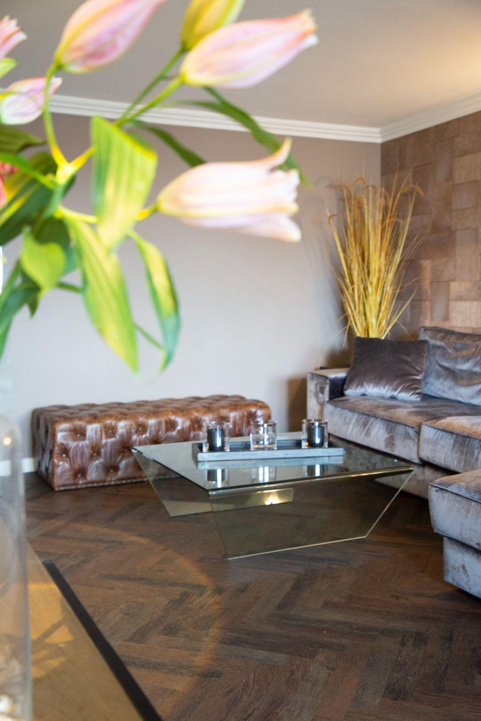 Der Designboden in dunkler Holzoptik, verlegt im eleganten Fischgrätmuster, sorgt für ein exklusives Ambiente. Der Essplatz bietet mit drei Sesseln gemütliche Sitzgelegenheiten für gesellige Mahlzeiten.