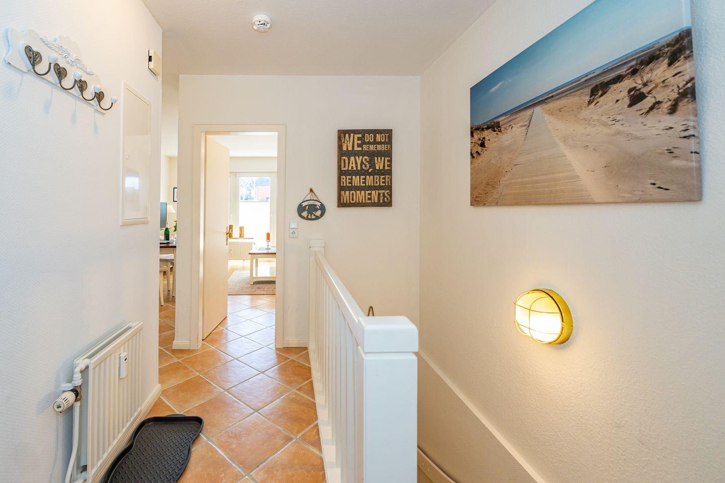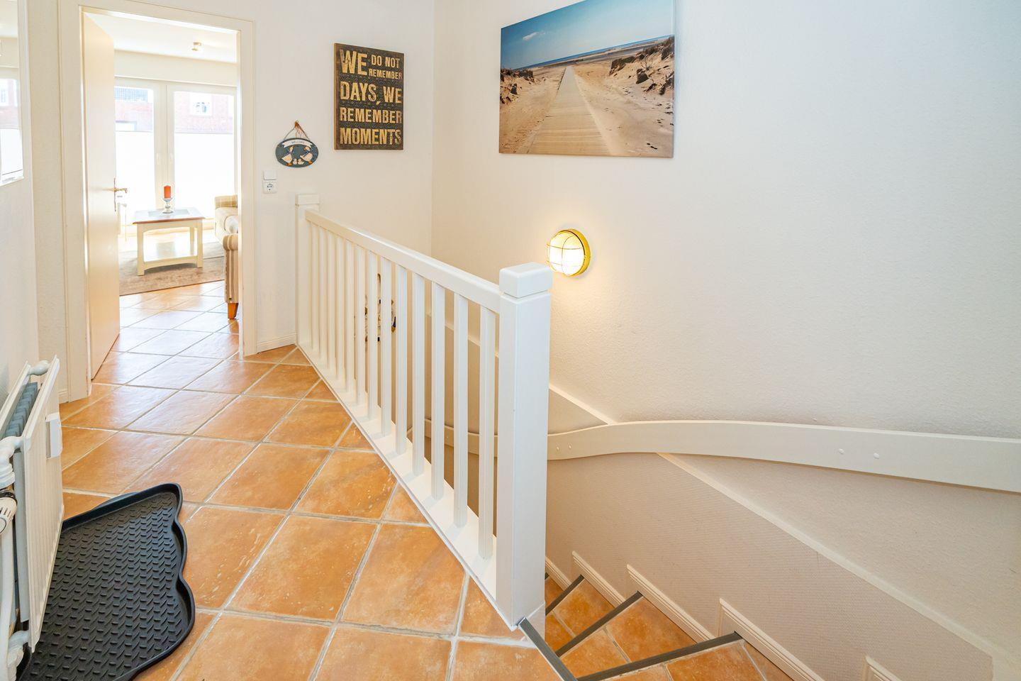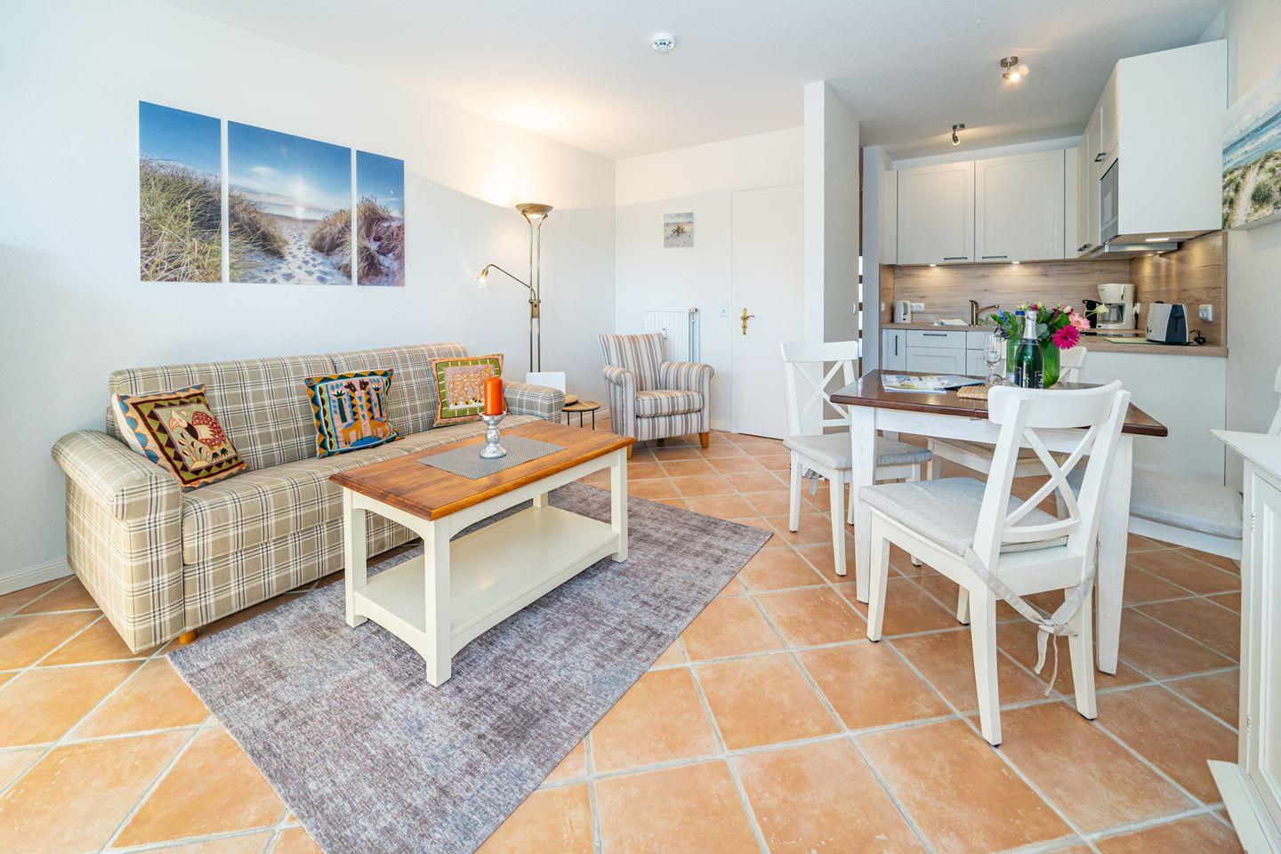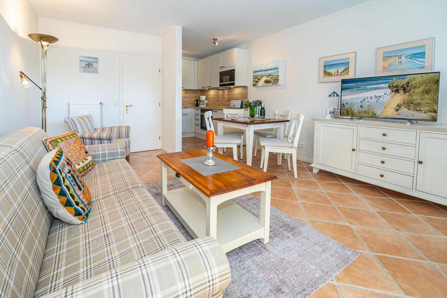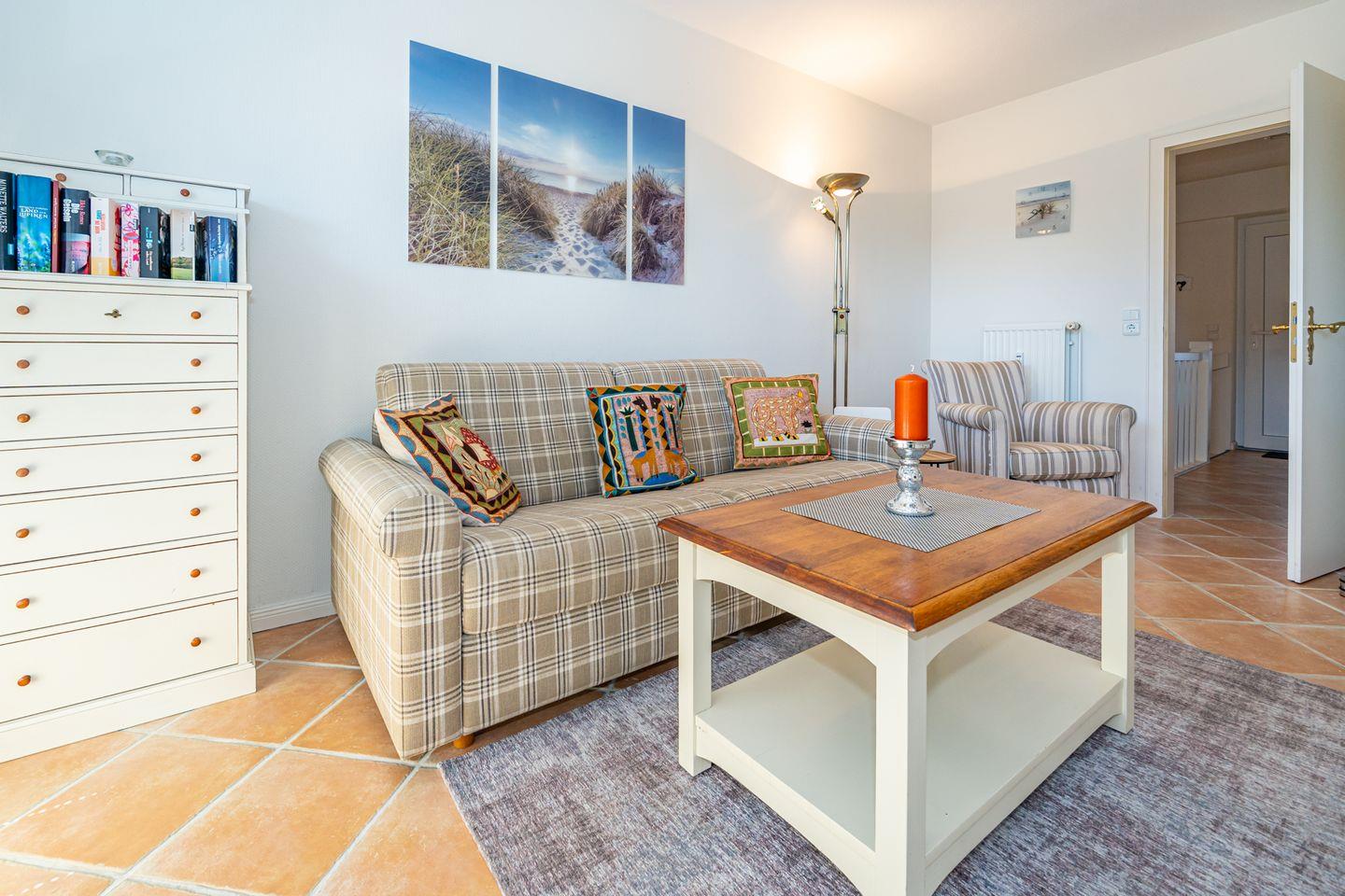 Aufteilung: Im Erdgeschoss gelangt man von der Diele mit Garderobe in das moderne Duschbad/WC mit Fenster, in das Wohnzimmer mit Austritt zu der sonnigen Südterrasse mit Strandkorb sowie der offenen Einbau-Küche mit Essplatz. Im Wohnraum steht eine gemütliche Couchgarnitur (mit Schlaffunktion) zur Verfügung.