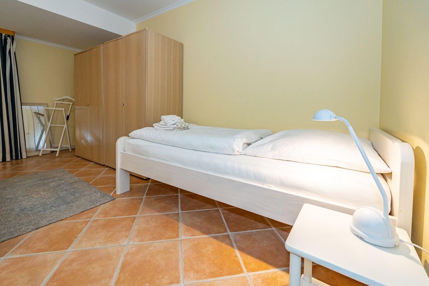 Von der Diele aus gelangt man über eine Treppe in das Untergeschoss des Hauses. Dort stehen das großzügige Schlafzimmer, ein Vorflur mit zusätzlichem Abstellraum und besonders angenehm ein (zusätzliches) Gäste-WC mit Waschmaschine zur Verfügung. Das Schlafzimmer verfügt über ein Doppelbett (Liegefläche 1,80 x 2,00 m, mit guten Einzelmatratzen) mit Nachttischen, zusätzlich ein Einzelbett (Liegefläche 0,90 x 2,00 m) und einen geräumigen Kleiderschrank
