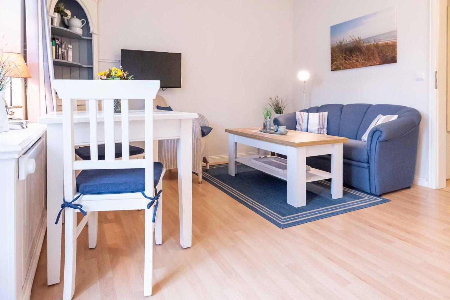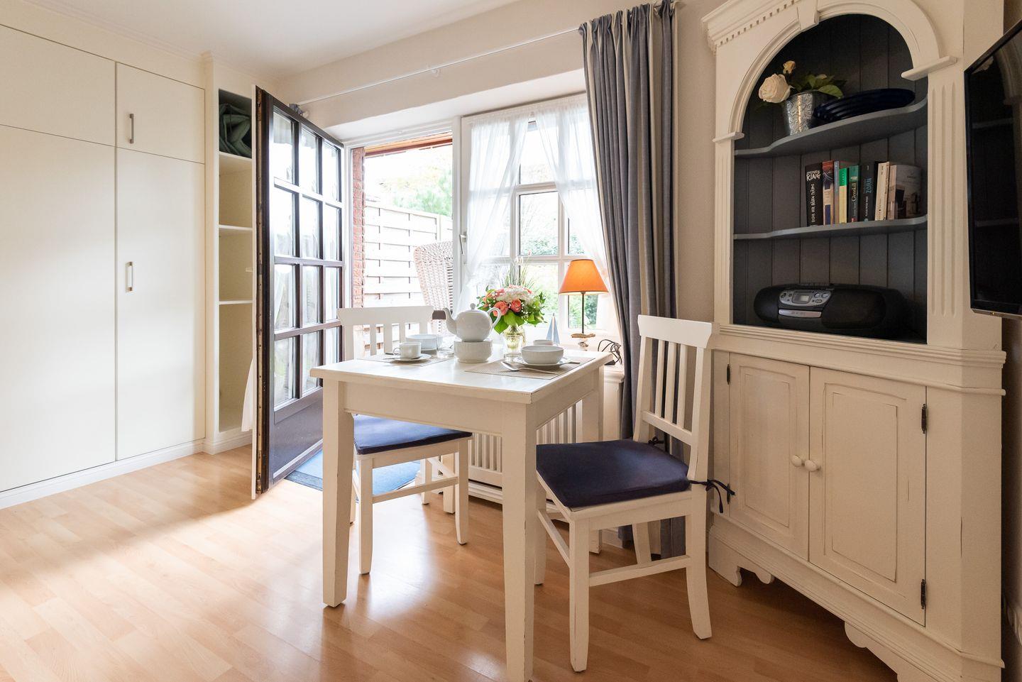 Wohn-/Ess- und Schlafbereich: Heller Wohnbereich mit gemütlicher Sitzecke und schönen Essbereich. Die Schrankwand im Wohnbereich bietet Ihnen Sekundenschnelle eine bequeme Schlafstätte für 2 Personen. Ebenfalls haben Sie vom Wohnbereich aus Zugang auf die möblierte Südterrasse mit Strandkorb und Garten.
