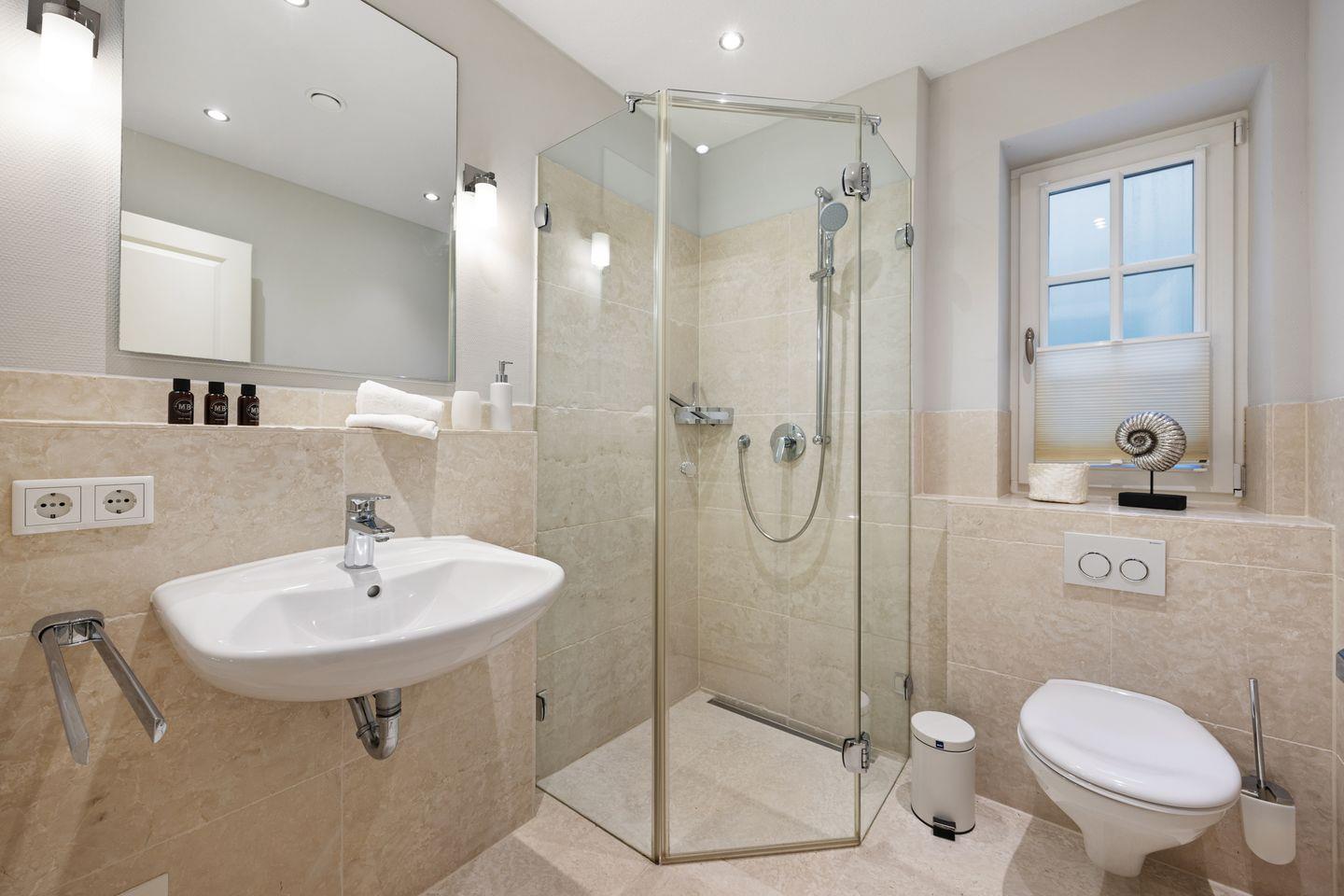 Die beiden modernen Badezimmer bieten ebenerdige Duschen, Fußbodenheizung, Tageslicht und Föhne – ideal für einen erfrischenden Start in den Tag oder entspannte Abende.