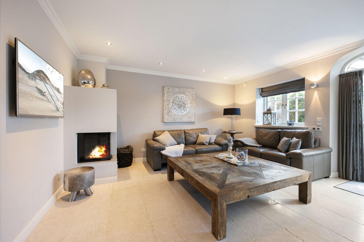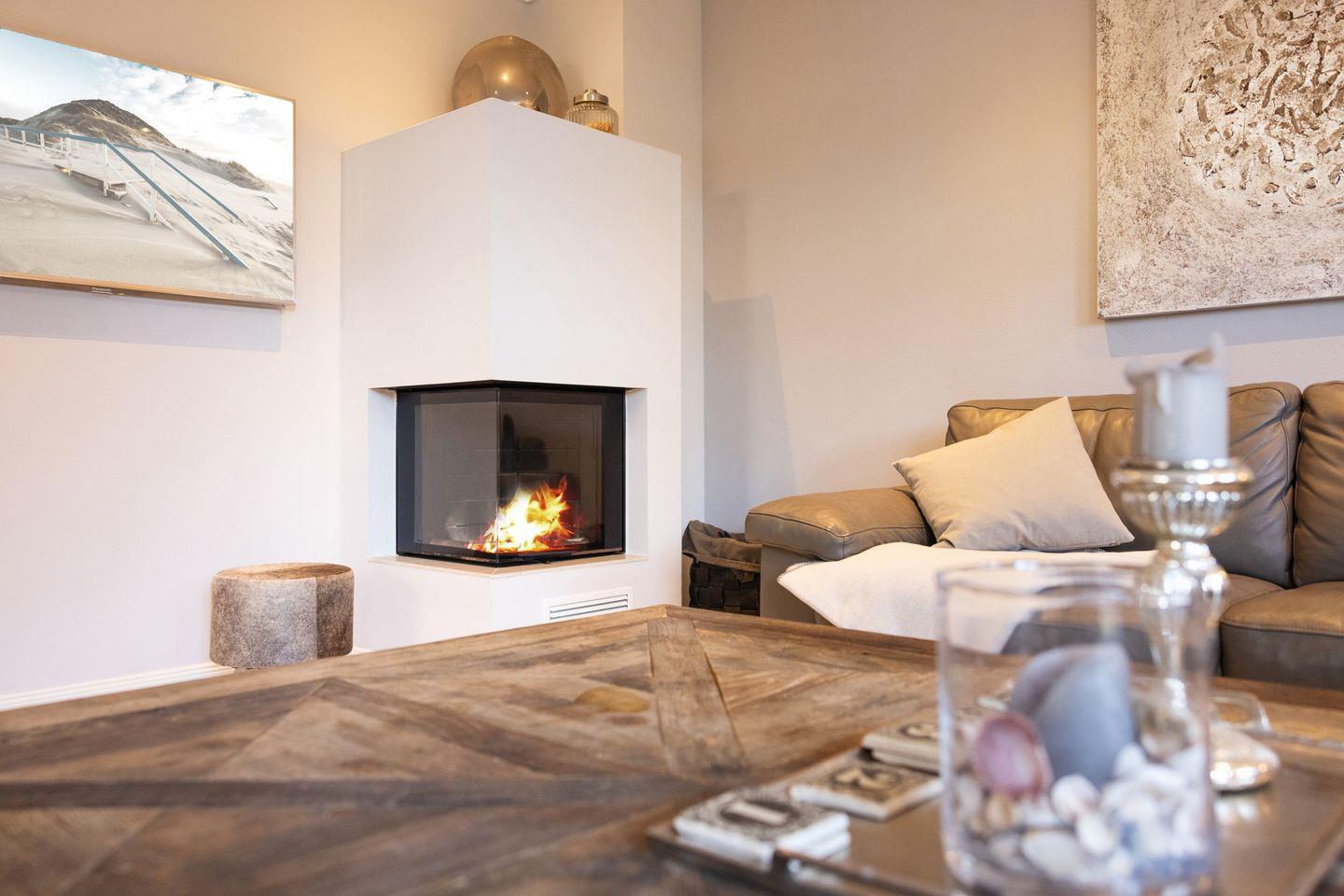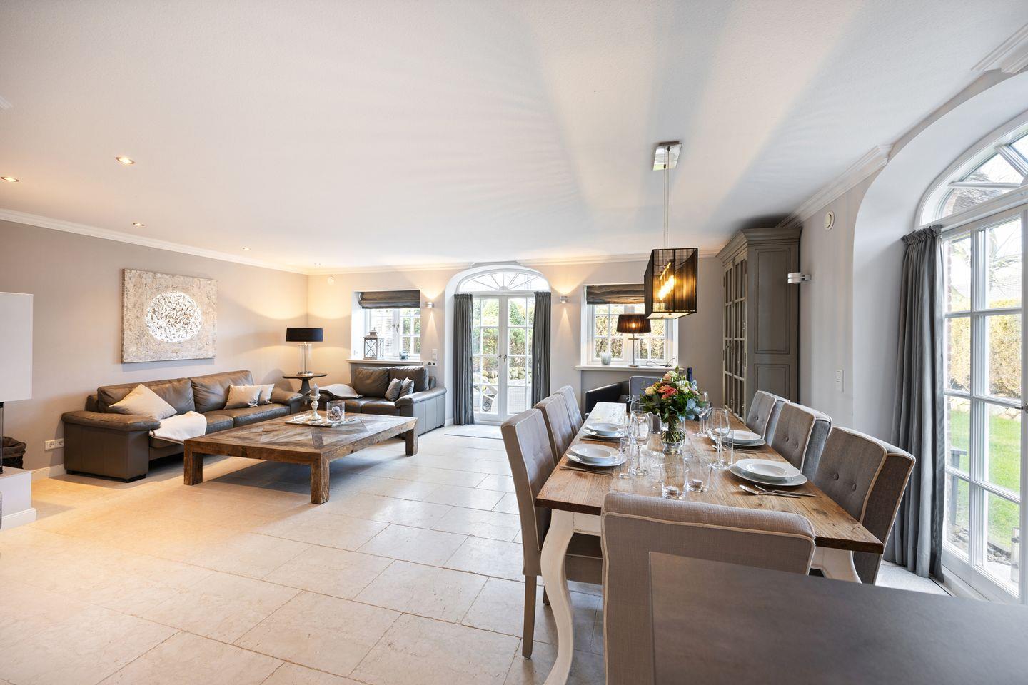 Der großzügige Wohnbereich des Hauses beeindruckt mit einem einladenden Kamin und gemütlicher Sitzgruppe – ideal für entspannte Abende nach einem Tag am Strand oder auf der Insel. Der Essbereich bietet Platz für bis zu 8 Personen und ist der perfekte Ort für gesellige Mahlzeiten. Große Fenster lassen viel Tageslicht herein und schaffen eine helle und freundliche Atmosphäre. Der Zugang zum Garten und den zwei Terrassen lädt dazu ein, sonnige Stunden im Freien zu genießen.