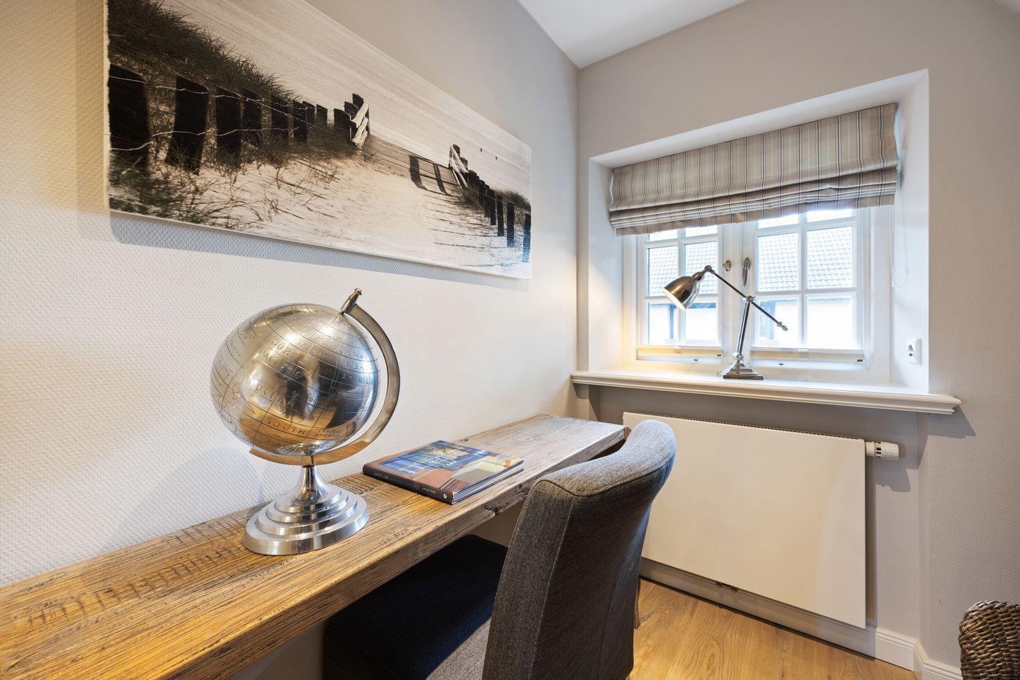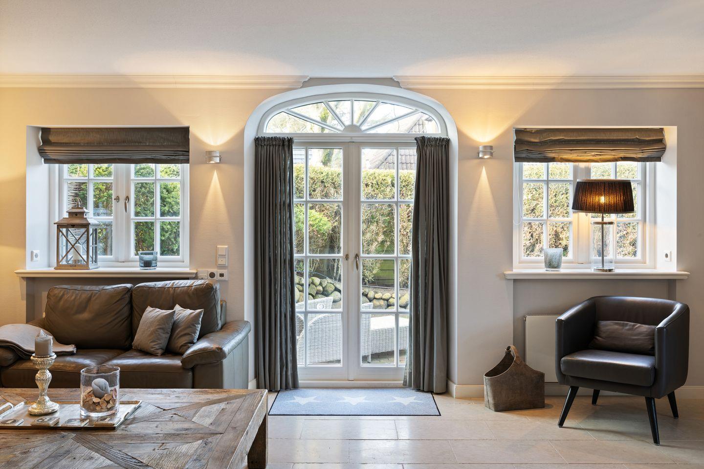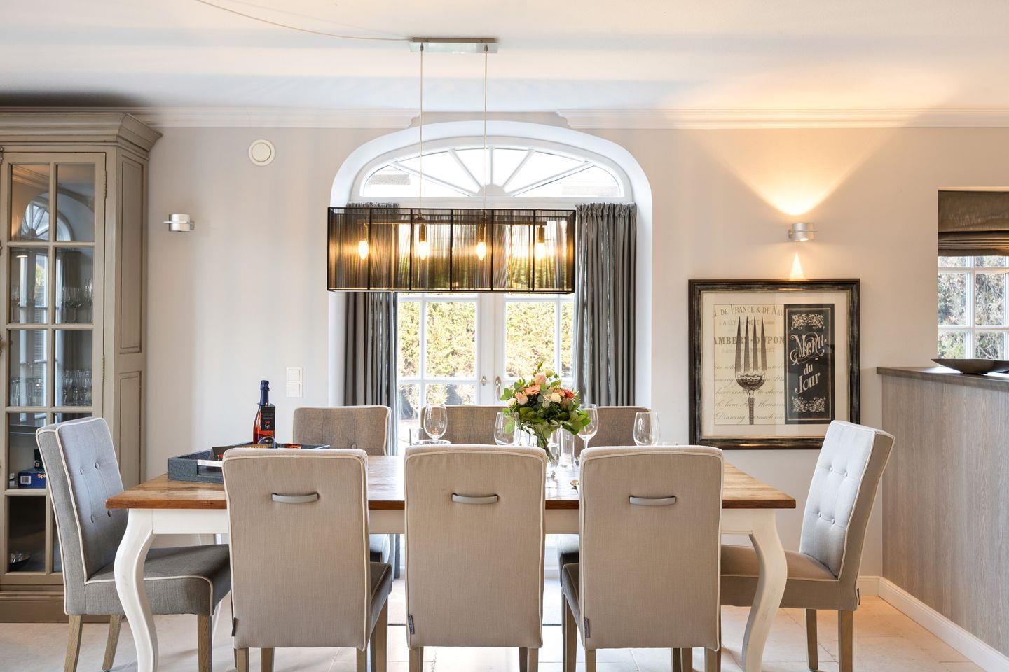 Der großzügige Wohnbereich des Hauses beeindruckt mit einem einladenden Kamin und gemütlicher Sitzgruppe – ideal für entspannte Abende nach einem Tag am Strand oder auf der Insel. Der Essbereich bietet Platz für bis zu 8 Personen und ist der perfekte Ort für gesellige Mahlzeiten. Große Fenster lassen viel Tageslicht herein und schaffen eine helle und freundliche Atmosphäre. Der Zugang zum Garten und den zwei Terrassen lädt dazu ein, sonnige Stunden im Freien zu genießen.