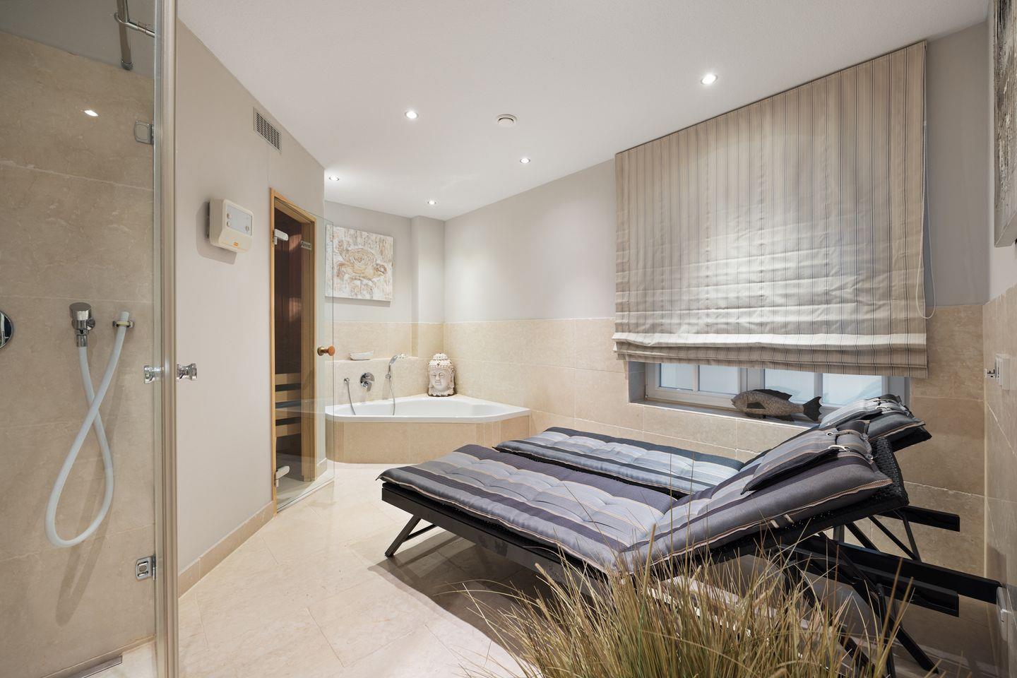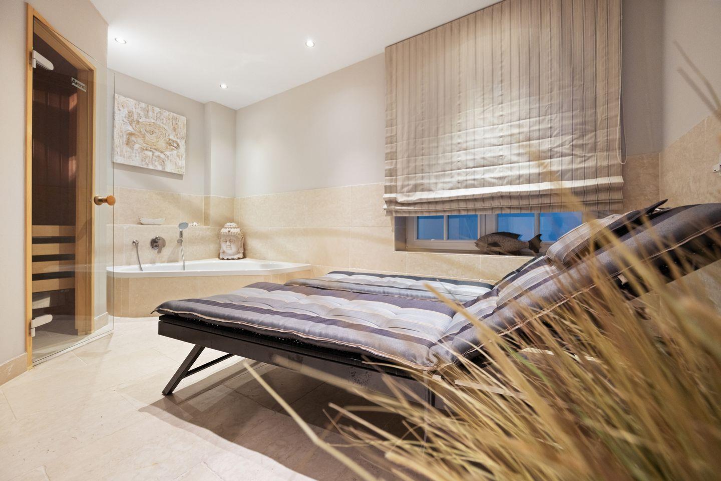 Ein besonderes Highlight des Ferienhauses ist der exklusive Wellnessbereich. Hier finden Sie eine Sauna, eine große Badewanne und eine ebenerdige Dusche, die für vollkommene Entspannung sorgen. Ob nach einem langen Tag am Strand oder für eine gemütliche Auszeit – dieser Bereich bietet alles, was Sie für erholsame Stunden benötigen.