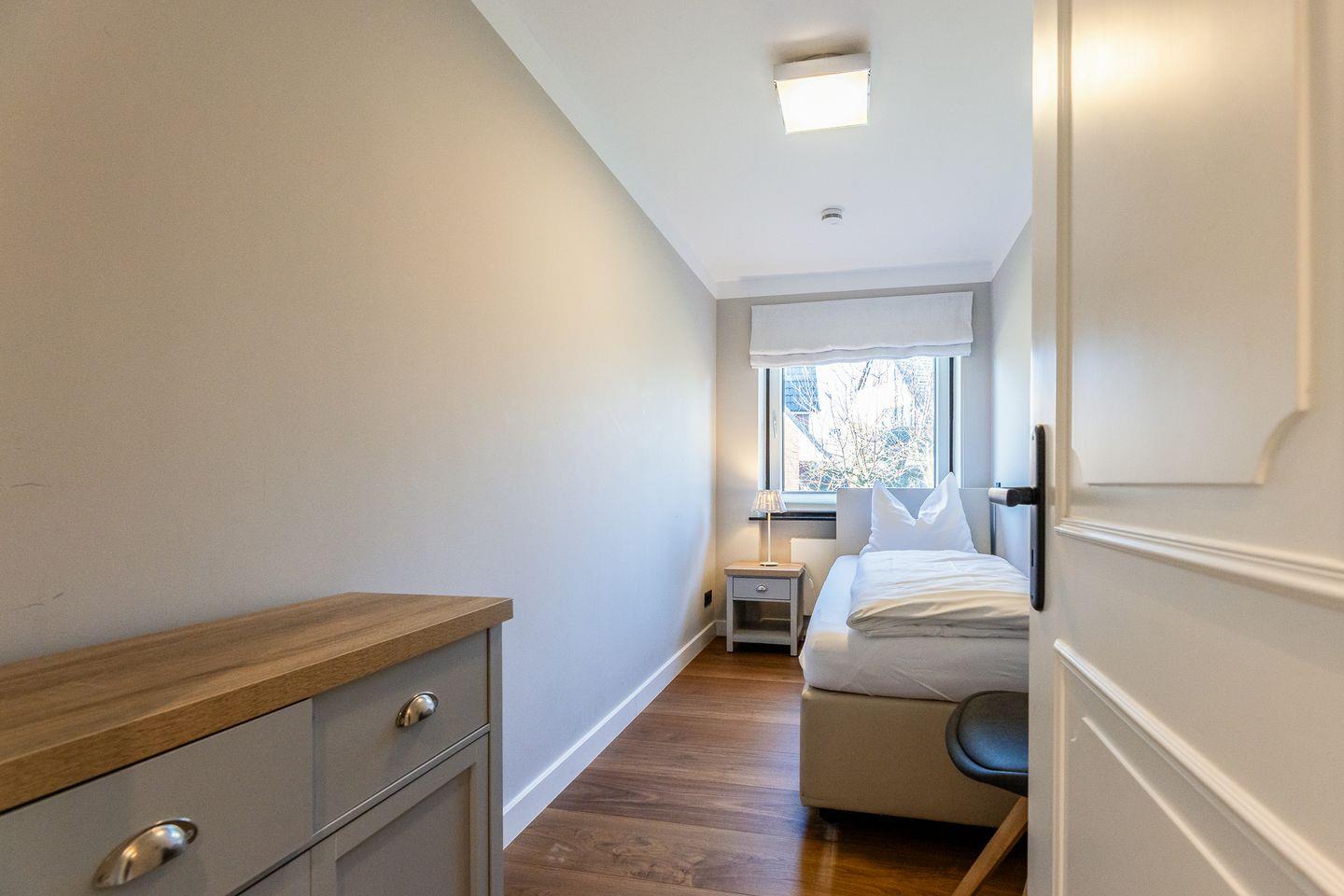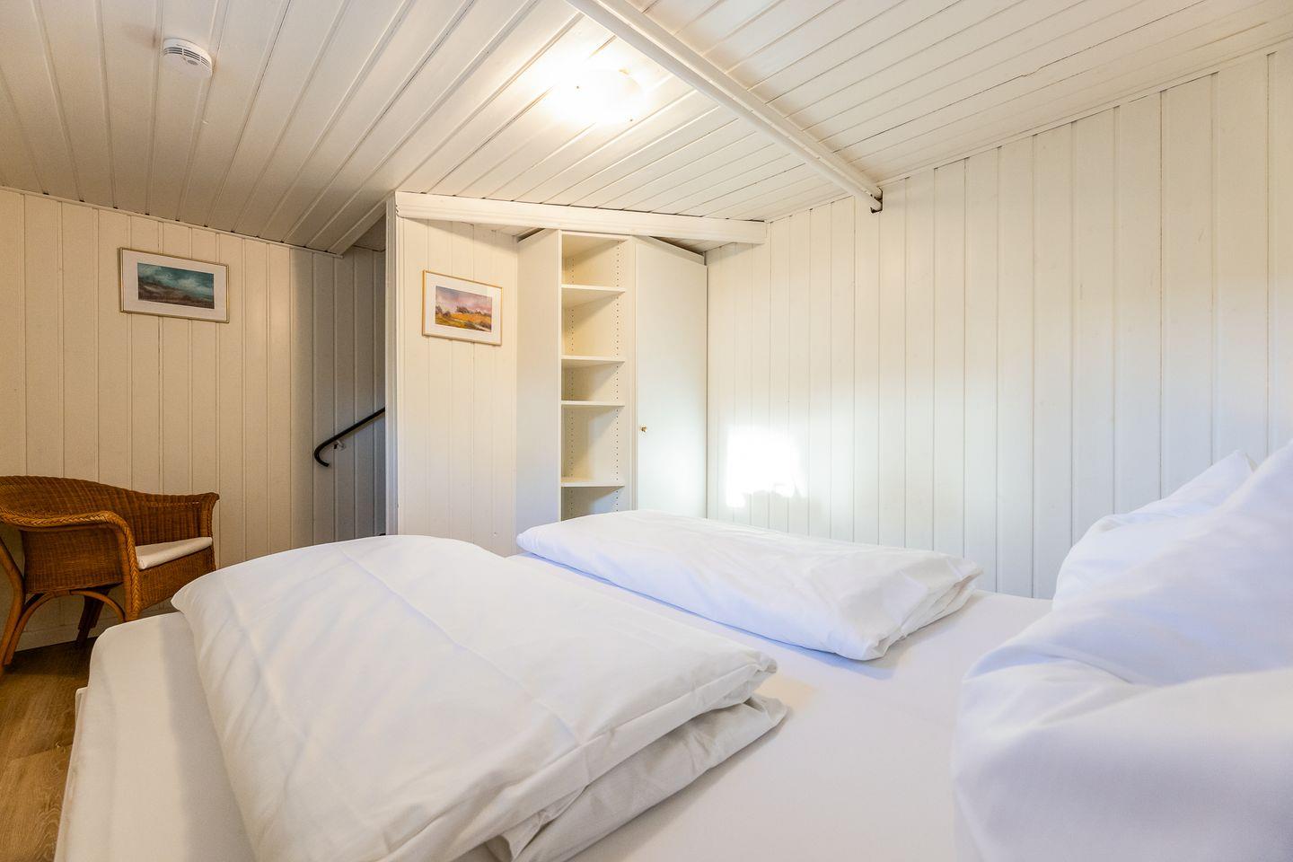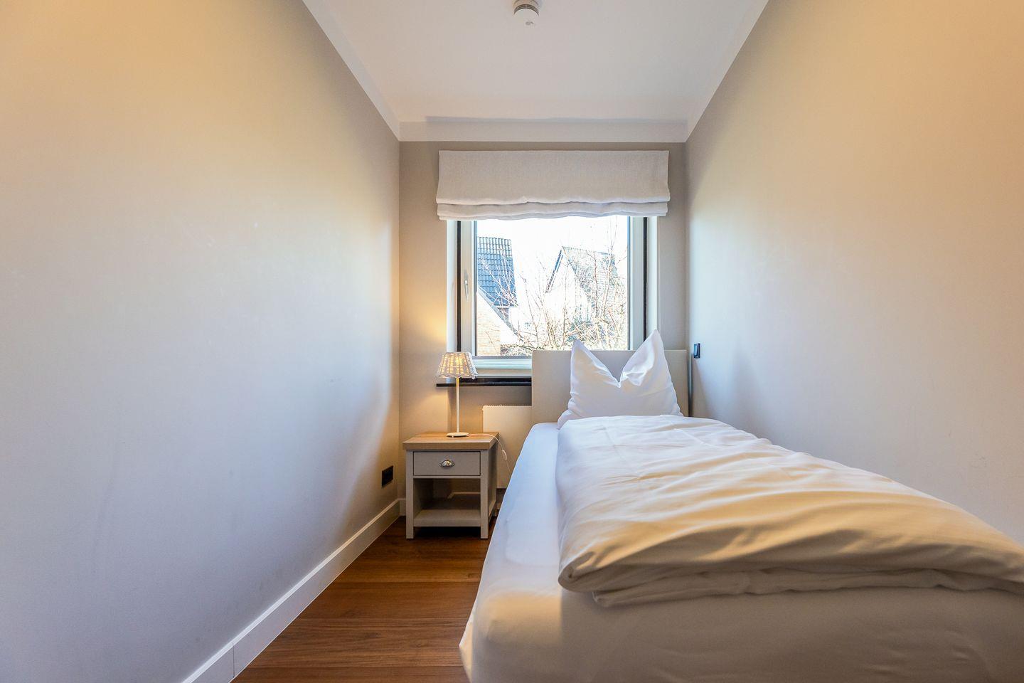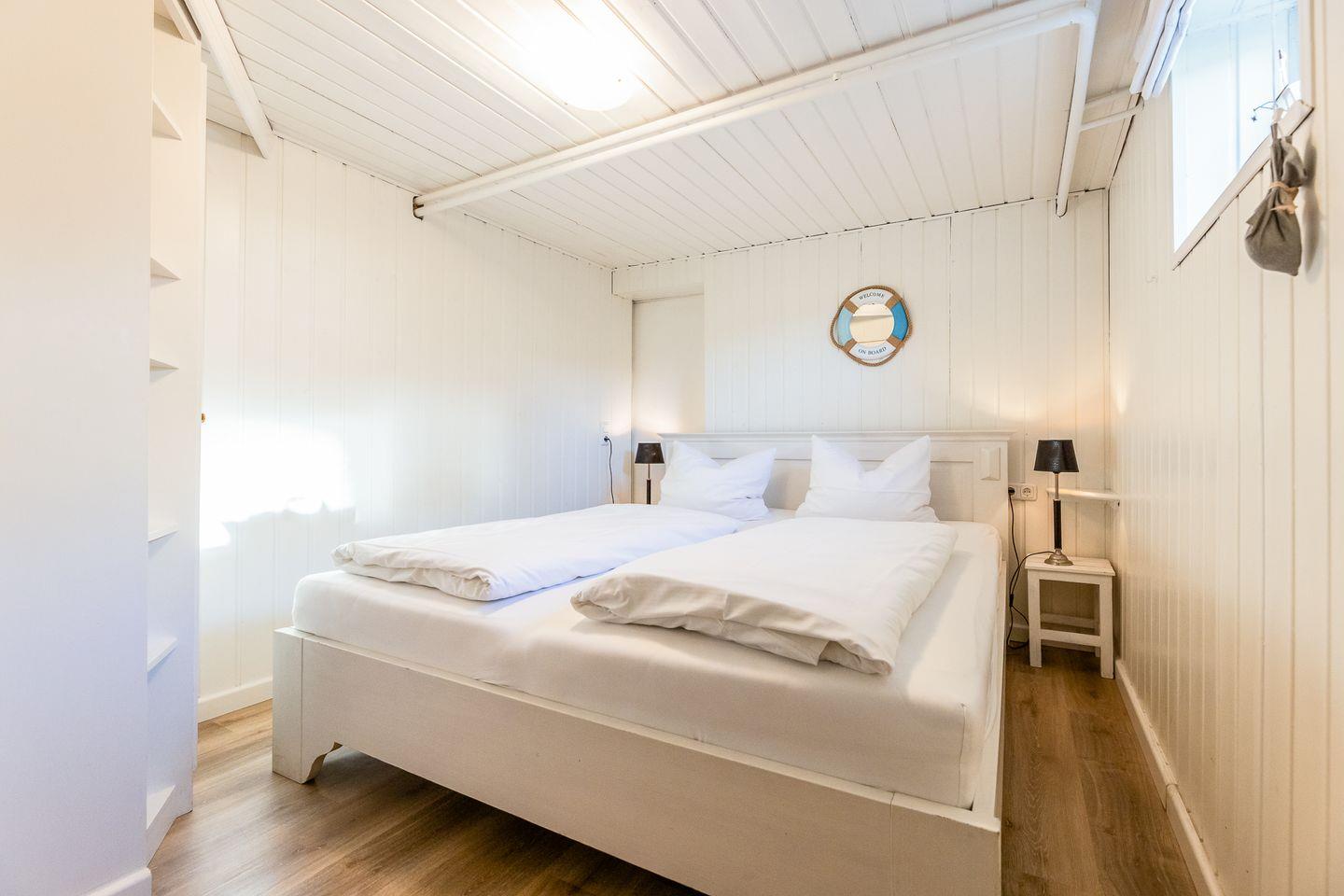 Von den beiden Schlafzimmern befindet sich eines auf Wohnebene und ist mit einem komfortablen Einzel-Boxspringbett ausgestattet. Das zweite Schlafzimmer ist eine Treppe tiefer und ganz clean in Weiß im gemütlichen "Kojenstil" gehalten.