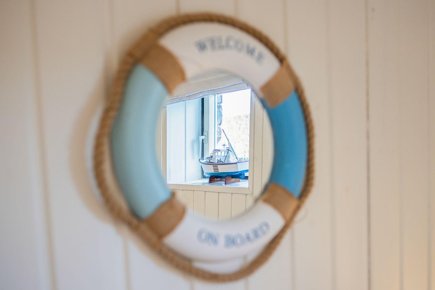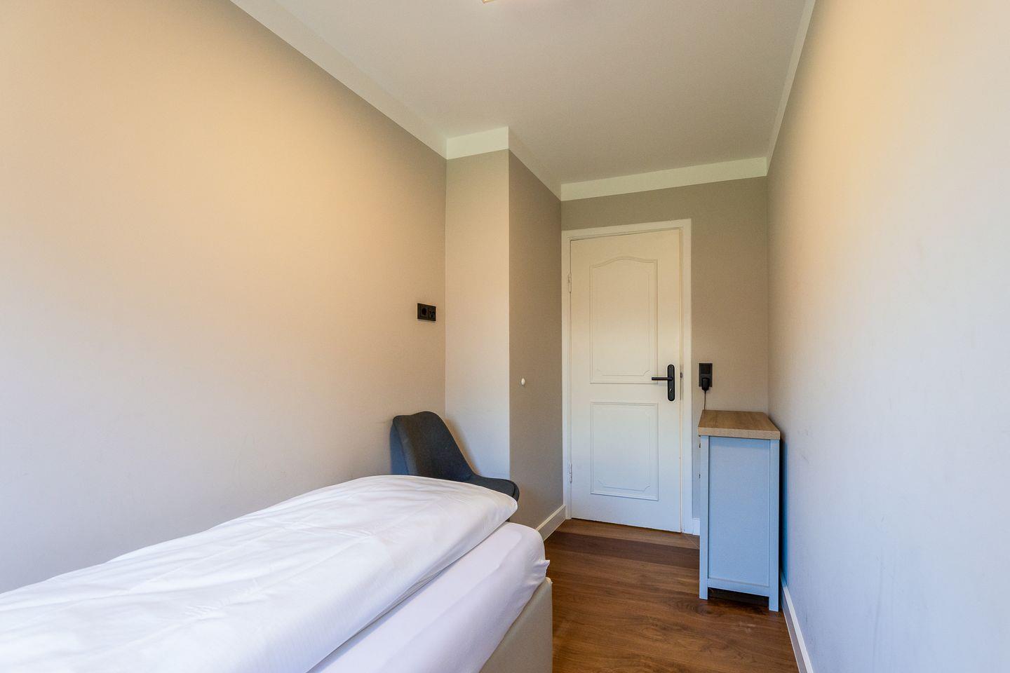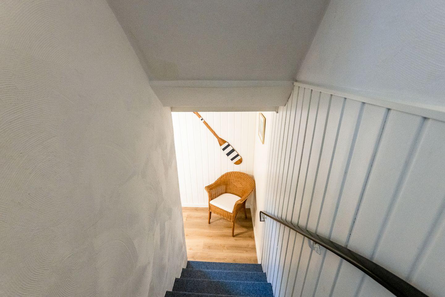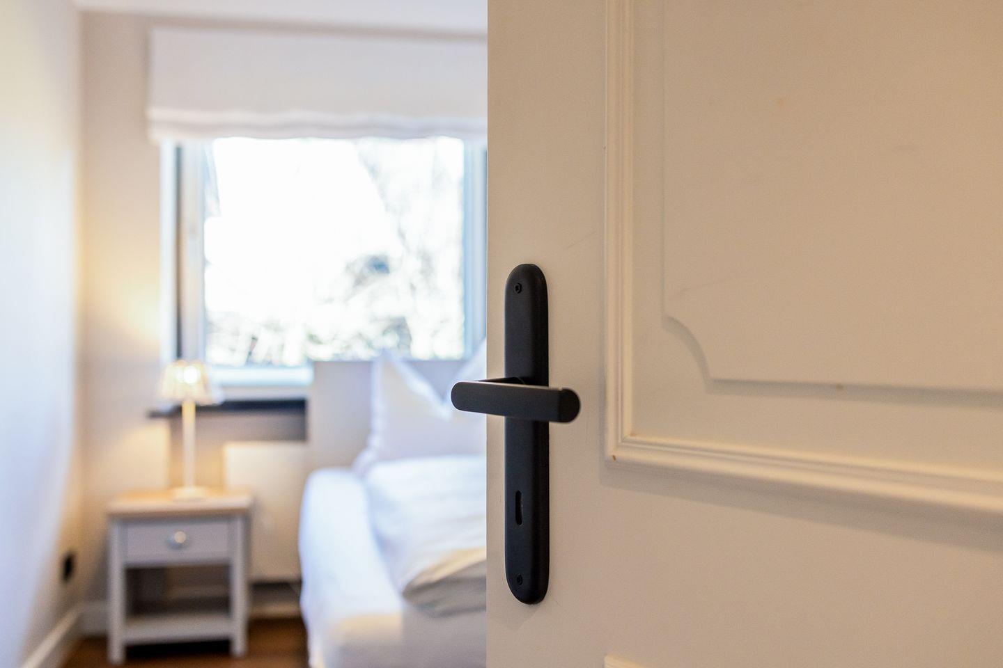 Von den beiden Schlafzimmern befindet sich eines auf Wohnebene und ist mit einem komfortablen Einzel-Boxspringbett ausgestattet. Das zweite Schlafzimmer ist eine Treppe tiefer und ganz clean in Weiß im gemütlichen "Kojenstil" gehalten.
