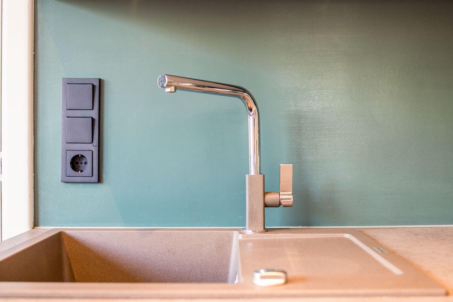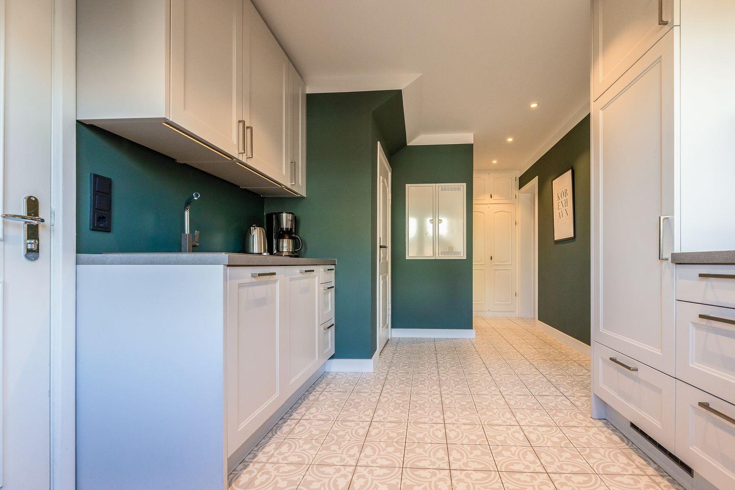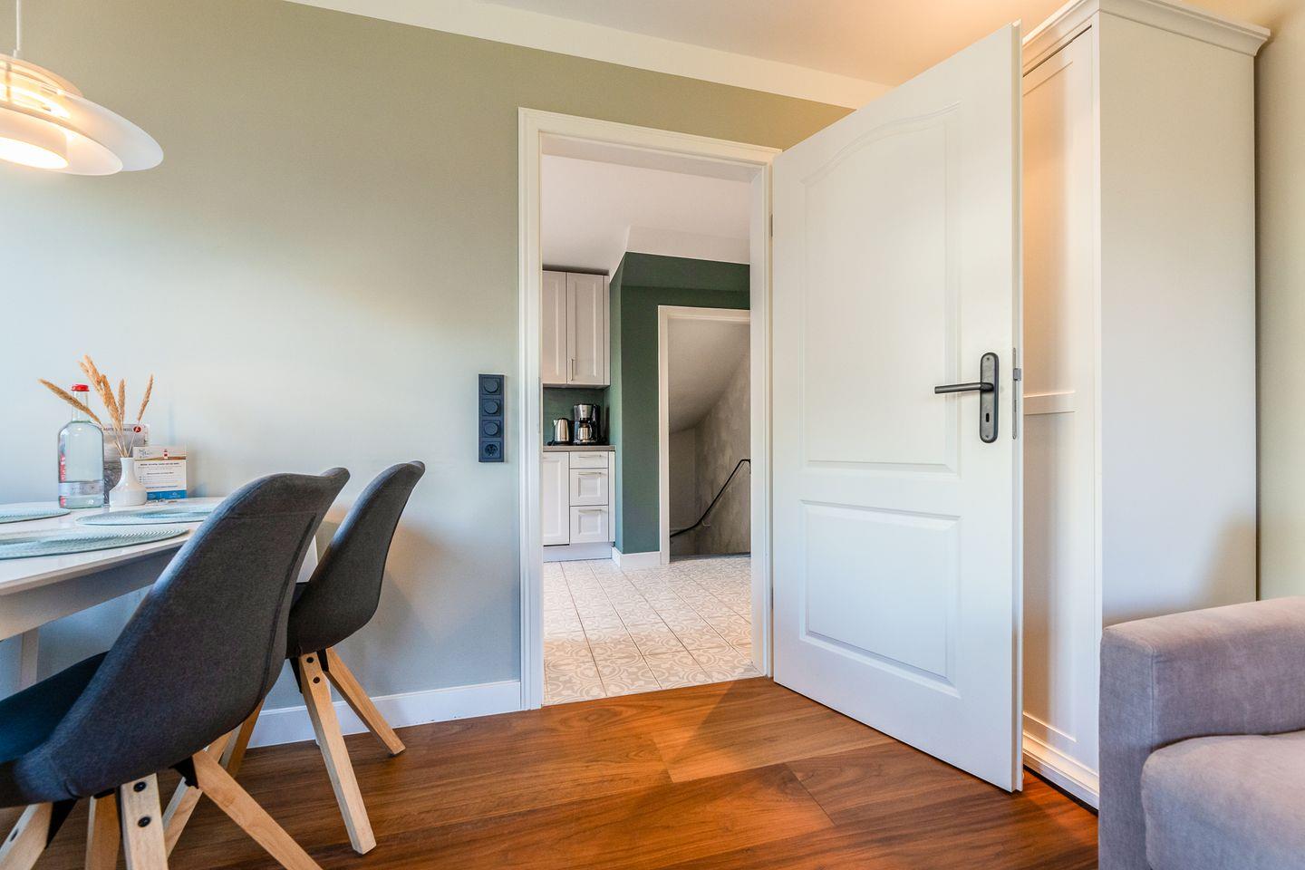 Dieses Appartement strahlt Ruhe und schlichte Klarheit aus. Hier treffen hochwertige Möbel auf farbige Wände und jede Menge Liebe zum Detail. In der "guten Stube" ergeben das gemütliche Ecksofa und der Esstisch ein harmonisches Ganzes. Die Küche hat sich direkt am Eingang platziert und besticht durch ihre klare Formsprache, die durch die grünen Wände und die verspielten Bodenfliesen wunderbar gebrochen wird.