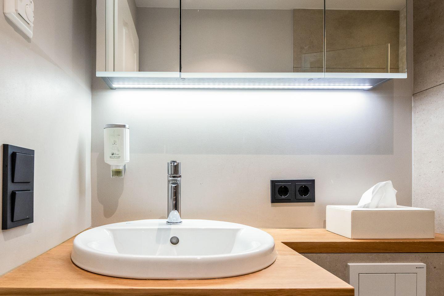 Abgerundet wird das Appartement Kopenhagen durch ein stylishes Bad mit einem hochwertigen Waschtisch aus Holz und einer Regendusche samt Mosaikfliesen.