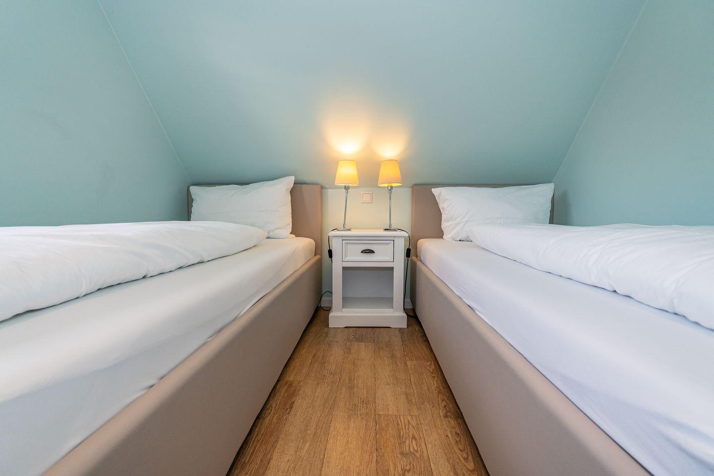 Der gemütliche Wohnbereich besteht aus einer kleinen Chillout-Ecke mit Couch sowie einem Esstisch nebst hochwertig ausgestatteter Küchenzeile. Die bodentiefen Fenster sind zugleich der Austritt auf den Balkon (Westlage), auf dem es sich im Sommer perfekt relaxen lässt. Nebenan im Schlafzimmer stehen zwei einzelne Boxspringbetten und ein großes Boxspringbett lädt eine Etage höher zum Schlummern wie im 7ten Himmel ein.