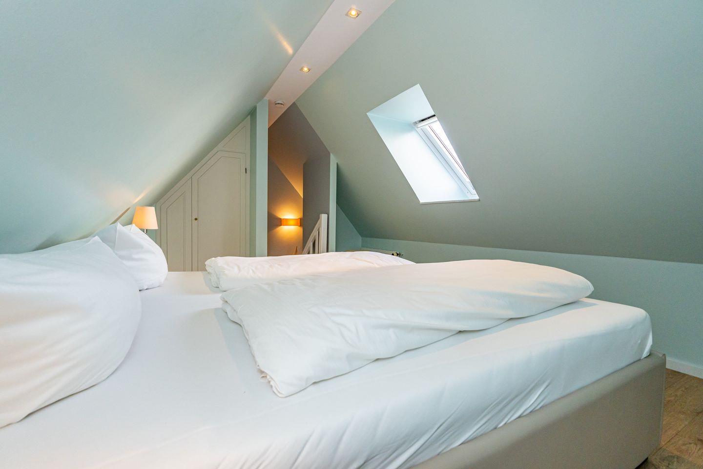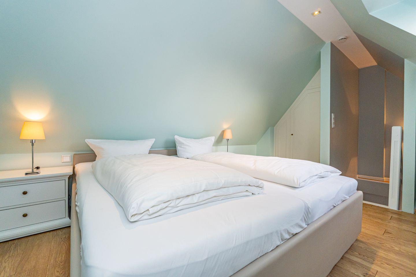 Der gemütliche Wohnbereich besteht aus einer kleinen Chillout-Ecke mit Couch sowie einem Esstisch nebst hochwertig ausgestatteter Küchenzeile. Die bodentiefen Fenster sind zugleich der Austritt auf den Balkon (Südlage), auf dem es sich im Sommer perfekt relaxen lässt. Nebenan im Schlafzimmer stehen zwei einzelne Boxspringbetten und ein großes Boxspringbett lädt eine Etage höher zum Schlummern wie im 7ten Himmel ein.