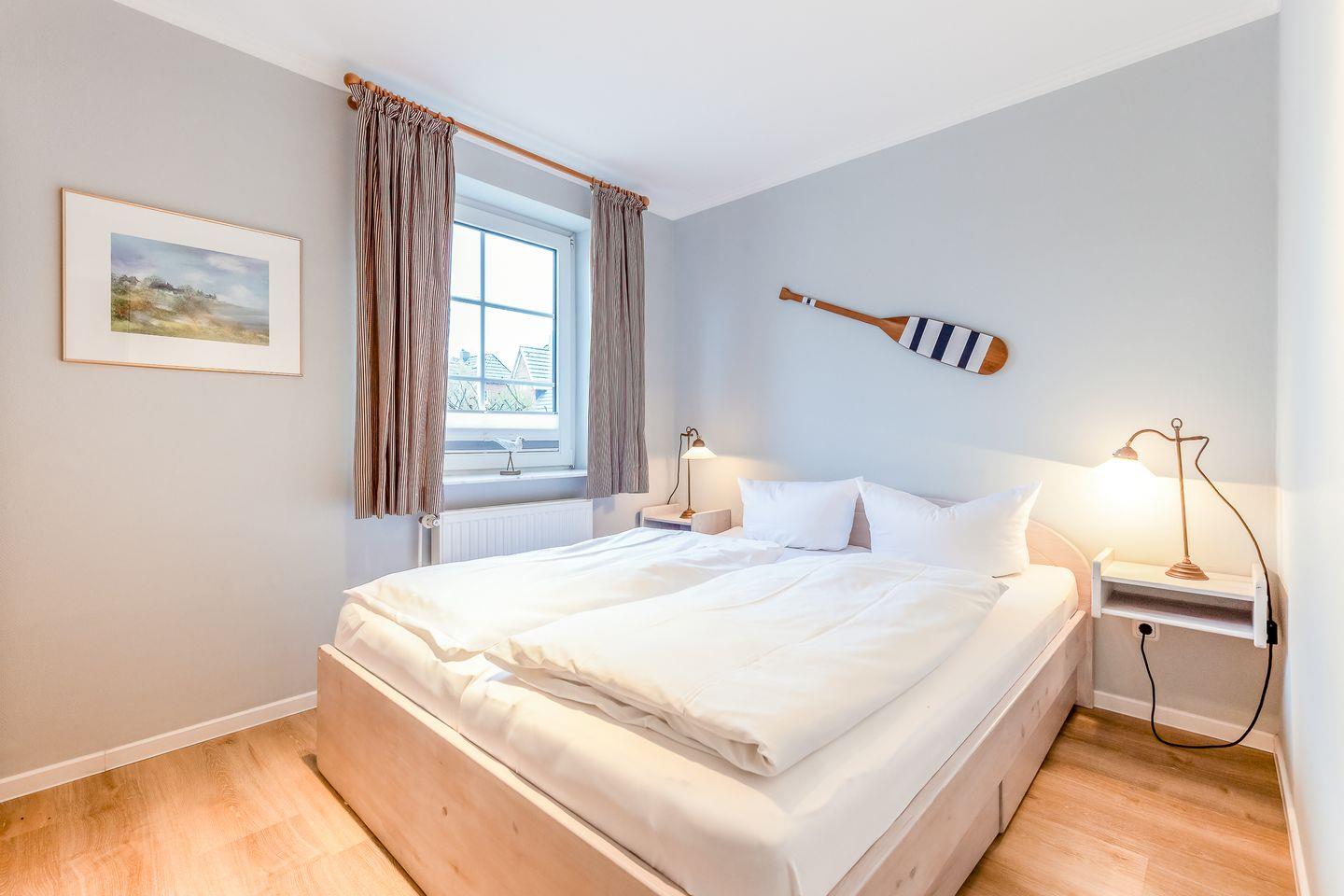 Das Schlafzimmer verfügt über ein komfortables Doppelbett und ist dank seinen gedeckten Farben auch optisch ein schöner Ruhepol. In dem modernen Badezimmer ist jeder Besuch eine Freude und dass nicht nur wegen den hübschen Mosaikfliesen, die die Dusche zieren. Kurz gesagt, ist das Appartement Nord-Hüs No. 1 ein heimeliges Zuhause auf Zeit, das bestens für kleine Familien geeignet ist.
