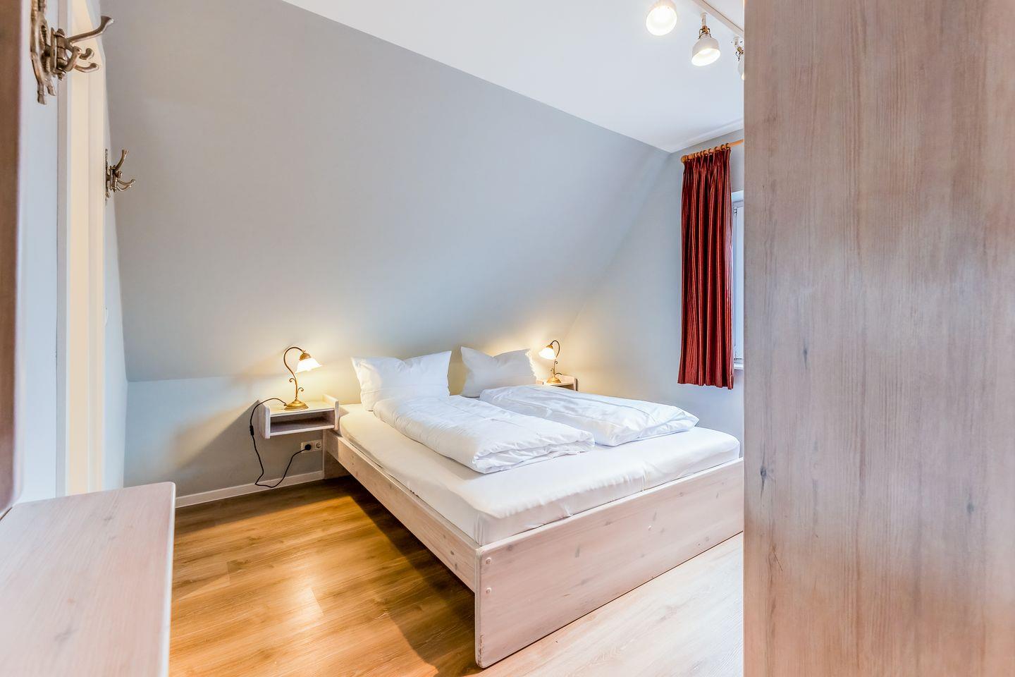 Das Schlafzimmer verfügt über ein komfortables Doppelbett und ist dank seinen gedeckten Farben auch optisch ein schöner Ruhepol. Ein weiteres ebenso gemütliches Schlafzimmer befindet sich eine Treppe weiter oben unter dem Dach. Auch in den beiden modernen Badezimmer ist jeder Besuch eine Freude, den die sandfarbenen Fliesen hier erinnern schon an den späteren Strandbesuch.