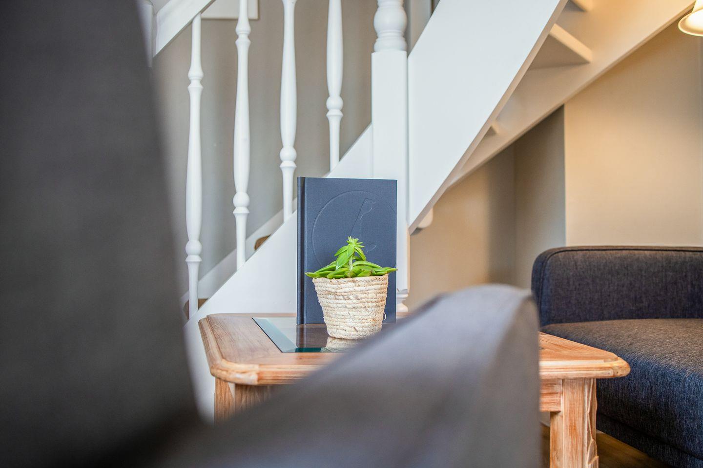 ausgewählte Dekostücke gesetzt. Der offene Wohnbereich unterteilt sich in eine gemütliche "Sofa-Ecke", die sich unter die Treppe "gekuschelt" hat sowie einen Essbereich, der an die moderne Küchenzeile angrenzt. Schön auch: der kleine Balkon für den "Frischekick" am Morgen oder den Absacker am Abend.