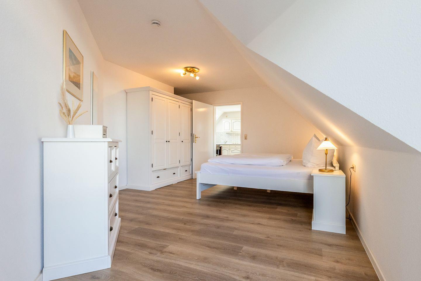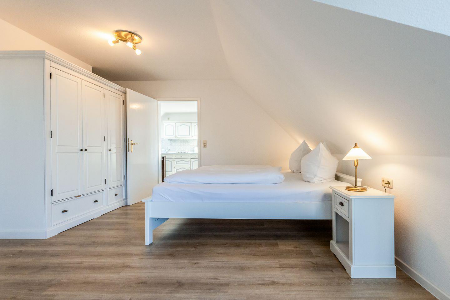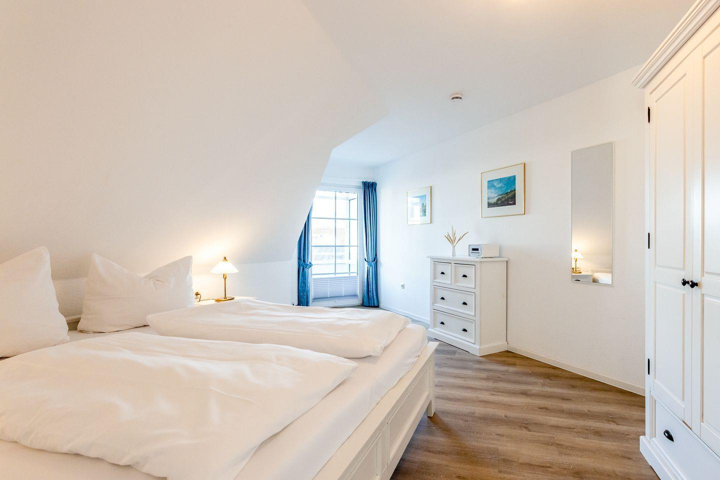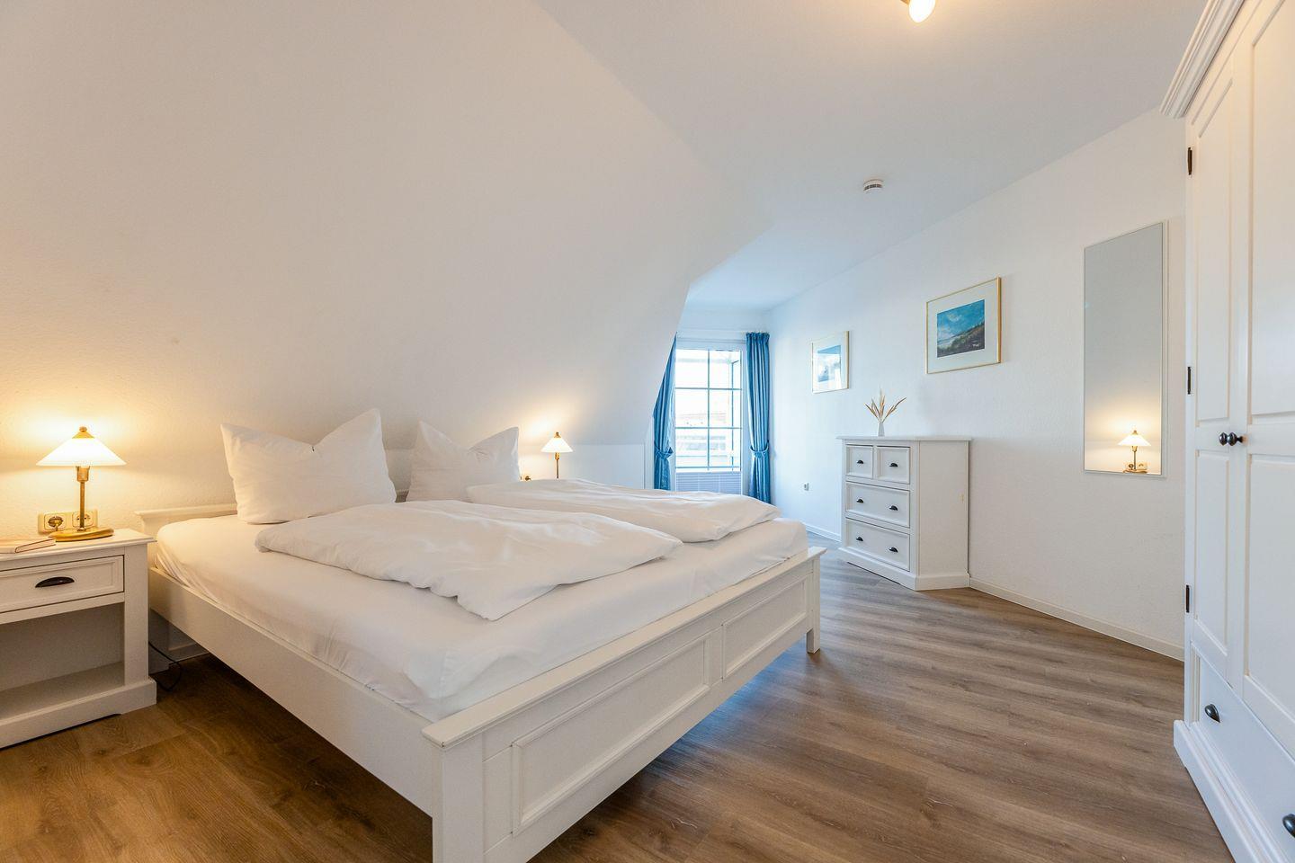 Das Schlafzimmer mit Doppelbett ist ebenfalls in puristischem Weiß gehalten und als Kontrast wurde frisches Blau für die Gardinen gewählt. Im angrenzenden Bad gibt es eine Dusche und ein Fenster für optimales Tageslicht.
