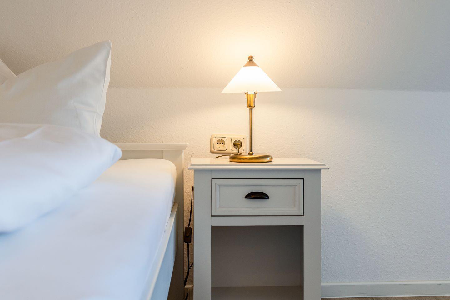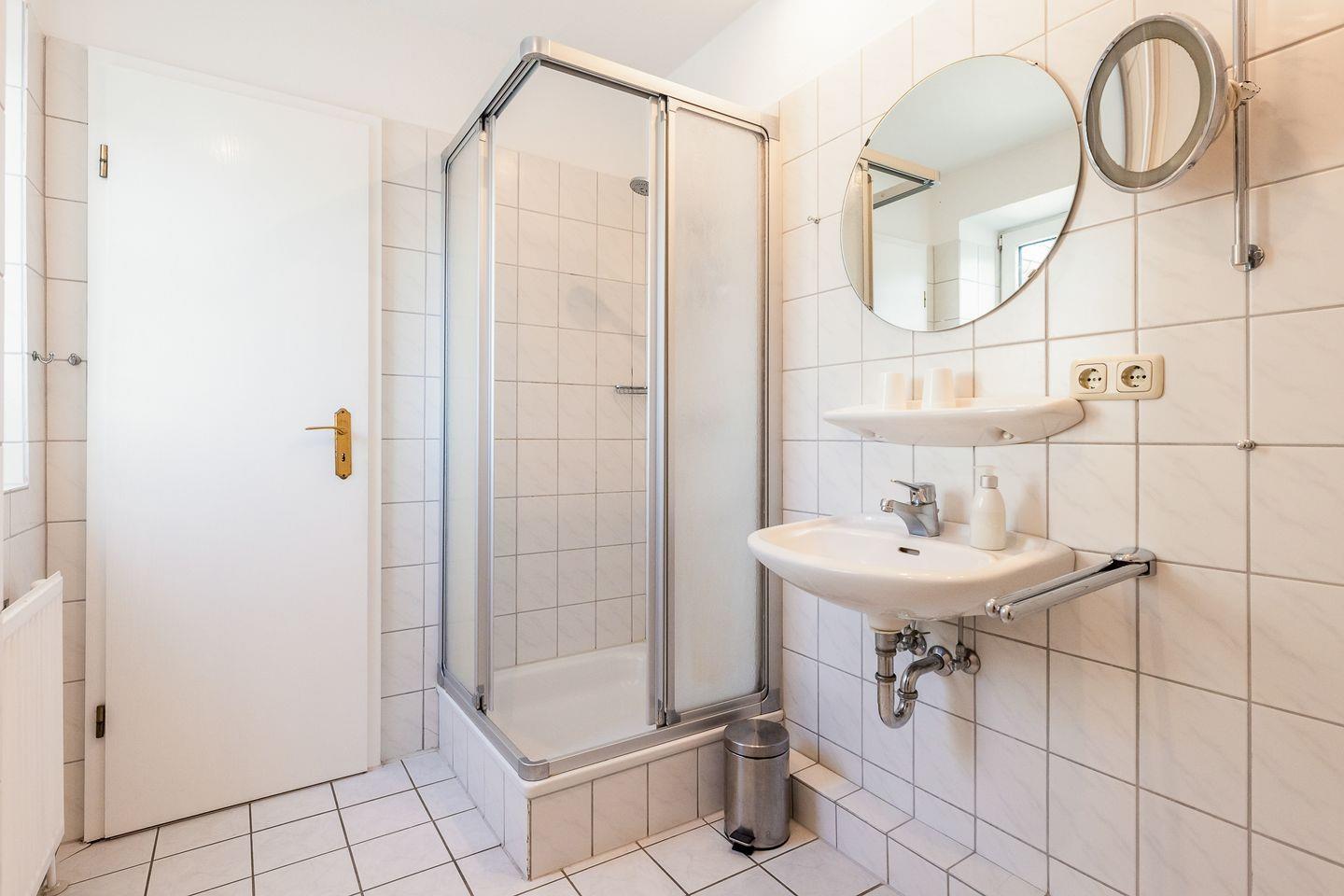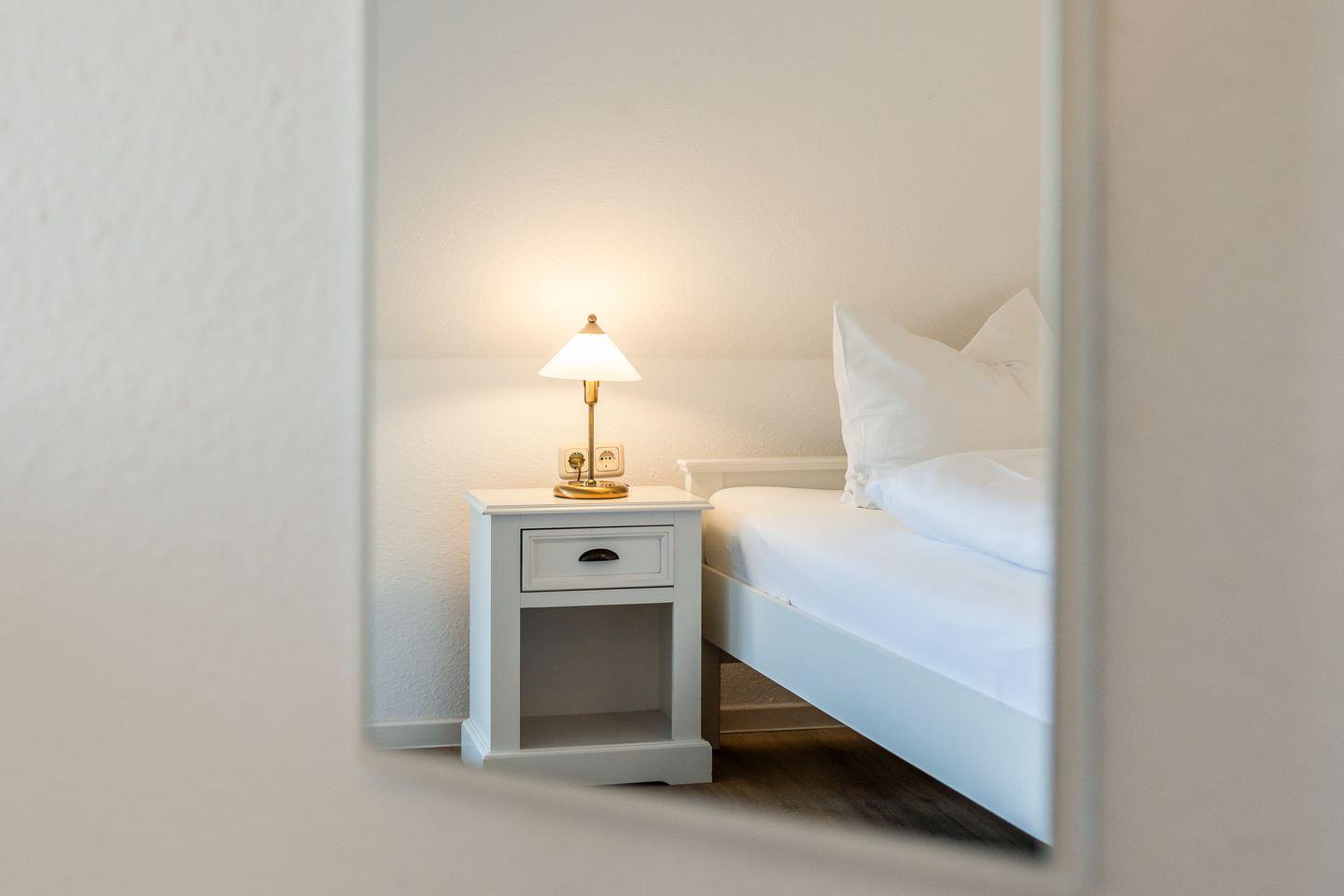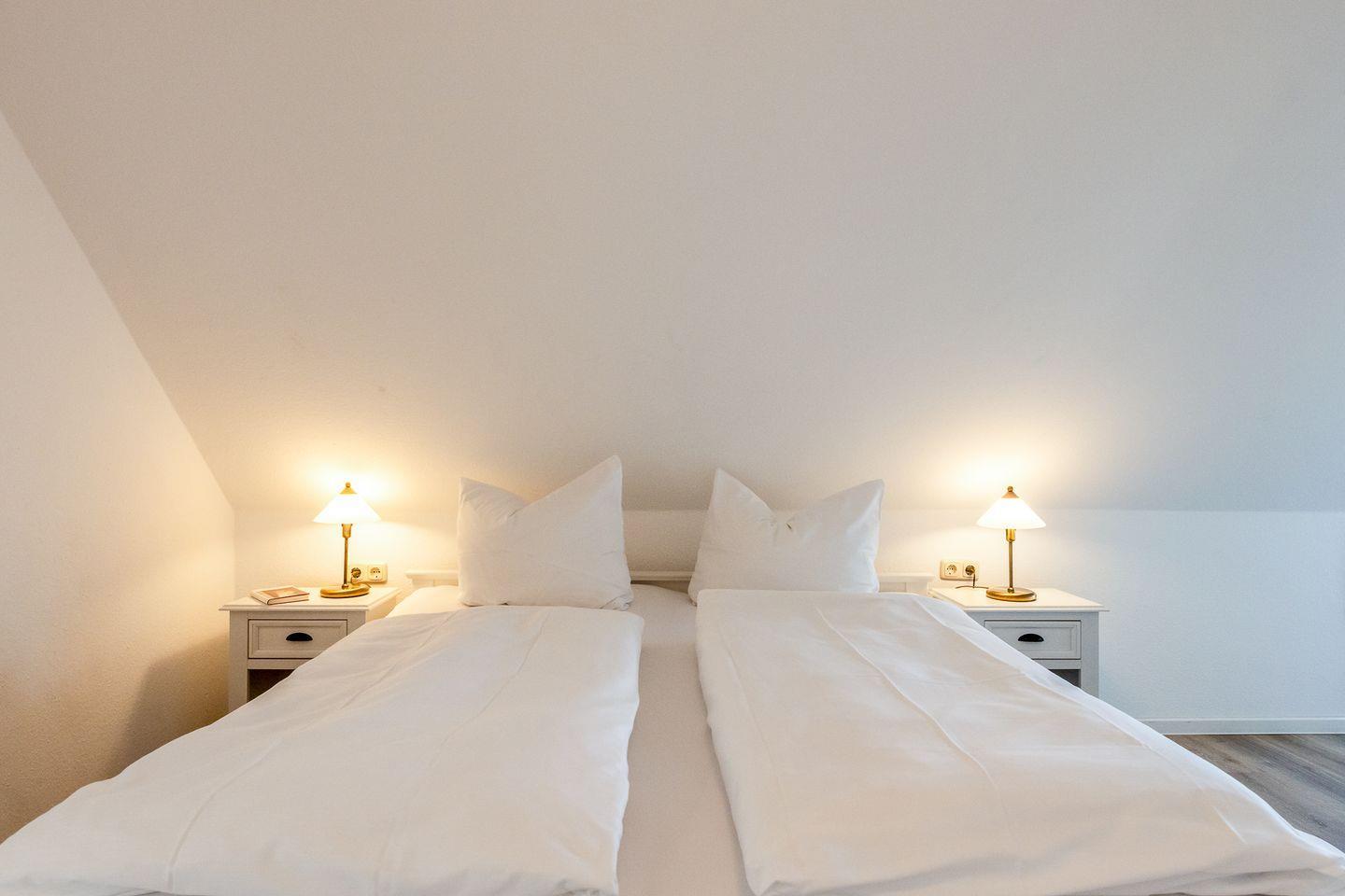 Das Schlafzimmer mit Doppelbett ist ebenfalls in puristischem Weiß gehalten und als Kontrast wurde frisches Blau für die Gardinen gewählt. Im angrenzenden Bad gibt es eine Dusche und ein Fenster für optimales Tageslicht.