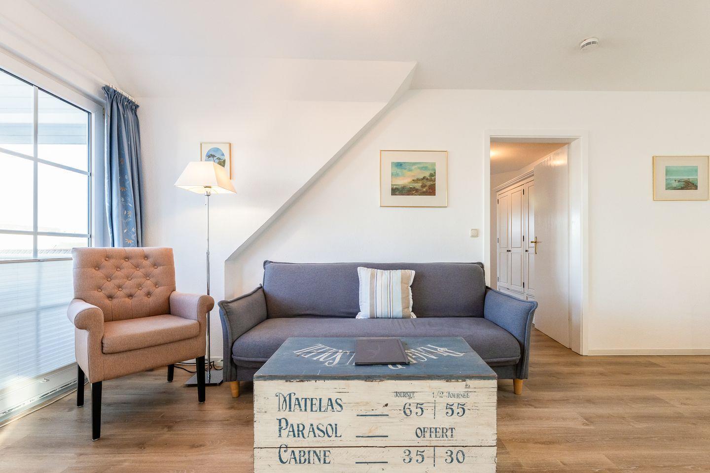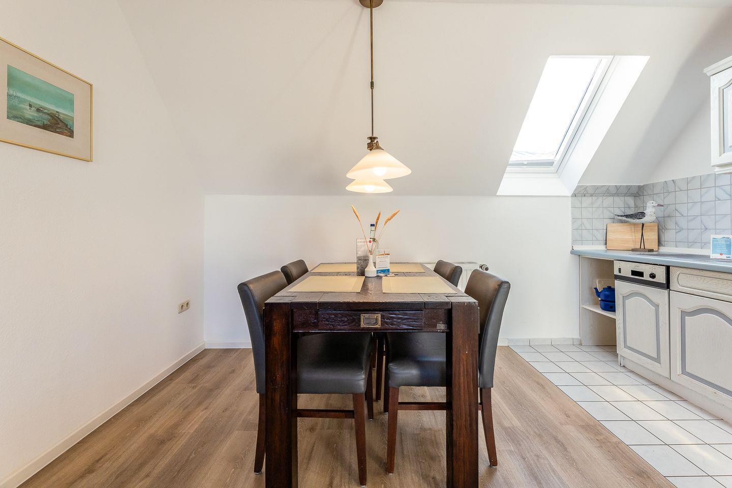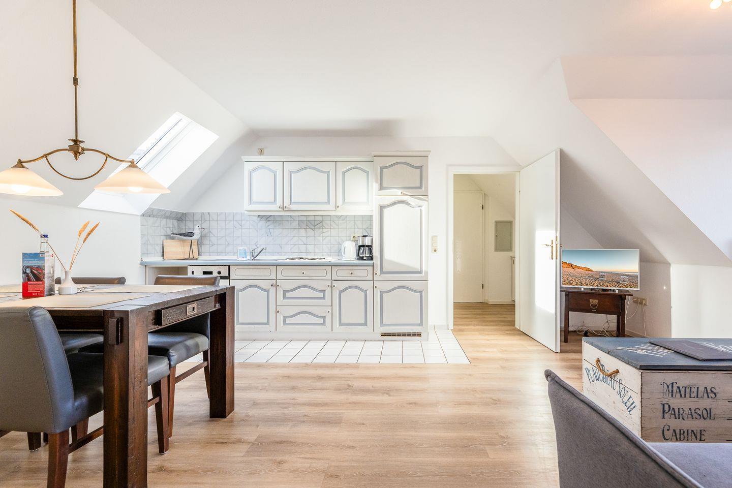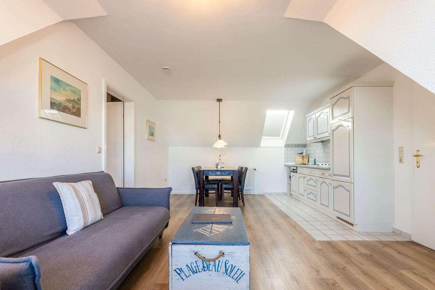 Der große Wohn- und Essbereich wirkt aufgeräumt und dennoch einladend. Dunkler Designboden, weiße Wände und Möbel sowie Accessoires in gedeckten Farben sorgen für ein harmonisches Bild. Eine Couch zum Chillen, ein Esstisch und eine Küchenzeile im typisch friesischen Stil finden hier zusammen. Schön: der kleine Balkon für den Sundowner am Abend.