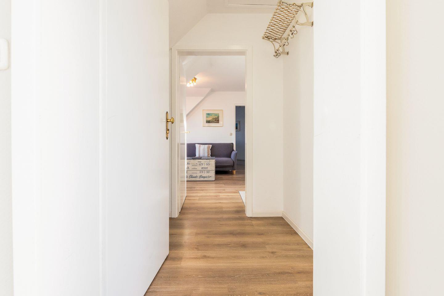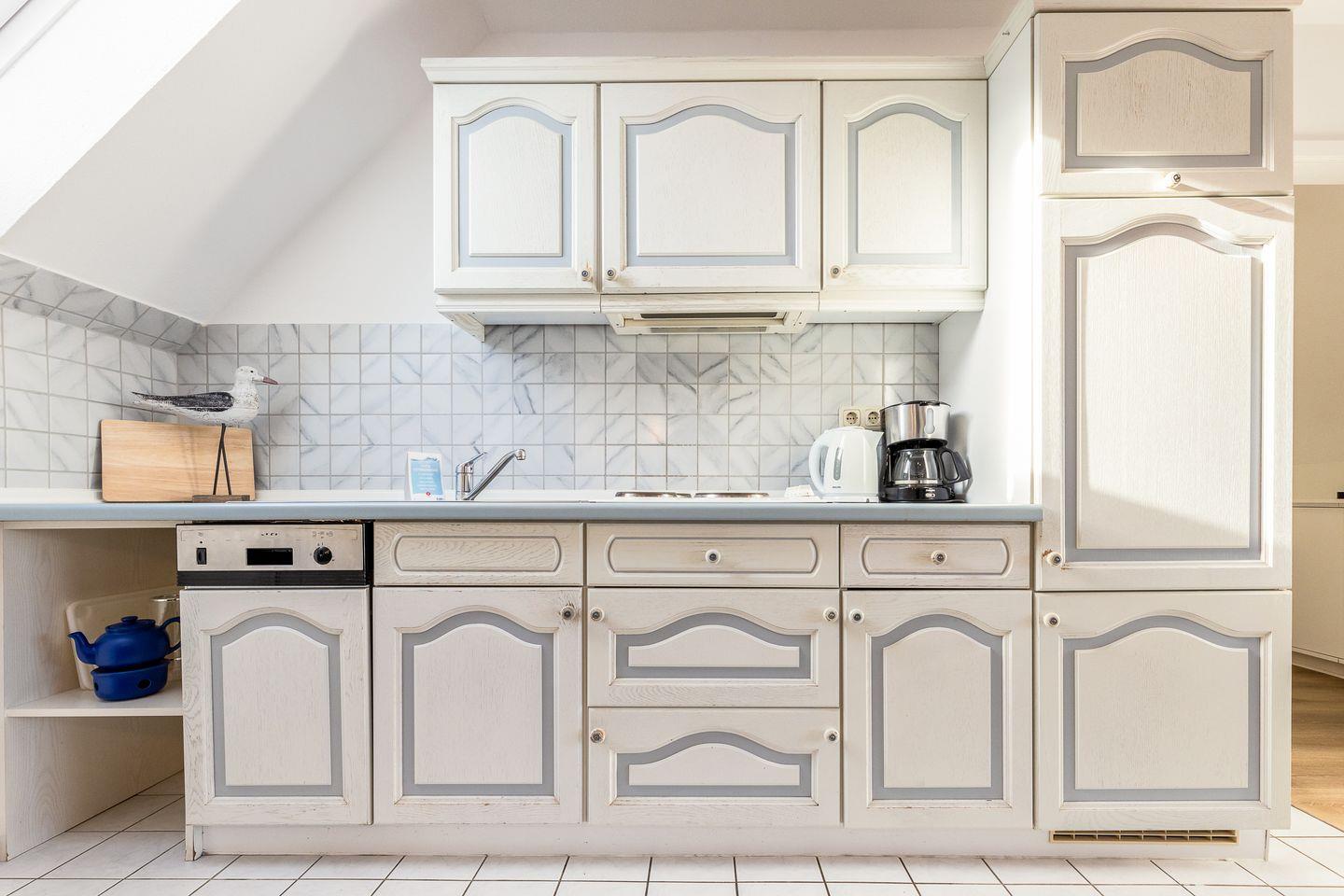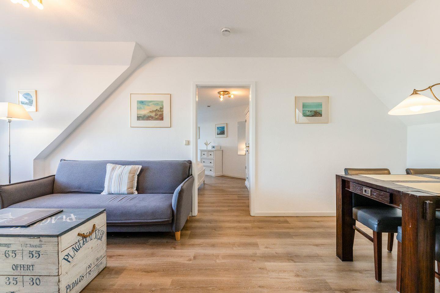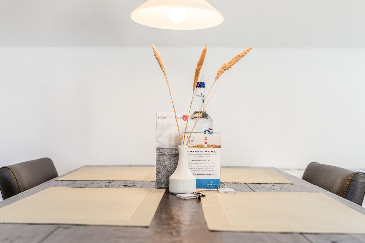 Der große Wohn- und Essbereich wirkt aufgeräumt und dennoch einladend. Dunkler Designboden, weiße Wände und Möbel sowie Accessoires in gedeckten Farben sorgen für ein harmonisches Bild. Eine Couch zum Chillen, ein Esstisch und eine Küchenzeile im typisch friesischen Stil finden hier zusammen. Schön: der kleine Balkon für den Sundowner am Abend.