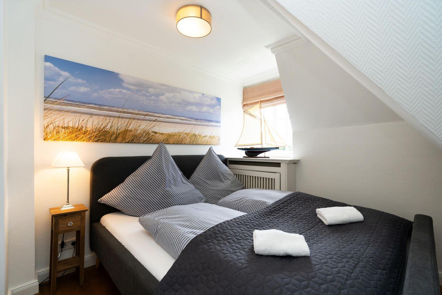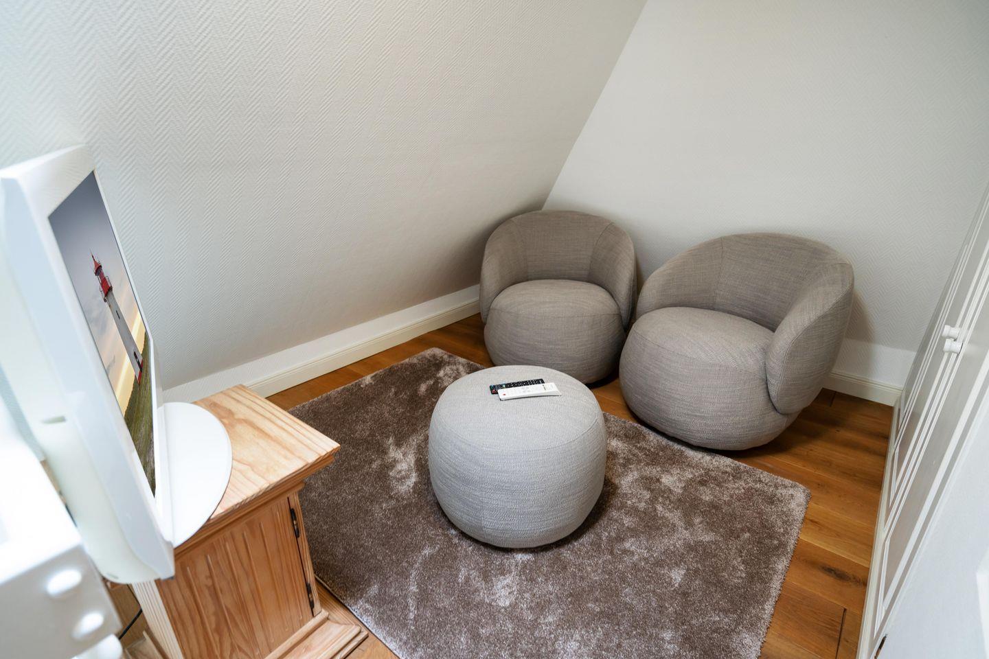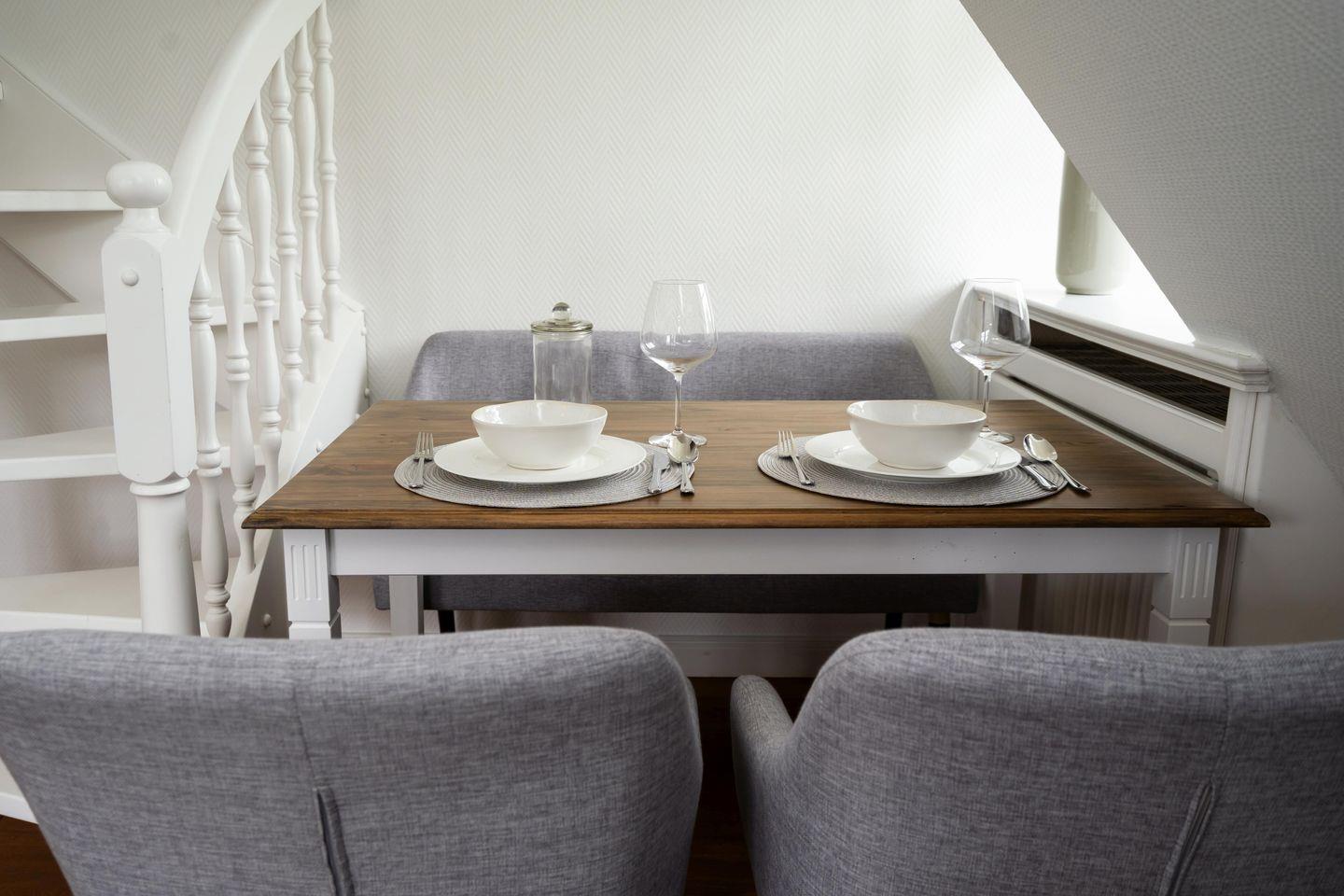 In einem wunderschönen Apartmenthaus unter Reet befindet sich das „Friesenstübchen“ im 1. Obergeschoss. Über zwei Etagen mixt sich Modernität mit verwinkelter Gemütlichkeit. Das Schlafzimmer verfügt über ein Doppelbett (160x200 cm) und genügend Stauraum für einen Inselurlaub. Das moderne Duschbad ist mit einem großen Spiegel, einem WC sowie einem Haartrockner ausgestattet. Eine Mini Waschmaschine für kleine Waschvorgänge steht Ihnen ebenfalls zur Verfügung. Der offene Wohnbereich lädt zum gemeinsamen Verweilen ein. Die angrenzende Küchenzeile ist voll ausgestattet. Über eine Treppe gelangen Sie ins Dachgeschoss, in dem sich eine gemütliche Sitzecke mit zwei Sesseln und einem Fernseher befindet. Zusätzlich steht ein Bett (140x200 cm) als weitere Schlafmöglichkeit für ein Kind zur Verfügung. Ein zugehöriger PKW-Stellplatz sowie kostenfreies WLAN sind inklusive. Haustiere sind erlaubt. Der Hauseingang befindet sich auf der Ostseite des Hauses.