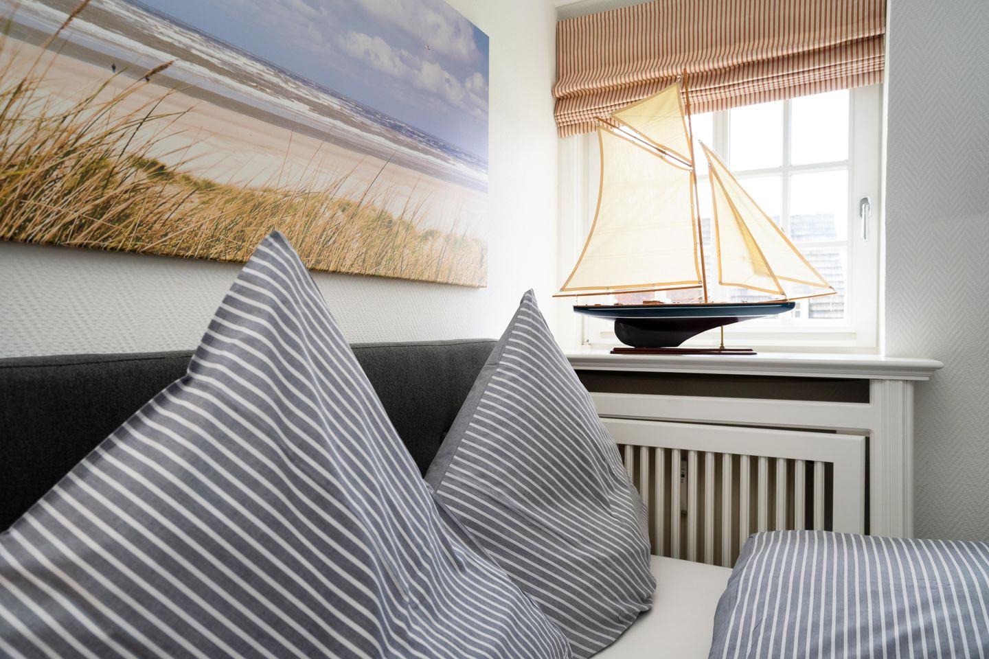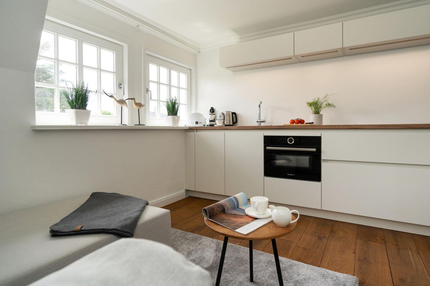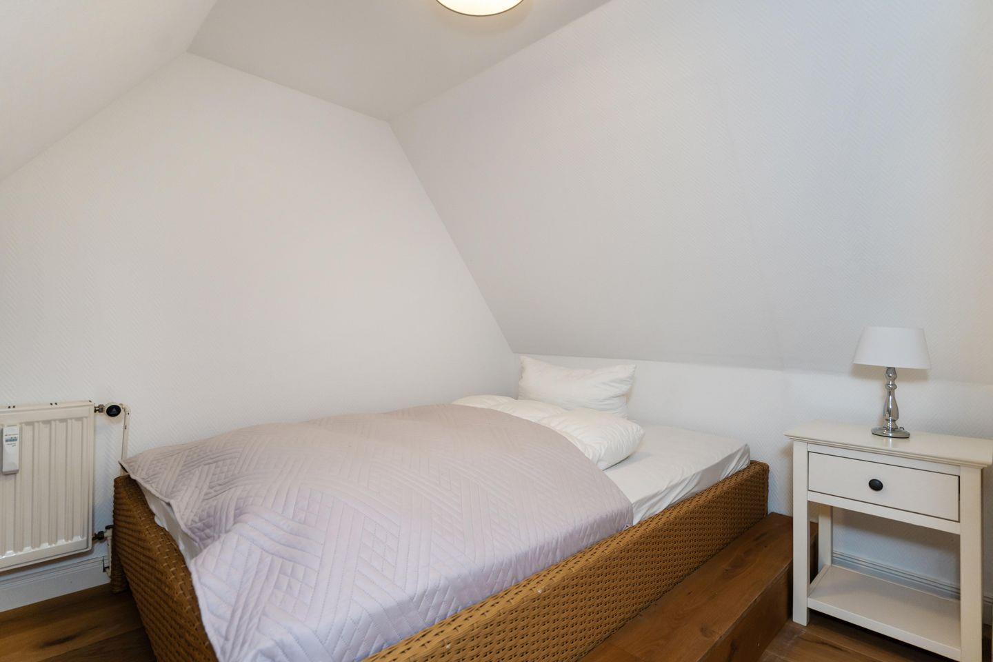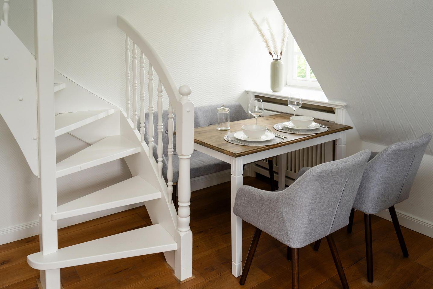 In einem wunderschönen Apartmenthaus unter Reet befindet sich das „Friesenstübchen“ im 1. Obergeschoss. Über zwei Etagen mixt sich Modernität mit verwinkelter Gemütlichkeit. Das Schlafzimmer verfügt über ein Doppelbett (160x200 cm) und genügend Stauraum für einen Inselurlaub. Das moderne Duschbad ist mit einem großen Spiegel, einem WC sowie einem Haartrockner ausgestattet. Eine Mini Waschmaschine für kleine Waschvorgänge steht Ihnen ebenfalls zur Verfügung. Der offene Wohnbereich lädt zum gemeinsamen Verweilen ein. Die angrenzende Küchenzeile ist voll ausgestattet. Über eine Treppe gelangen Sie ins Dachgeschoss, in dem sich eine gemütliche Sitzecke mit zwei Sesseln und einem Fernseher befindet. Zusätzlich steht ein Bett (140x200 cm) als weitere Schlafmöglichkeit für ein Kind zur Verfügung. Ein zugehöriger PKW-Stellplatz sowie kostenfreies WLAN sind inklusive. Haustiere sind erlaubt. Der Hauseingang befindet sich auf der Ostseite des Hauses.
