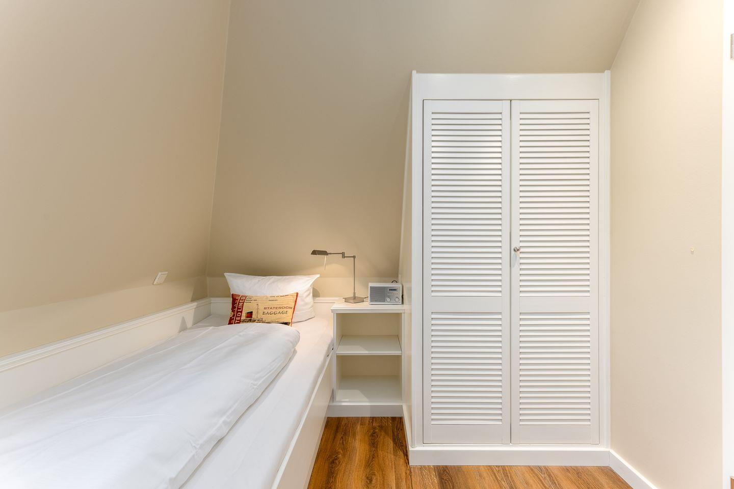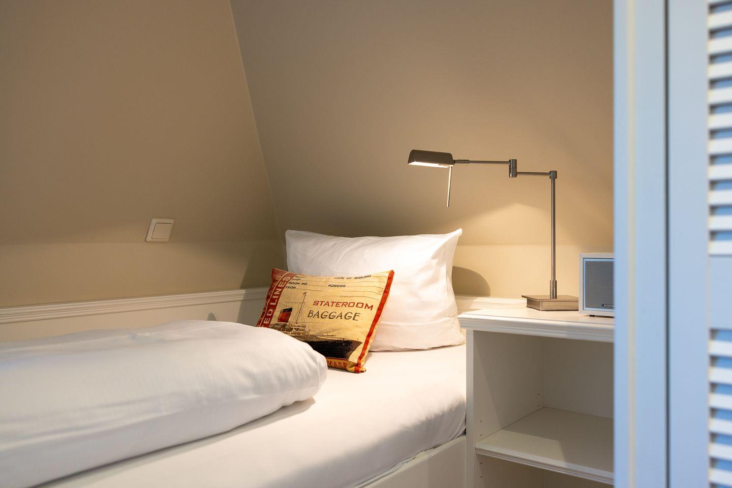Hier wurde alles passgenau vom Tischler angefertigt und somit ist ein großartiges kleines Wohlfühlzimmer entstanden. Das gemütliche Einzelbett hat etwas von einem Allkoven und verfügt über eine rückenfreundliche Matratze und Blick auf den Fernseher. Ein Einbauschrank bietet genug Platz für die Urlaubsgarderobe. In dem modernen Duschbad werden mit Sand und Weiß sanfte Töne angeschlagen und der Start in der Tag könnte kaum besser beginnen als hier. Wer nicht viel, aber dafür einen behaglichen Platz sucht, ist im Seabreeze genau richtig.