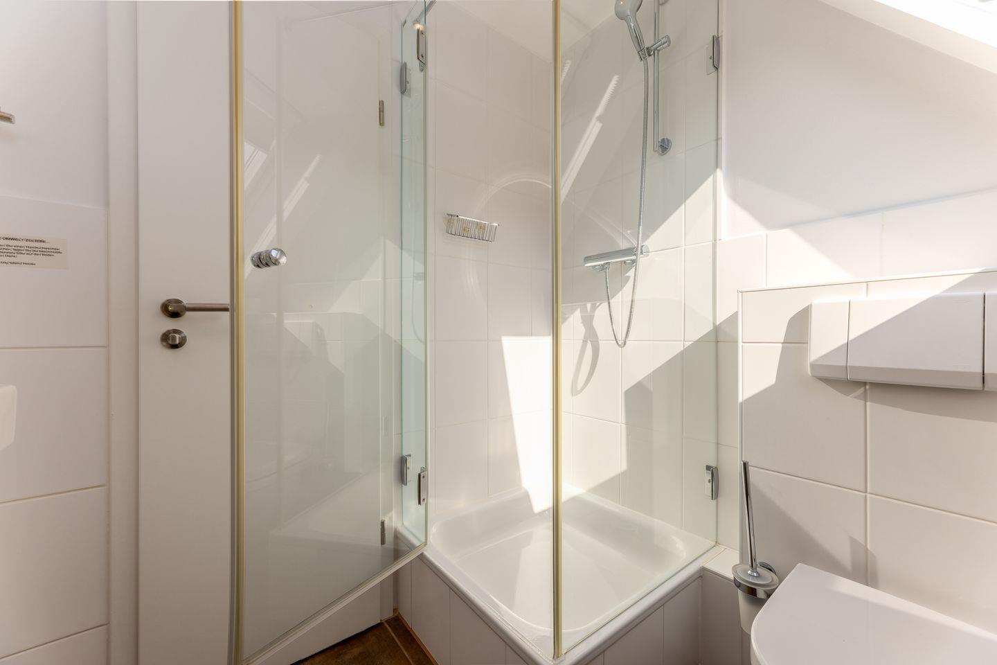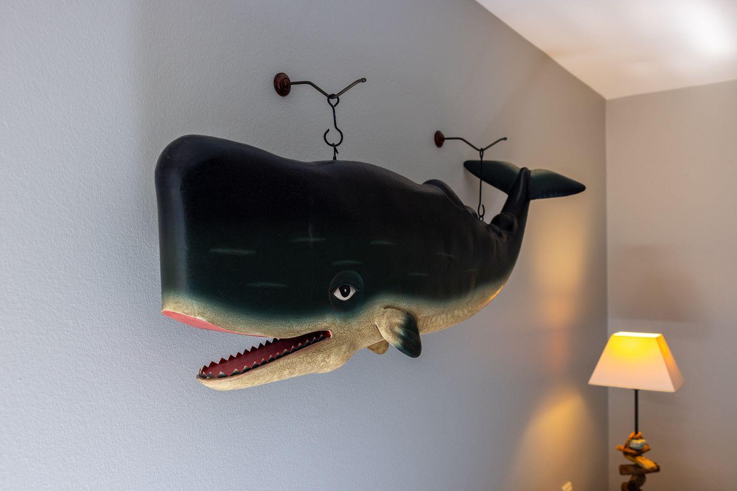 Ganz viel Gemütlichkeit in nur einem Raum. Herzstück hier ist das samtige Polsterbett über dem ein Wal über den Schlaf wacht. Rundherum haben sich ein Tisch mit Stühlen sowie eine Kommode nebst TV versammelt. Im Flur dann ein geräumiger Einbauschrank und abschließend noch das helle und moderne Duschbad. Mehr braucht es nicht zum Wohlfühlen. Zusammengefasst das perfekte Zimmer für eine kleine Auszeit auf Sylt!