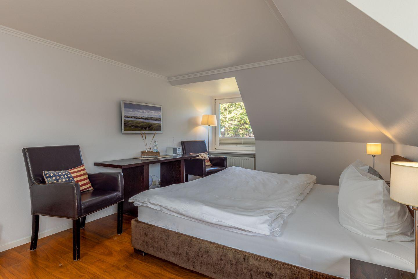 Hier wurde alles passgenau vom Tischler angefertigt und somit ist ein gemütliches Wohlfühldomizil entstanden. Das komfortable Polsterbett verfügt über eine rückenfreundliche Matratze und Blick auf den Fernseher. Ein Einbauschrank bietet genug Platz für die Urlaubsgarderobe und eine kleine Sitzgelegenheit gibt es ebenfalls. In dem hellen und modernen Duschbad werden mit Sand und Weiß sanfte Töne angeschlagen. Hier lässt es sich wunderbar in den Tag starten, bevor es ans Erkunden der Insel geht. Zusammengefasst das perfekte Zimmer für eine kleine Auszeit auf Sylt!