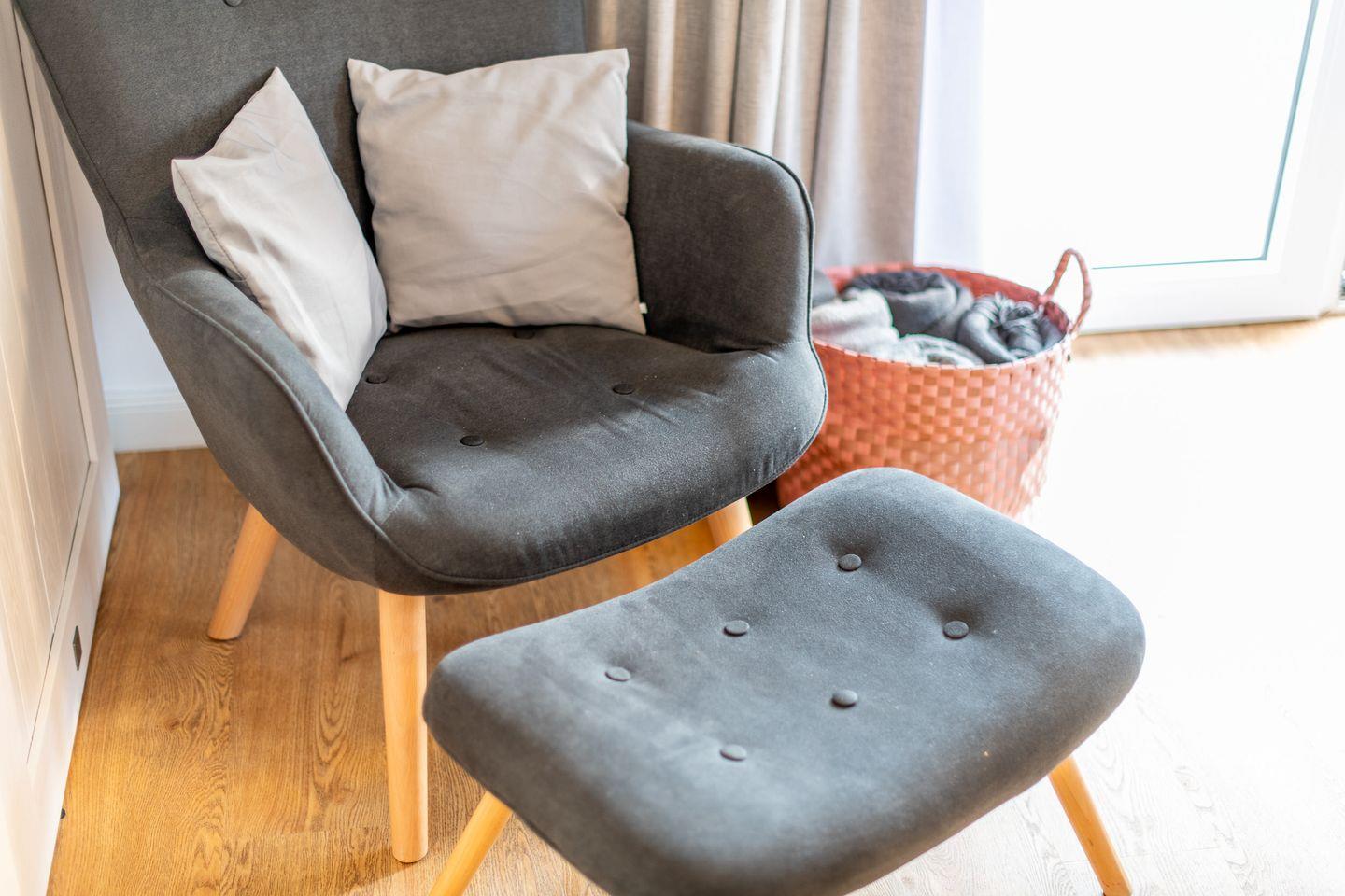 Ein Flur mit Garderobe und Sessel sorgt für zusätzlichen Komfort. Die Wohnung verfügt über einen Pkw-Stellplatz, und im Haus stehen eine Waschmaschine und ein Trockner zur Verfügung. WLAN (ohne Gewähr) ist ebenfalls vorhanden.
