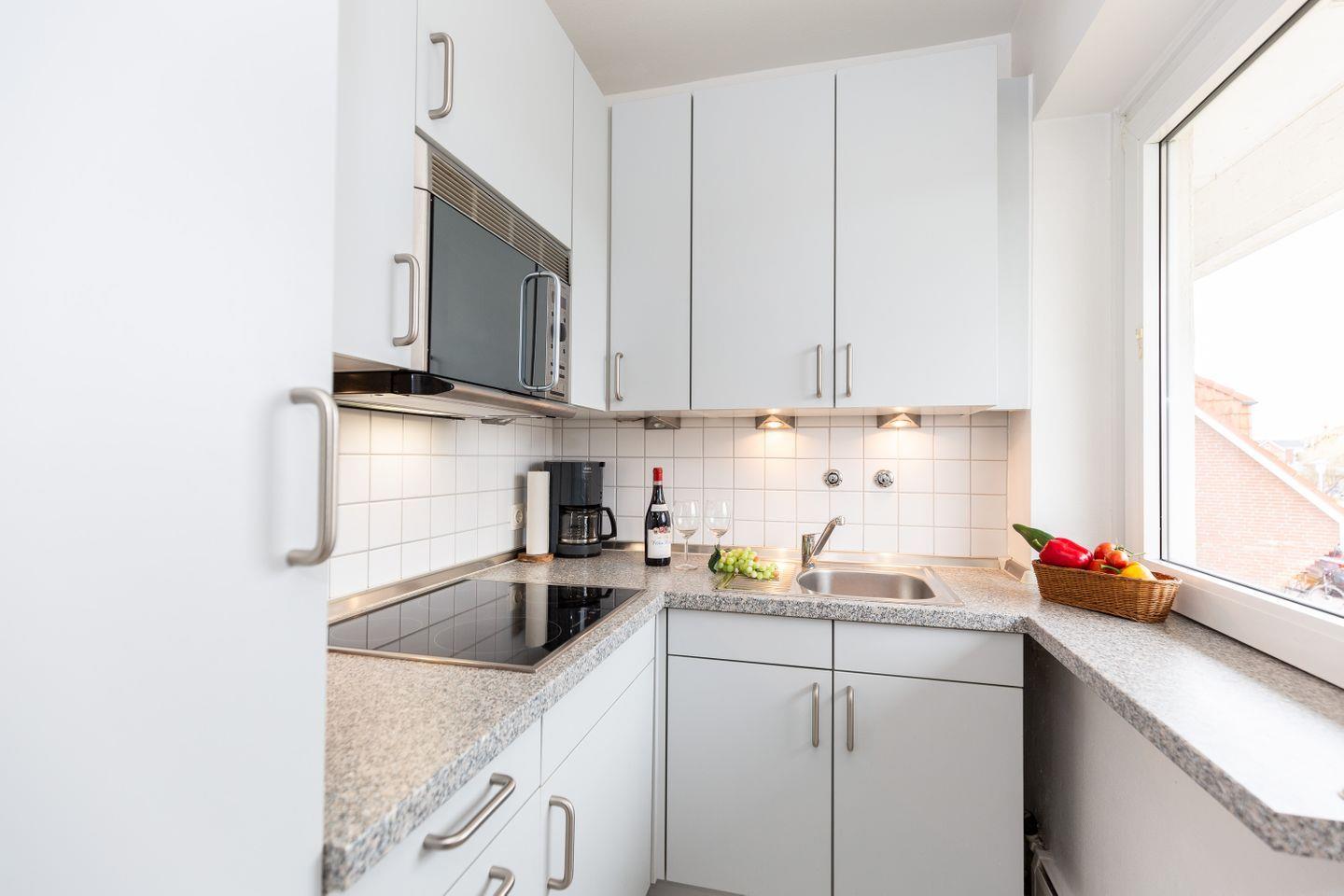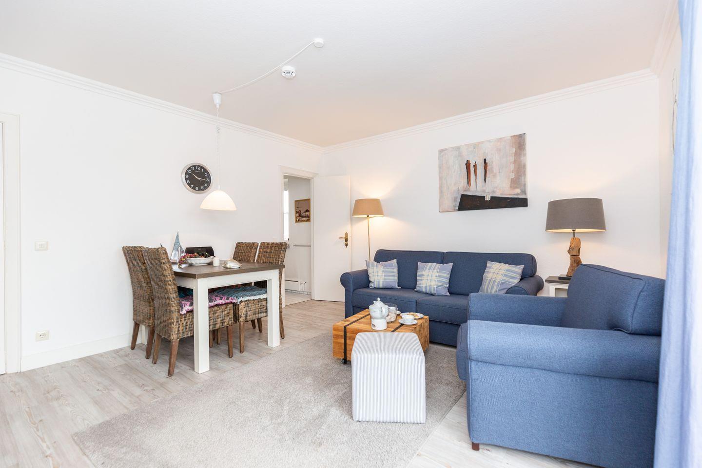 Helle ca. 42 m² große 2-Zimmer Ferienwohnung für bis zu 2 Personen mit schönem Frühstücksbalkon in einer stadt- und strandnahen Lage von Alt-Westerland. Inklusive WLAN und zugehörigem PKW-Stellplatz (klein).