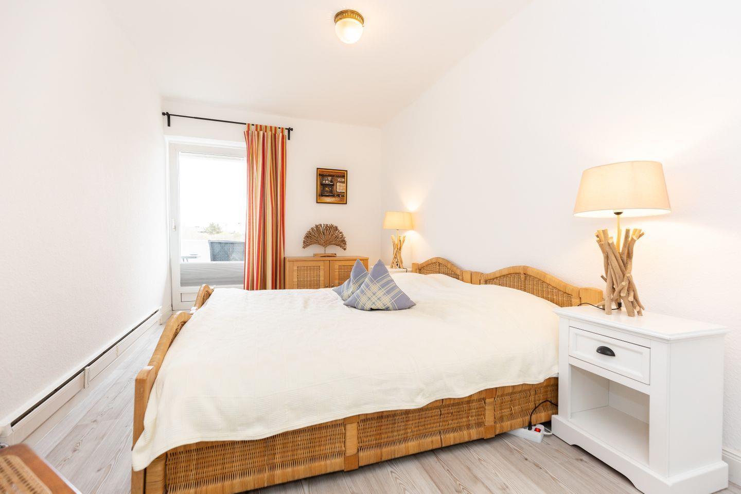 Die schöne ca. 42 m² große 2-Zimmer Ferienwohnung "Jamé" für bis zu 2 Personen befindet sich in einer ruhigen Wohngegend in Alt-Westerland. Sowohl Westerlands Innenstadt als auch der Weststrand sind fußläufig schnell erreichbar. Der helle Wohnbereich lädt durch seine gemütliche Couch-/ Sesselkombination und dem Essbereich zum gemeinsamen Verweilen ein. Die angrenzende Küche samt Cerankochfeld, Kühlschrank und Mikrowelle mit Backfunktion lässt sich durch eine Tür zum Wohnbereich separieren. Genießen Sie beim Frühstück die Morgensonne auf dem schönen Ostbalkon. Das großzügige Schlafzimmer ist ebenfalls hell gestaltet und verfügt über ein Doppelbett sowie genügend Stauraum für einen Sylt-Urlaub. Im Badezimmer finden Sie eine Badewanne mit Duschfunktion vor. Kostenloses WLAN, ein zugehöriger (kleiner) PKW-Stellplatz sowie ein gemeinschaftlicher Waschraum (gebührenpflichtig) stehen Ihnen zur Verfügung. Haustiere sind nicht erlaubt.