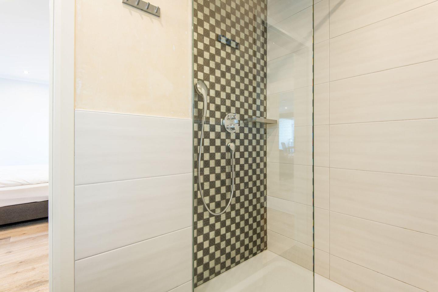 Das großzügige Badezimmer verfügt über eine große Walk-In-Dusche und ein Fenster, das viel Tageslicht hereinlässt – ideal für einen frischen Start in den Tag.