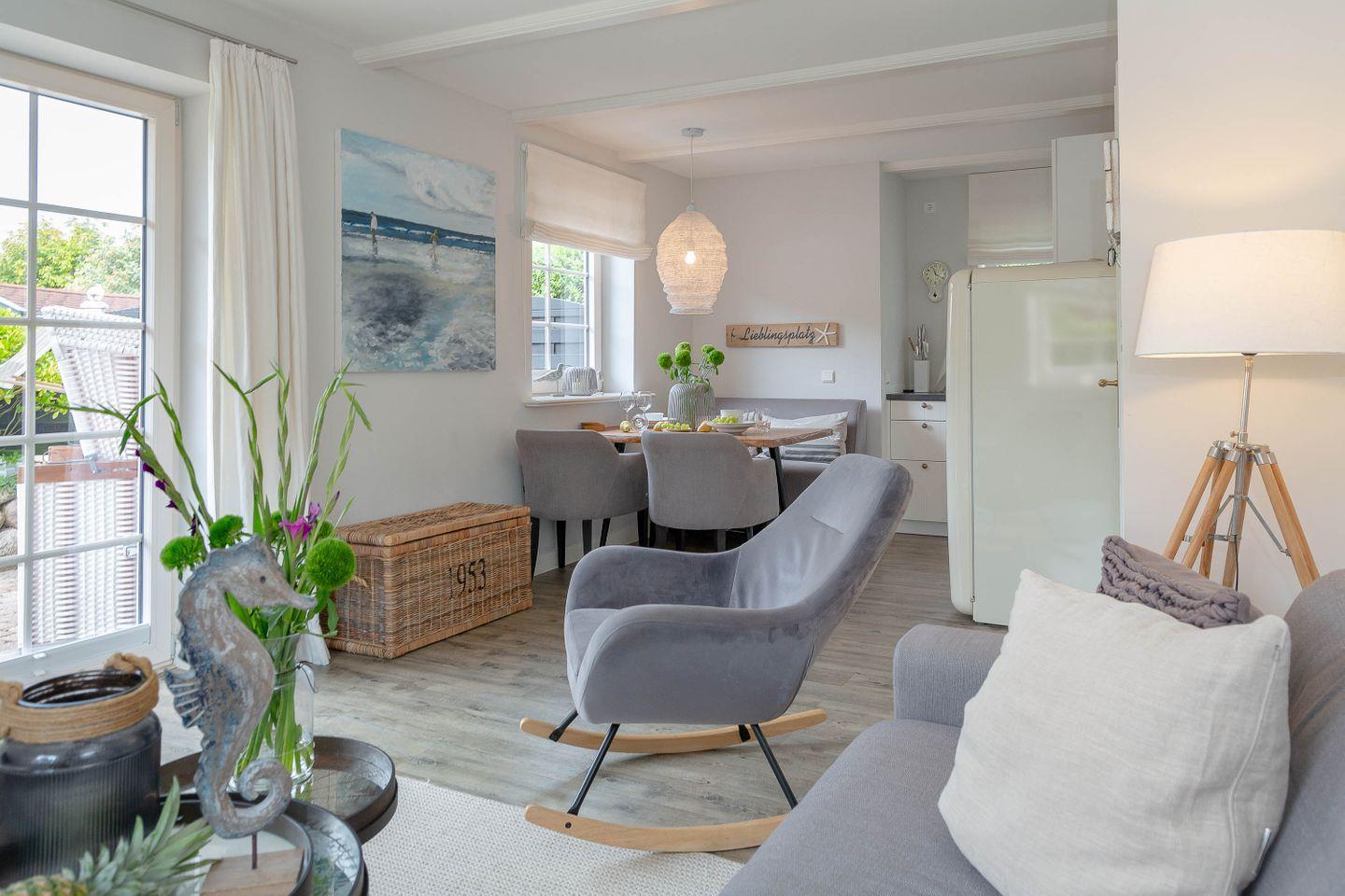 Ein echtes Highlight ist die private Terrasse, auf der Sie das milde Klima Sylt's unter freiem Himmel auskosten können. Die Terrasse ist mit komfortablen Gartenmöbeln ausgestattet, und ein Strandkorb wartet darauf, dass Sie sich hineinsetzen und die frische Nordseeluft genießen. Die grüne Umgebung des Hauses mit Blick in den Garten bringt eine entspannende Atmosphäre mit sich und lädt zu erholsamen Stunden im Freien ein.