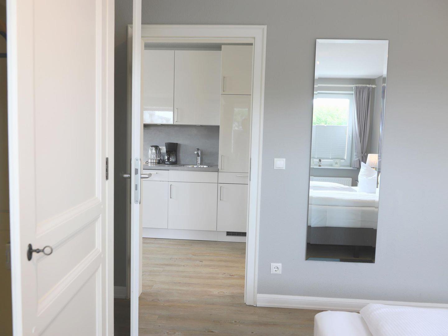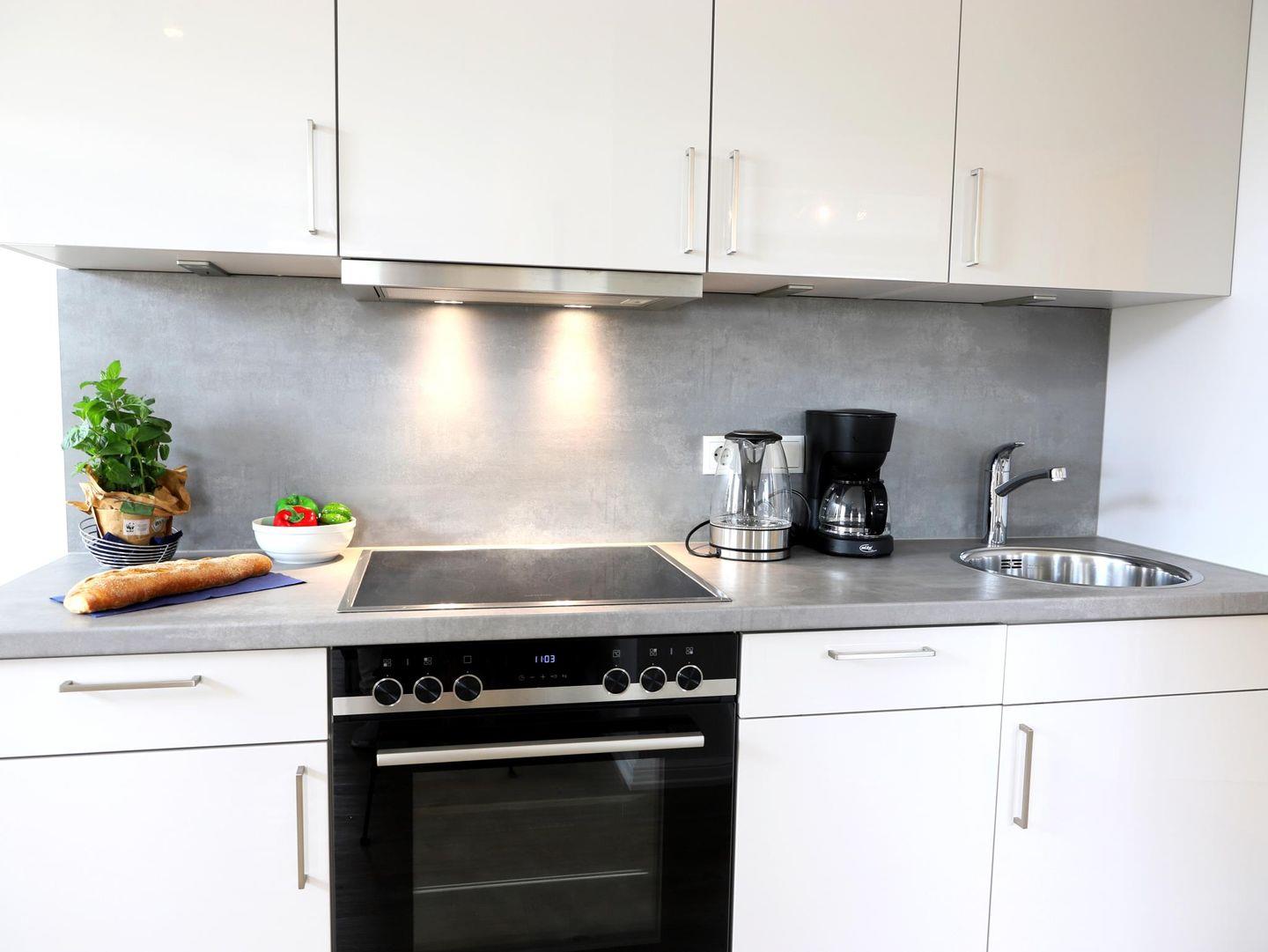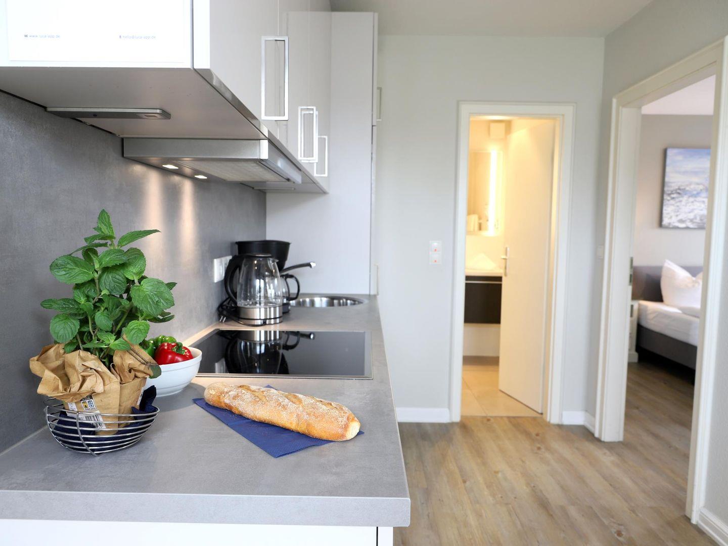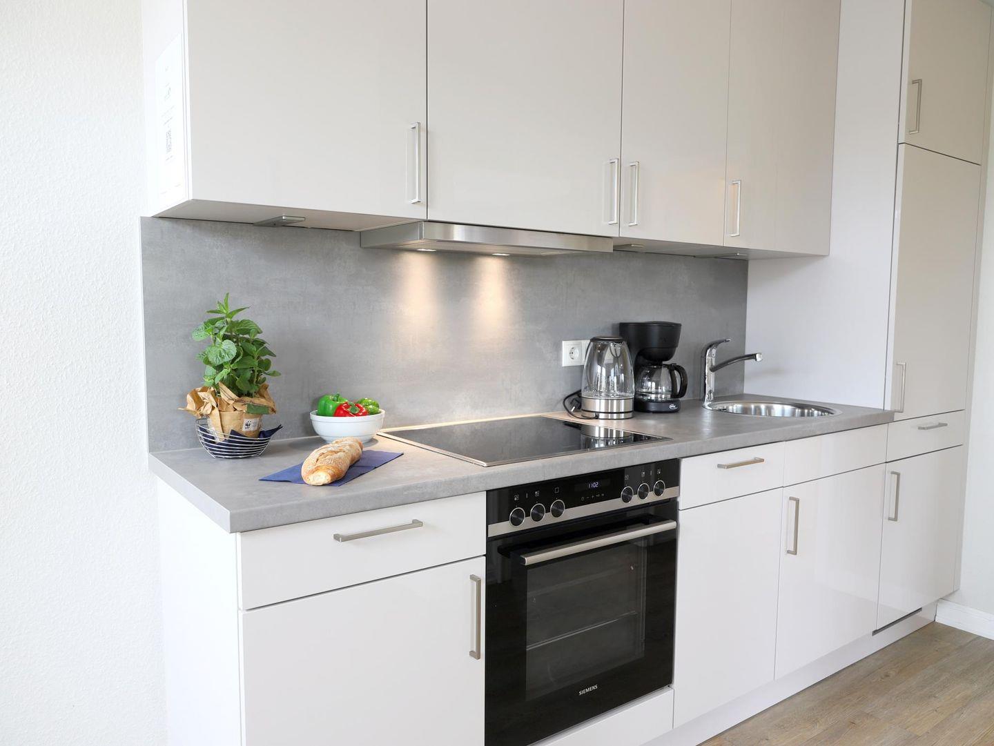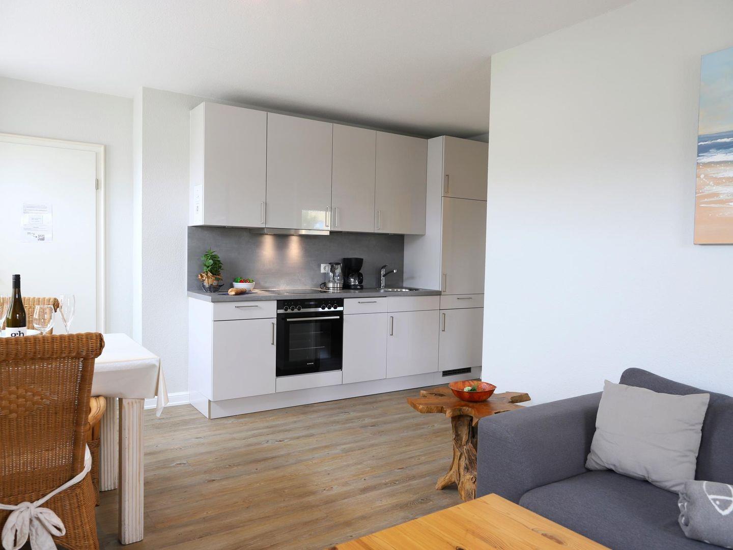 Helle 2-Zimmer-Wohnung in Westerland mit indirektem Stellplatz und Hund erlaubt. Nur wenige Minuten zum Strand. Ideal für 2 Personen, mit Doppelbett und moderner Küche.