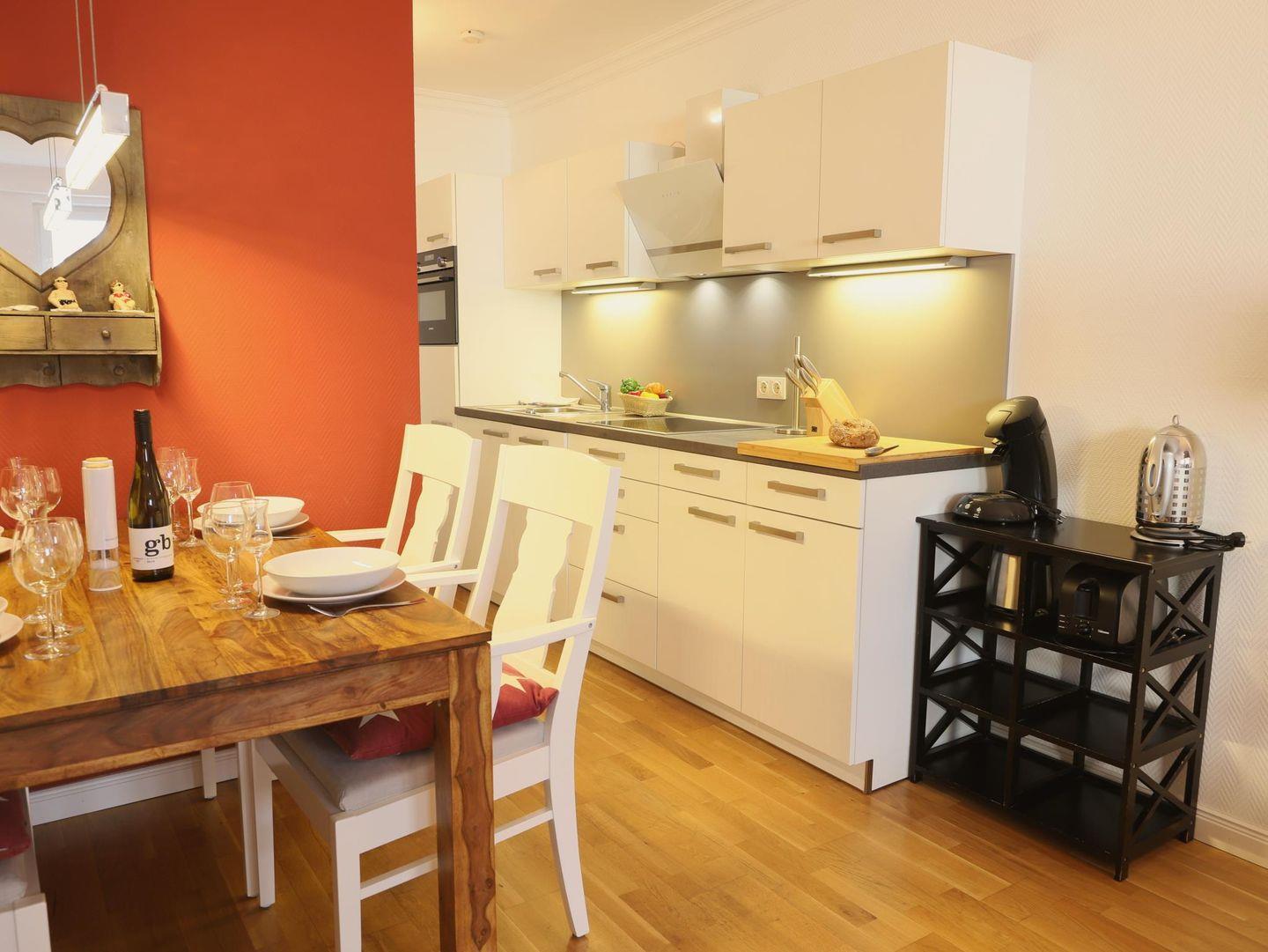35 m² großes, hochwertig eingerichtetes Appartement für 3 Personen. Wohnzimmer mit Schlafsofa (140 x 200 cm) und Doppelbett (180 x 200 cm), voll ausgestattete Küche, Duschbad. Haustiere auf Anfrage. Trockner und Waschmaschine im Haus, viele Extras für Ihren Komfort.
