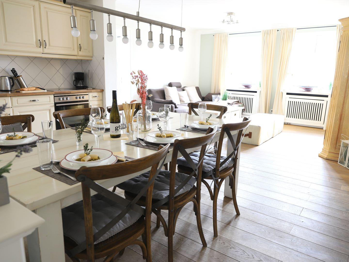 Dieses stilvolle, luxuriös ausgestattete Ferienhaus in Westerland auf Sylt bietet mit ca. 85 m² und einem eigenen Garten alles für einen komfortablen Aufenthalt für bis zu 6 Personen. Im großzügigen Wohnzimmer erwartet Sie eine gemütliche Couchgarnitur, ein Flatscreen-TV und eine Stereoanlage. Die offene, moderne Küche mit Ceranfeld, Backofen und Geschirrspüler ist perfekt für gemeinsame Mahlzeiten im angrenzenden Essbereich. Das Appartement umfasst drei komfortable Schlafzimmer: eines mit einem Doppelbett (180 x 200 cm) und zwei weitere mit Doppelbetten (je 160 x 200 cm), alle mit eigenem Flatscreen-TV. Zwei Badezimmer stehen zur Verfügung: eines mit Dusche und WC und das andere mit Badewanne, Dusche und WC. Ein separater Eingang und der eigene Garten mit Strandkorb sorgen für zusätzliche Privatsphäre. Ein kostenfreier Stellplatz ist vorhanden, und Haustiere sind erlaubt. Genießen Sie Ihren Urlaub in dieser Nichtraucherwohnung.
