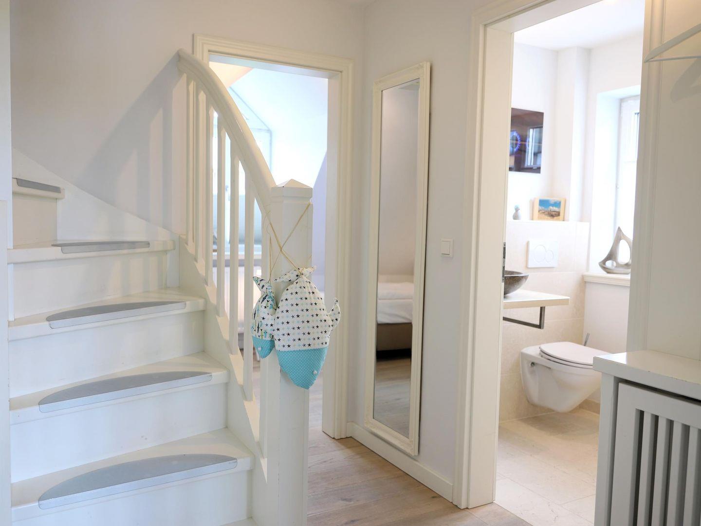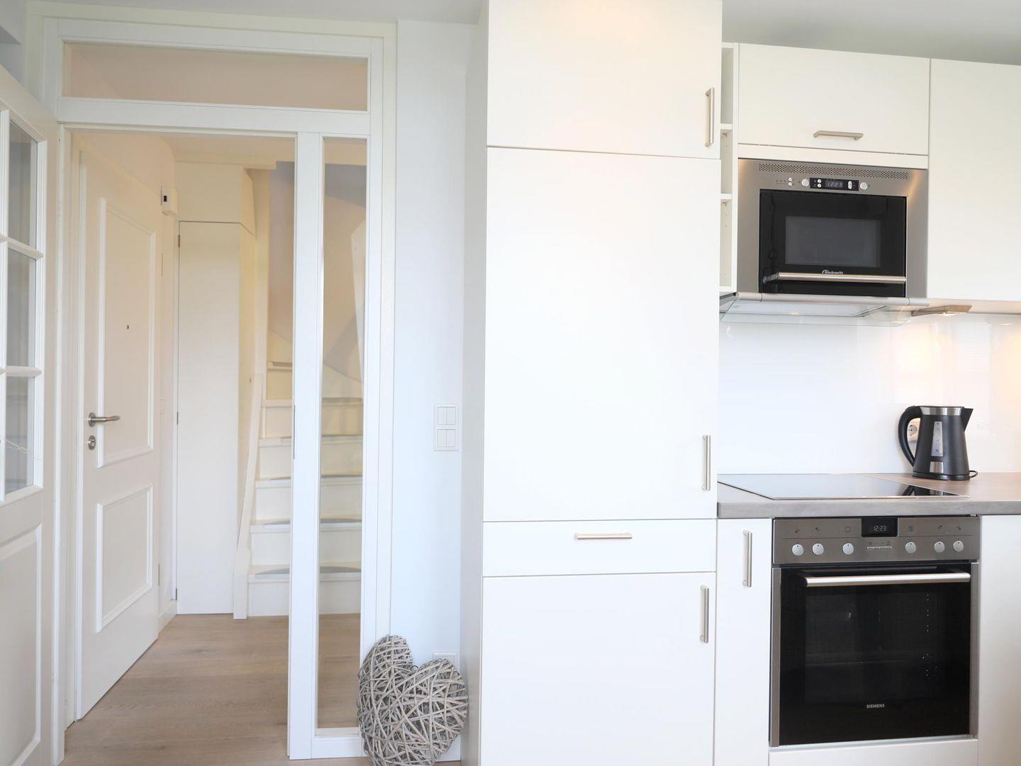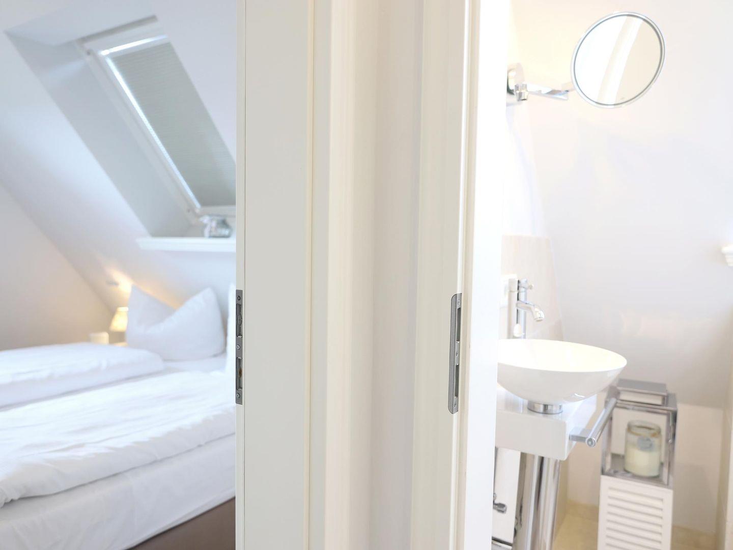 Diese exklusive 3-Zimmer-Ferienwohnung (ca. 52 m²) befindet sich hinter den Dünen, nur 200 m vom Strand entfernt. Im Dachgeschoss gelegen, bietet die Wohnung einen Wohnraum mit einer modernen Küchenzeile und Zugang zu einem Westbalkon. Das erste Schlafzimmer ist mit einem Doppelbett (160 x 200 cm) und Kabel-TV ausgestattet, das zweite Schlafzimmer mit 2 Einzelbetten (80 x 200 cm). Im Obergeschoss befindet sich das zweite Badezimmer sowie ein Doppelbettzimmer mit separatem WC. Die Wohnung ist ideal für einen entspannten Aufenthalt, nur wenige Gehminuten vom Strand, dem Ortszentrum und den Restaurants von Westerland entfernt. Weitere Annehmlichkeiten sind ein kostenfreier Stellplatz, ein Fahrradständer sowie die Möglichkeit, ein Fahrrad zu nutzen (kein garantierter Stellplatz). Im Keller stehen eine Waschmaschine und ein Trockner zur Verfügung. Haustiere sind nicht gestattet.