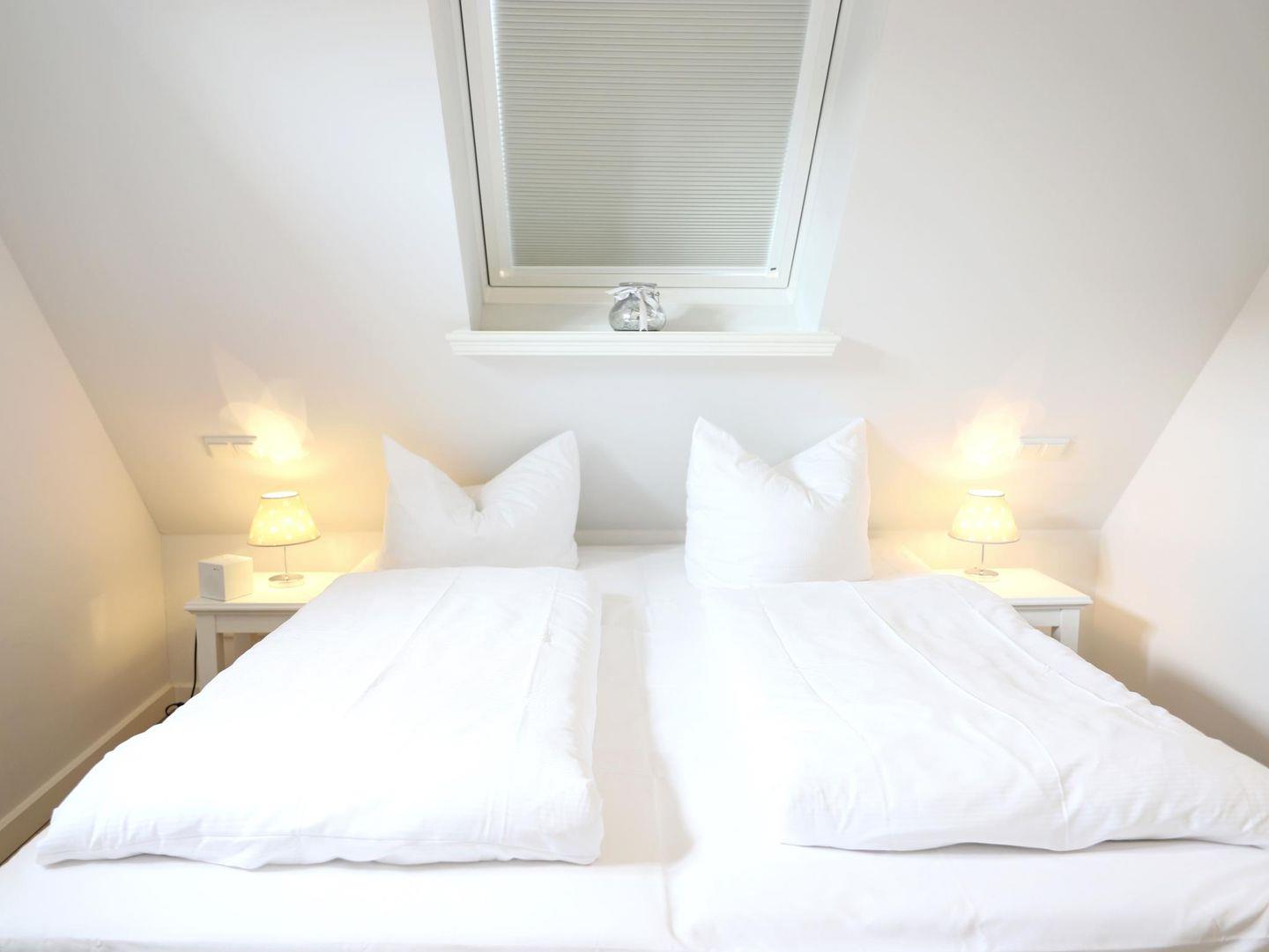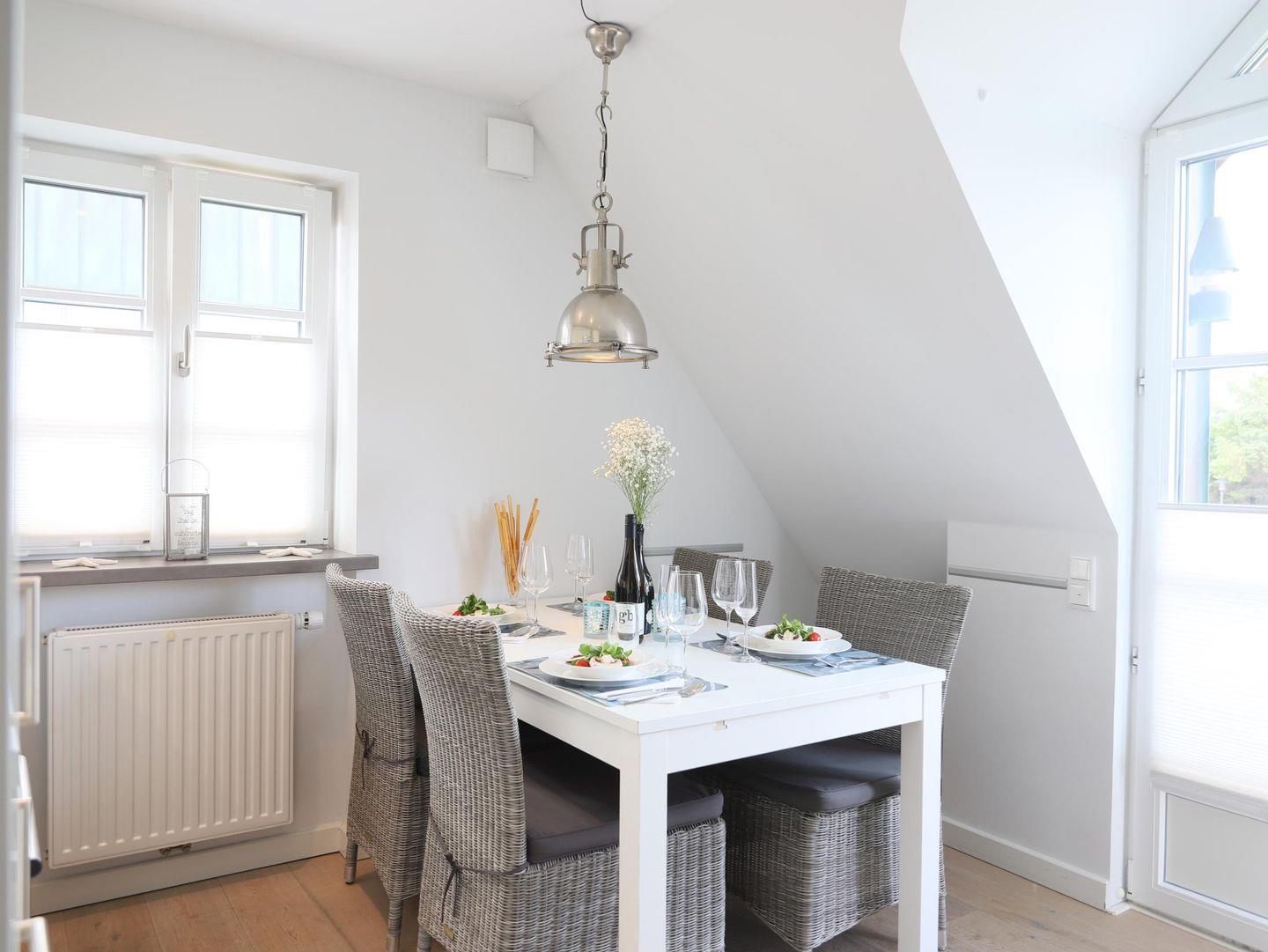 Moderne 3-Zimmer-Ferienwohnung im Dachgeschoss in Westerland (ca. 52 m²) für 4 Personen. 2 Schlafzimmer, 2 Badezimmer, Westbalkon, WLAN, Wohnraum mit Küchenzeile. Strand, Ortszentrum und Gastronomie fußläufig. Haustiere sind nicht gestattet. Kostenfreier Stellplatz.