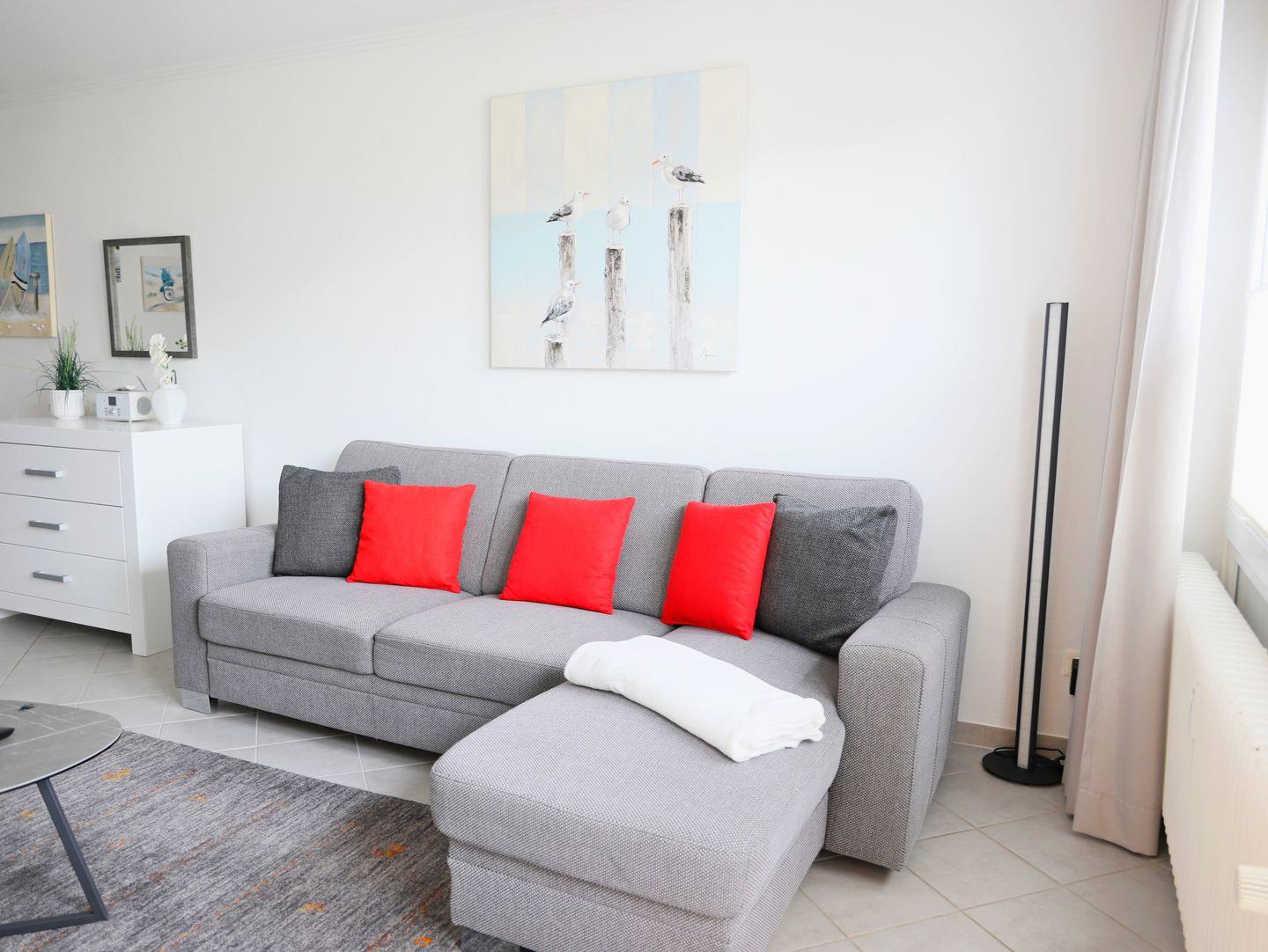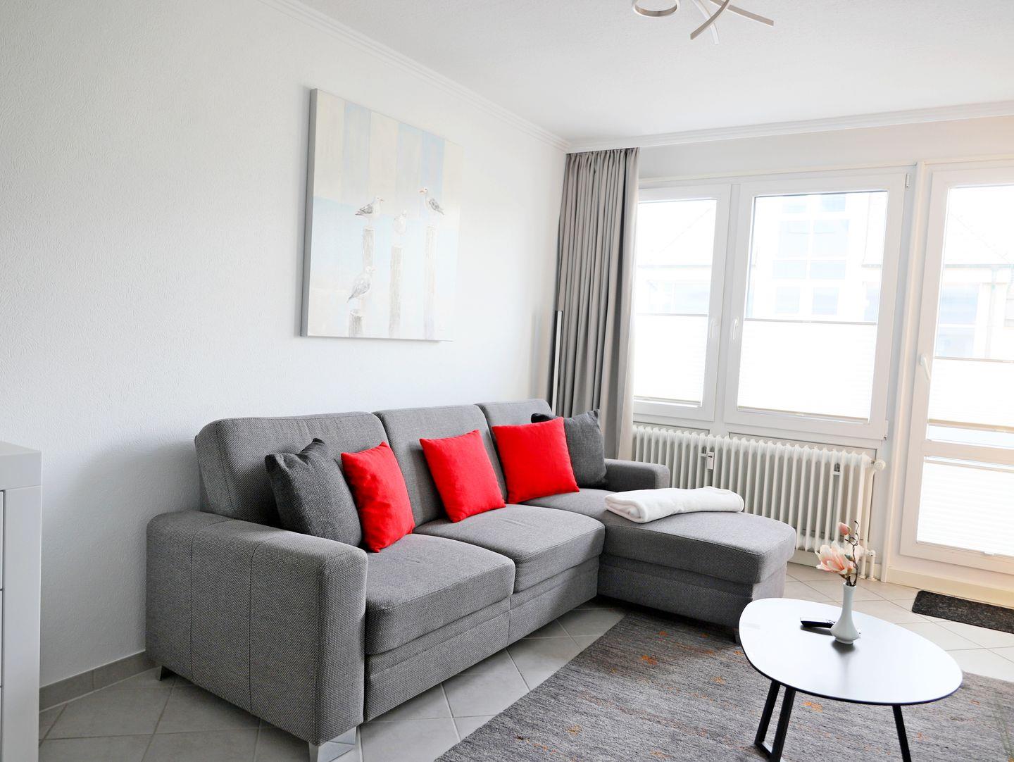 43 m² großes Nichtraucher-Apartment in Westerland für bis zu 3 Personen. Hochwertig ausgestattet mit Schlafcouch und Doppelbett. Süd-Balkon, moderne Küchenzeile, Waschmaschine/Trockner im Haus. WLAN inklusive.