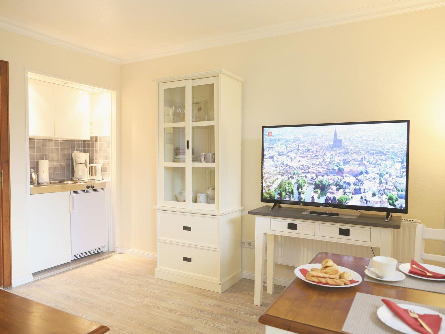 Willkommen in der 2-Zimmer-Ferienwohnung „Amrum“ im Erdgeschoss des Hauses „Am Wäldchen“ in Westerland. Auf 35 m² finden bis zu 4 Personen Platz. Die Einrichtung ist einfach und zweckmäßig – ideal für alle, die eine gute Lage und einen fairen Preis schätzen. Das Wohnzimmer bietet eine Ausziehcouch, WLAN, Flachbild-TV und einen Essplatz am Fenster. Die kleine Küche ist funktional ausgestattet. Vom Wohnbereich gelangt man direkt auf die sonnige Südterrasse mit eigenem Strandkorb. Im Schlafzimmer befinden sich ein Doppelbett (180 × 200 cm) und ein Einbauschrank. Das Duschbad ist vom Schlafzimmer aus begehbar. Ein Stellplatz ist vorhanden, Waschmaschine und Trockner stehen im Anbau zur gemeinschaftlichen Nutzung bereit. Die ruhige, strandnahe Lage mit kurzen Wegen zu Restaurants und Einkaufsmöglichkeiten rundet das Angebot ab. Hunde sind auf Anfrage willkommen.
